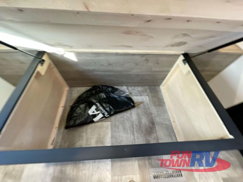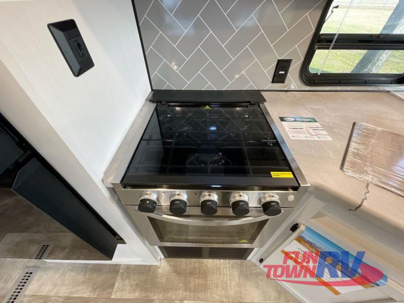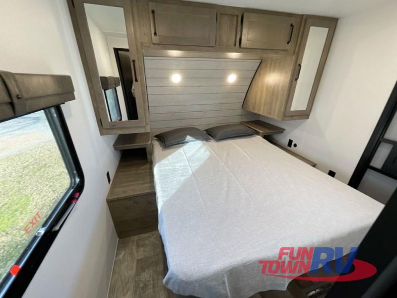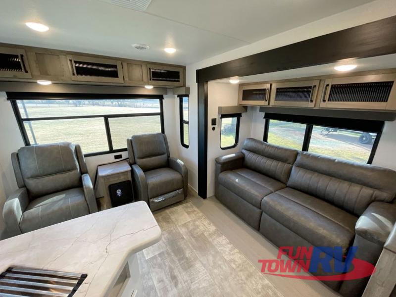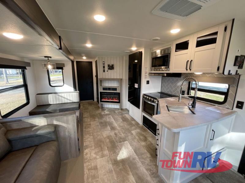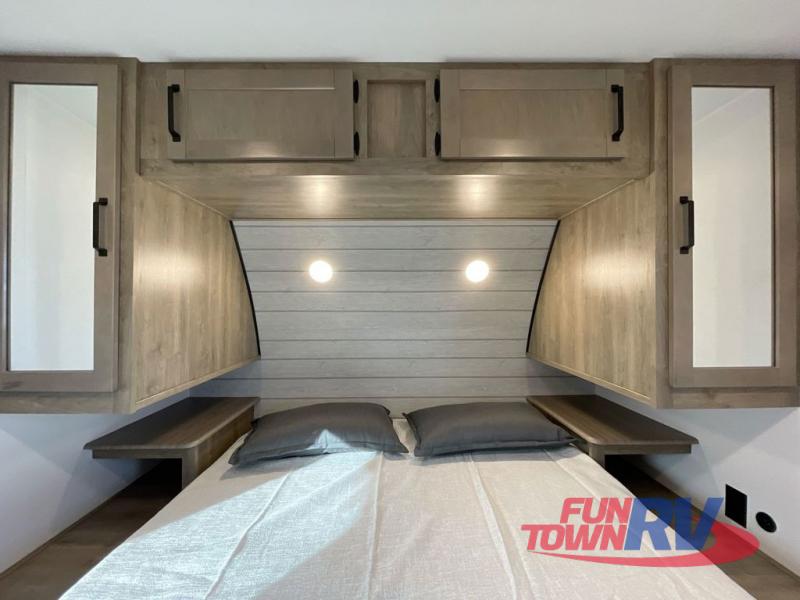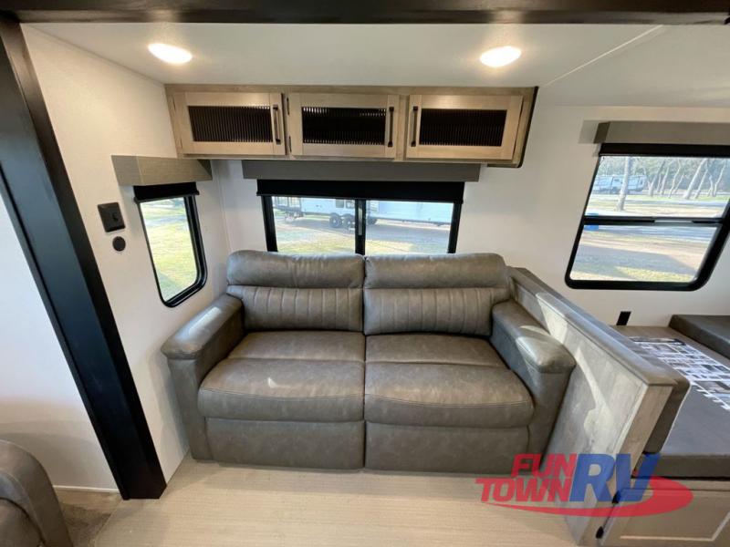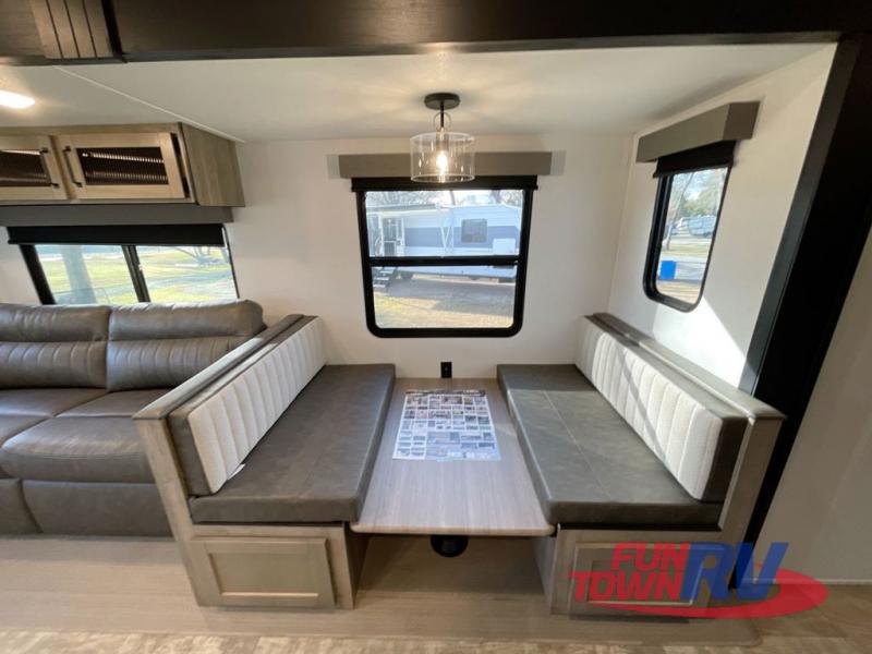Comfort and convenience is found throughout this travel trailer! The set of rear recliners have an end table in between to set your cup of coffee as you read the newspaper, and the sofa is a great place to take an afternoon nap. After you have prepared your best home cooked meal with the stainless steel oven and 12V refrigerator, you can head to the booth dinette then play a card game or two. The full bathroom has a 34" x 34" radius shower to freshen up in before heading to the front private bedroom to enjoy a good night's rest on the queen bed which has shirt closets and nightstands on either side of it.