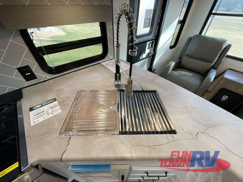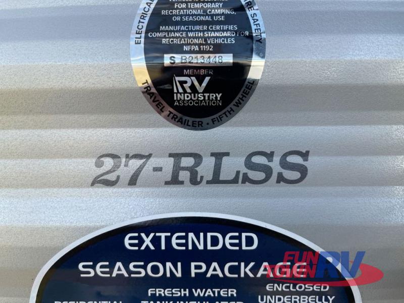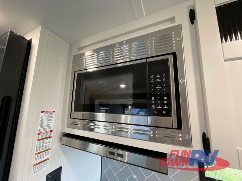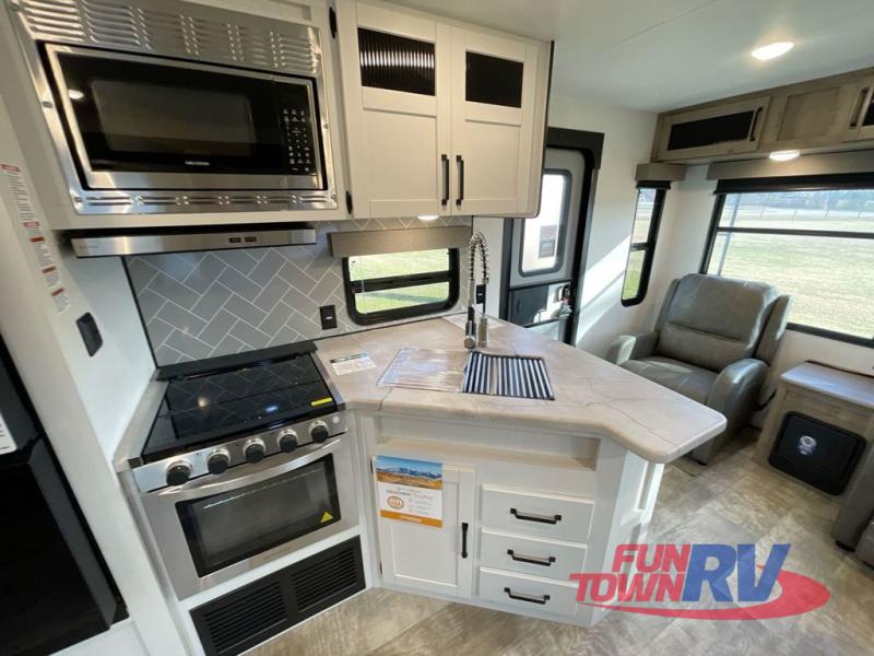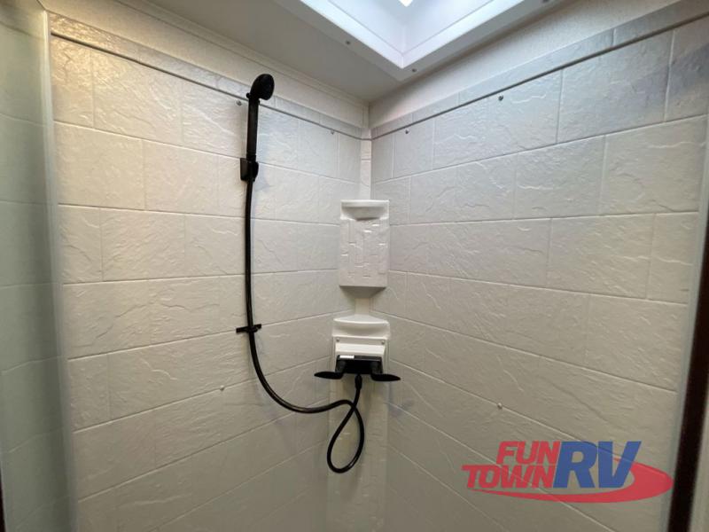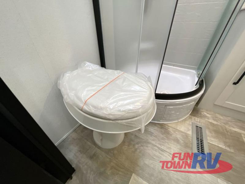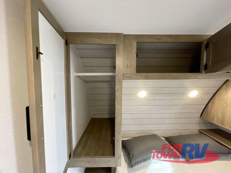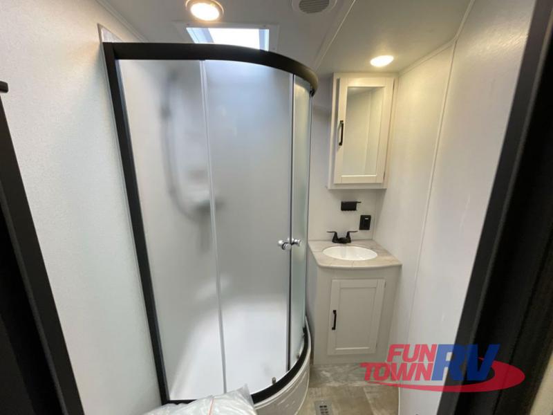 Comfort and convenience is found throughout this travel trailer! The set of rear recliners have an end table in between to set your cup of coffee as you read the newspaper, and the sofa is a great place to take an afternoon nap. After you have prepared your best home cooked meal with the stainless steel oven and 12V refrigerator, you can head to the booth dinette then play a card game or two. The full bathroom has a 34" x 34" radius shower to freshen up in before heading to the front private bedroom to enjoy a good night's rest on the queen bed which has shirt closets and nightstands on either side of it.