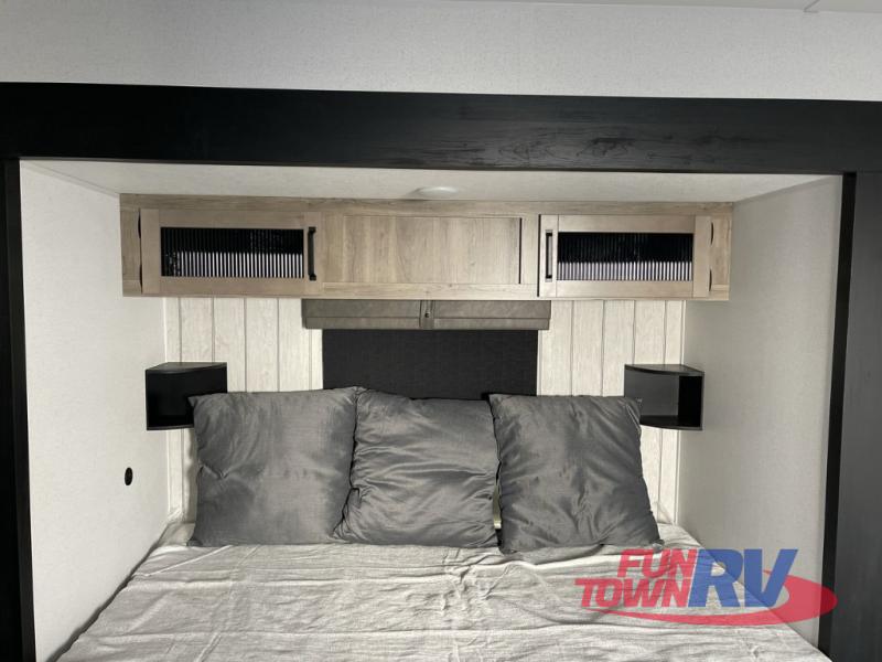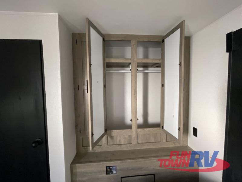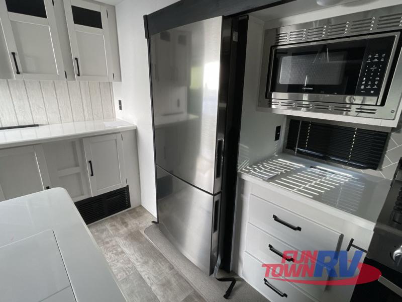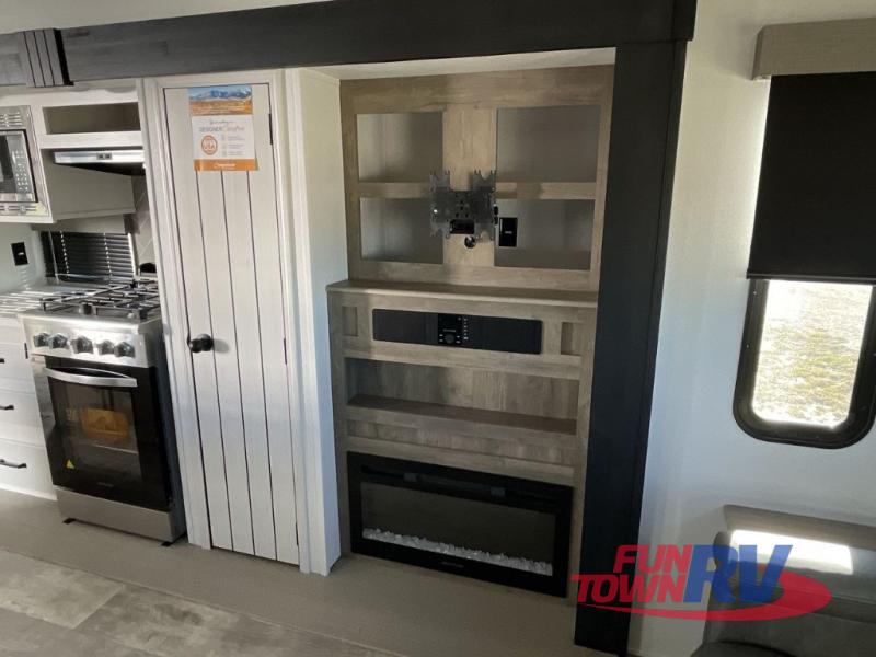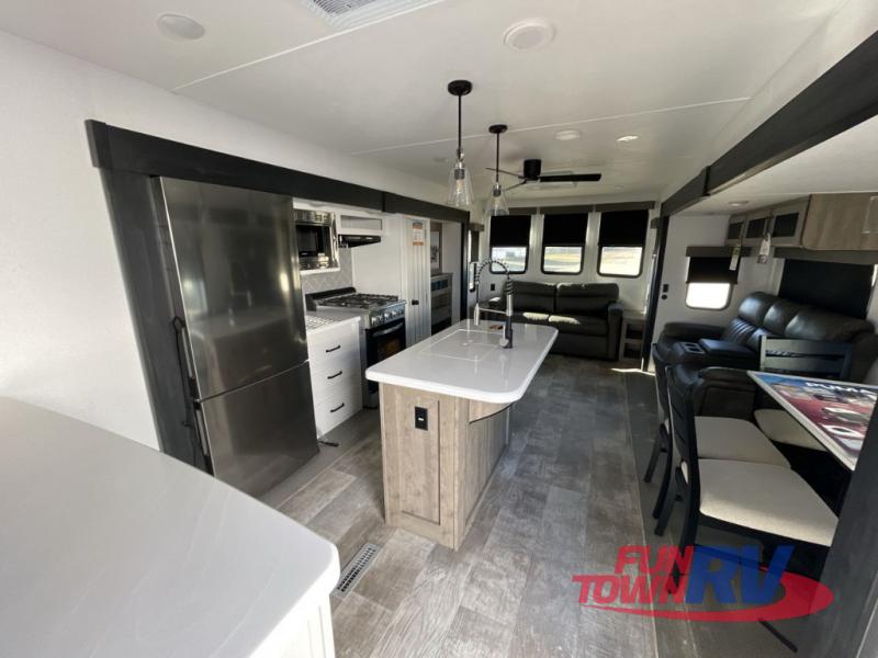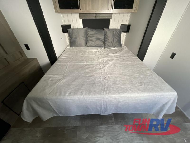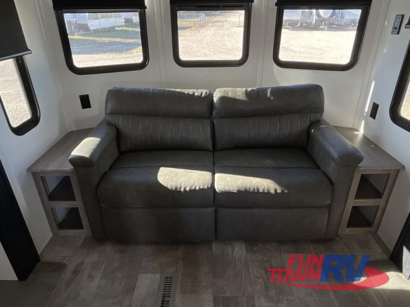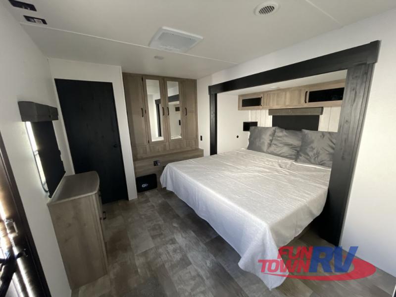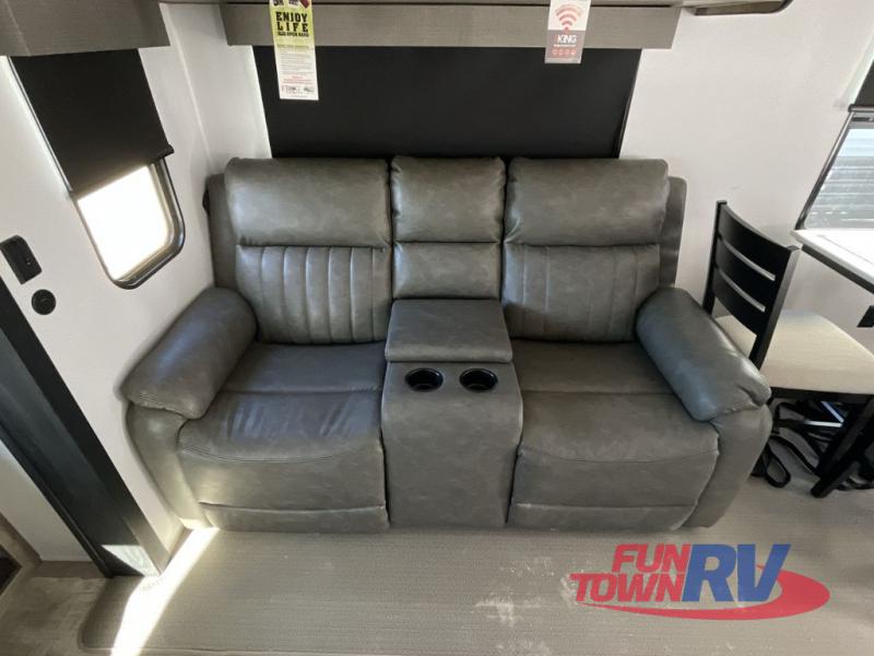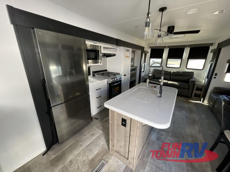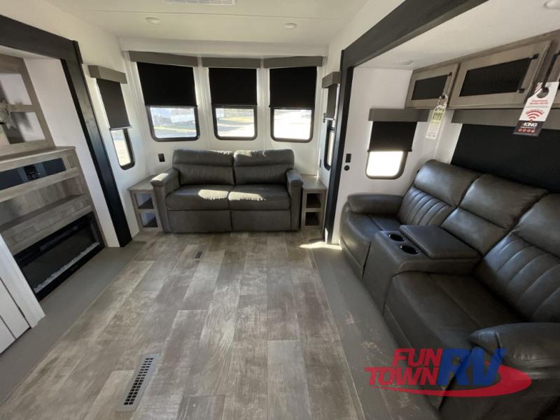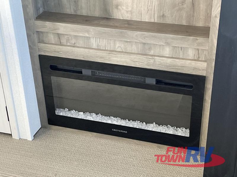 Get ready to enjoy your destination for a weekend or even longer in comfort with the front living and kitchen combined area. The sofa and booth dinette offer relaxing and dining space as well as sleeping space when needed. There are two recliners you are sure to love, as well as a fireplace to make it feel more like home. There is a kitchen island to prepare and serve meals from and wash the dishes. The kitchen offers full amenities including a stainless steel refrigerator and plenty of storage. You will surely enjoy the natural lighting from the patio door, and the second entry/exit is located in the rear private bedroom where you can sleep like a royalty on the king bed. There is also a closet with the option to add washer and dryer prep if you choose!