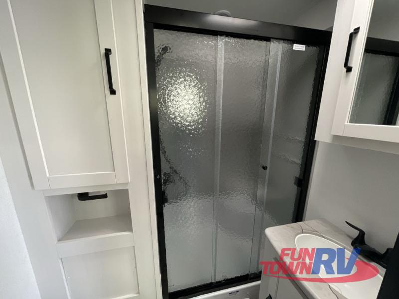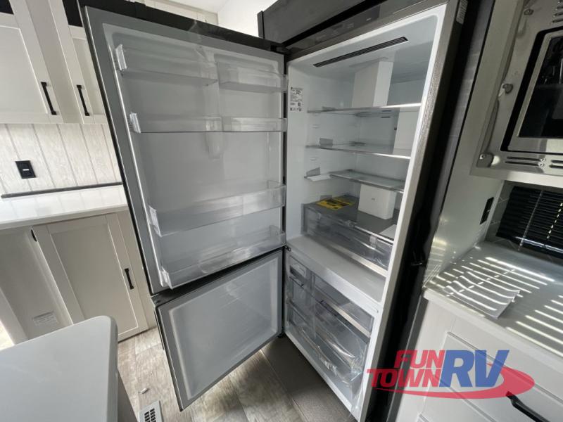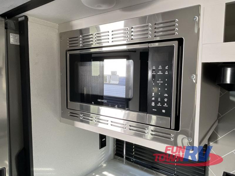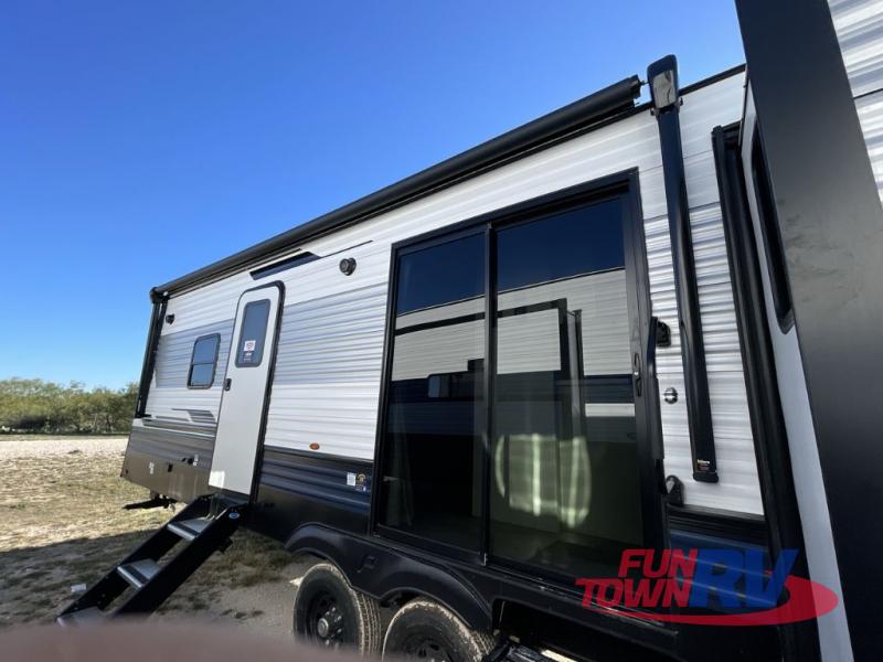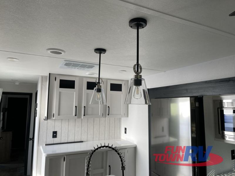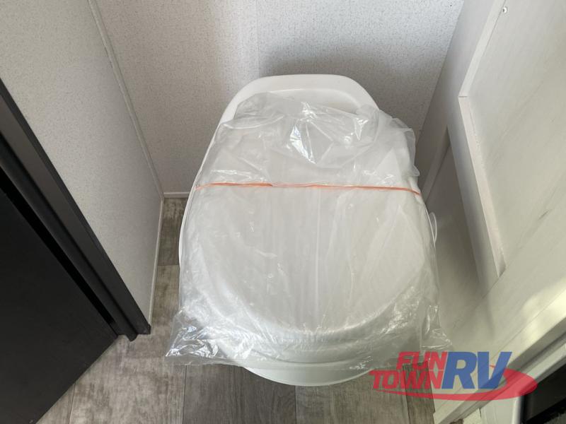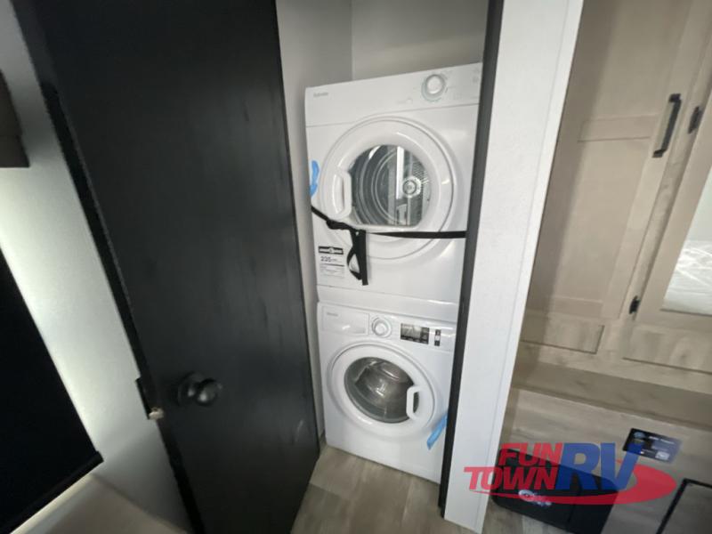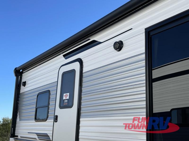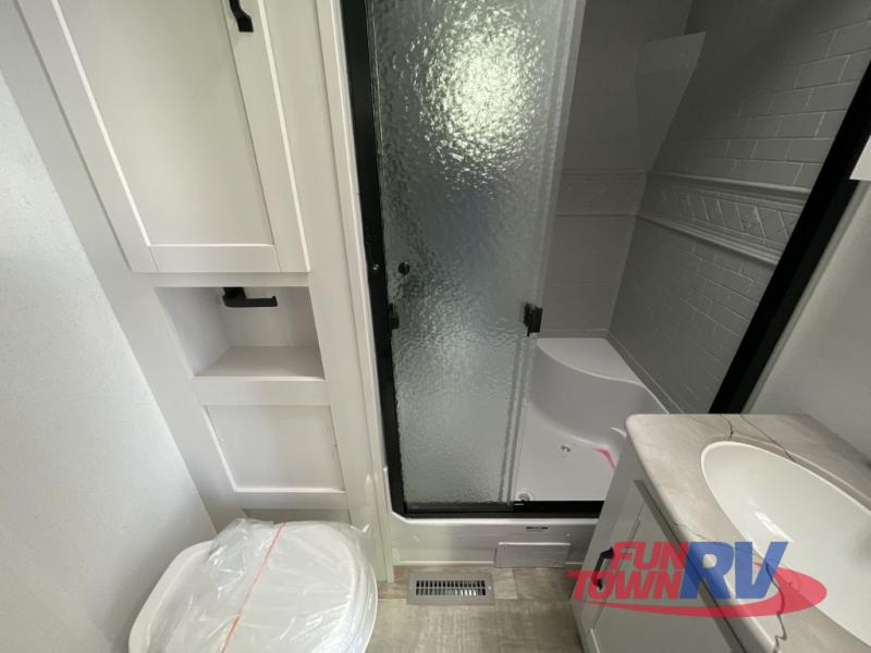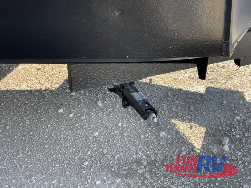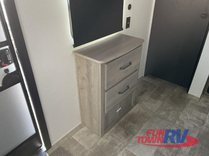Get ready to enjoy your destination for a weekend or even longer in comfort with the front living and kitchen combined area. The sofa and booth dinette offer relaxing and dining space as well as sleeping space when needed. There are two recliners you are sure to love, as well as a fireplace to make it feel more like home. There is a kitchen island to prepare and serve meals from and wash the dishes. The kitchen offers full amenities including a stainless steel refrigerator and plenty of storage. You will surely enjoy the natural lighting from the patio door, and the second entry/exit is located in the rear private bedroom where you can sleep like a royalty on the king bed. There is also a closet with the option to add washer and dryer prep if you choose!
