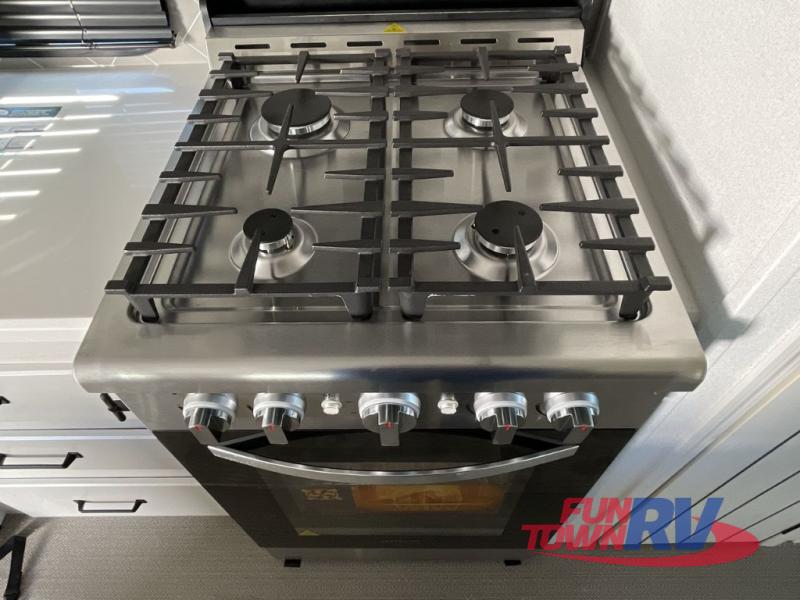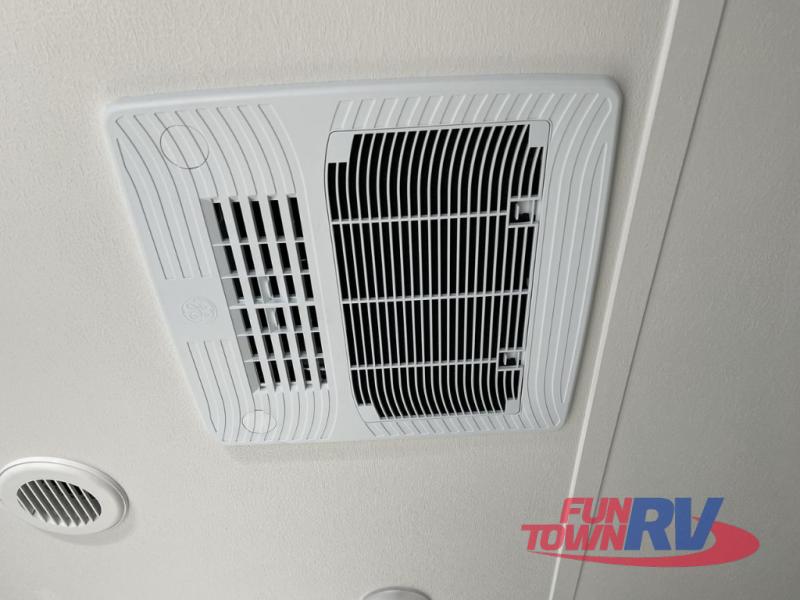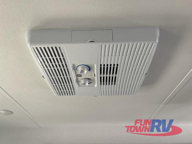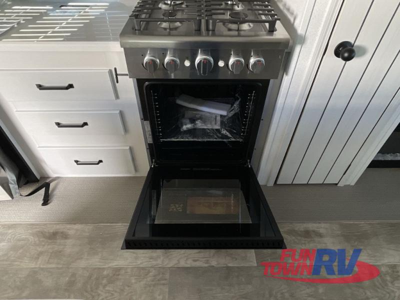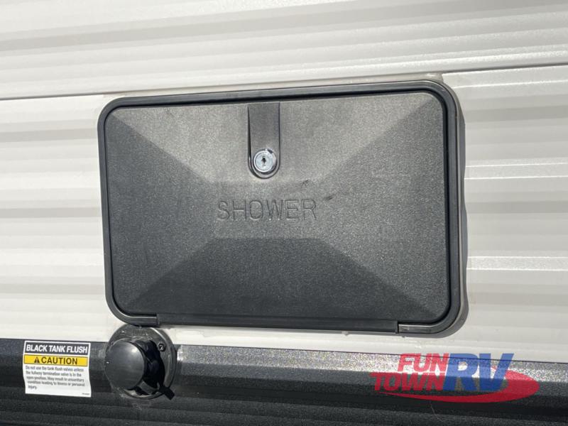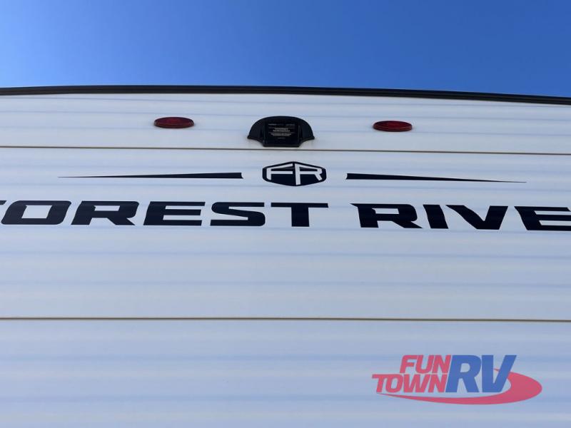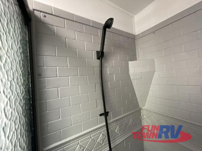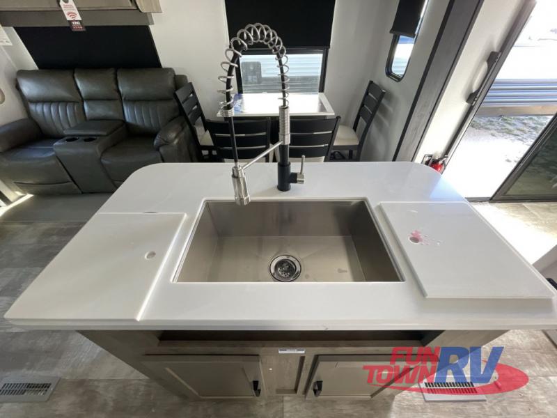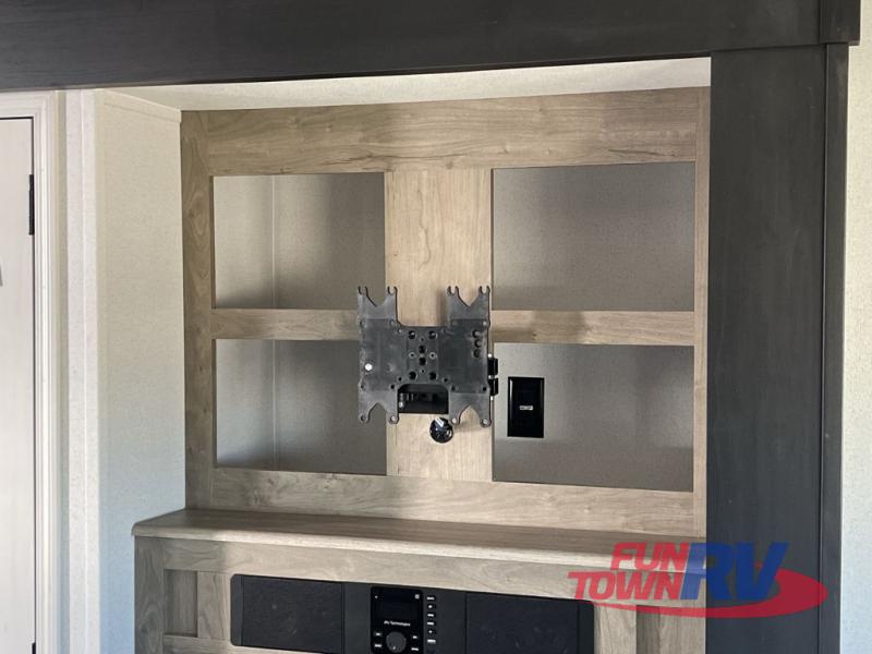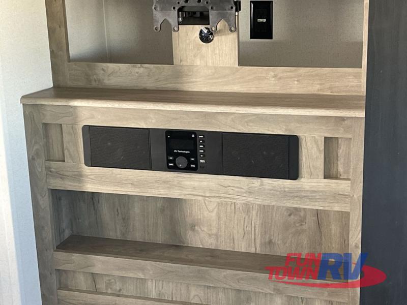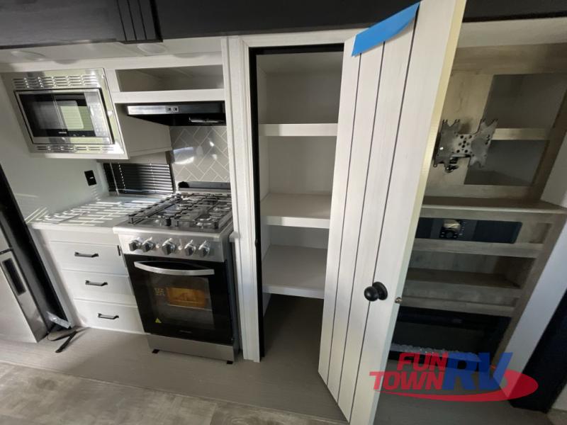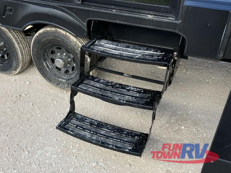 Get ready to enjoy your destination for a weekend or even longer in comfort with the front living and kitchen combined area. The sofa and booth dinette offer relaxing and dining space as well as sleeping space when needed. There are two recliners you are sure to love, as well as a fireplace to make it feel more like home. There is a kitchen island to prepare and serve meals from and wash the dishes. The kitchen offers full amenities including a stainless steel refrigerator and plenty of storage. You will surely enjoy the natural lighting from the patio door, and the second entry/exit is located in the rear private bedroom where you can sleep like a royalty on the king bed. There is also a closet with the option to add washer and dryer prep if you choose!