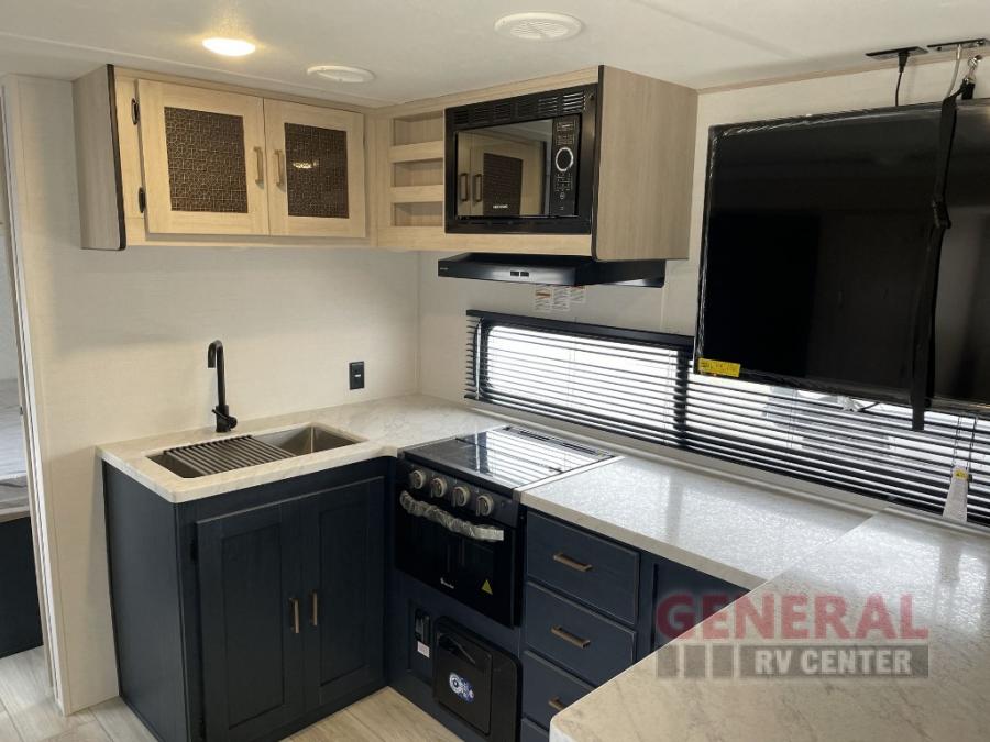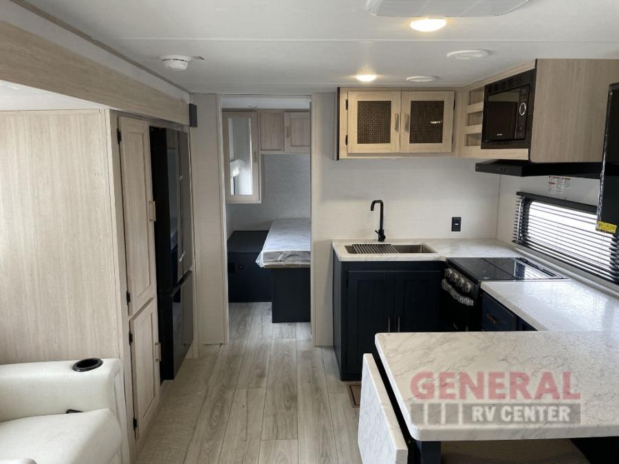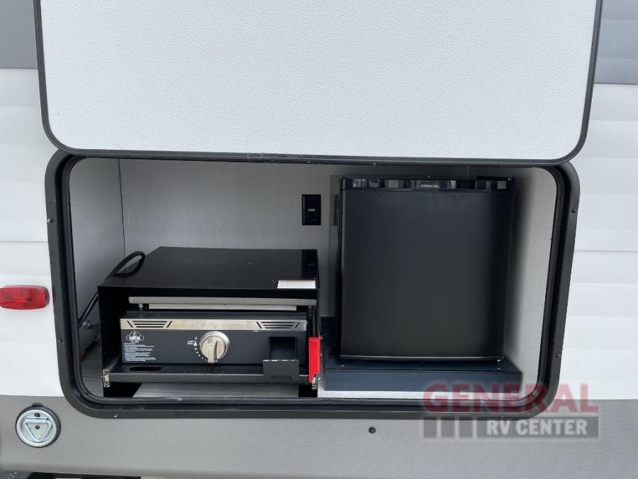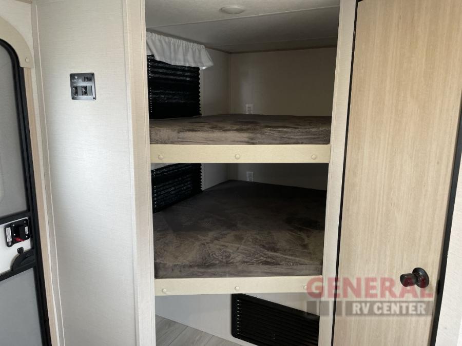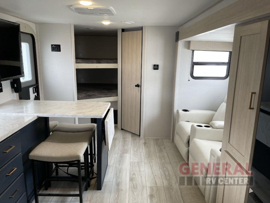Head to your local state park in this spacious travel trailer! The exterior kitchen is sure to be a big bonus with the chef of your group, and they'll also find a fully-equipped interior kitchen as well. An L-shaped counter with two chairs provides a place to enjoy your morning coffee at, or you may find yourselves on the theater seat within the large slide out. The French door refrigerator and pantry is also found here and can hold all your food for the week. You'll feel right at home in the front private bedroom that includes a queen bed, dual wardrobes, and an overhead cabinet for even more storage, while your guests take the double-size bunks in the back!