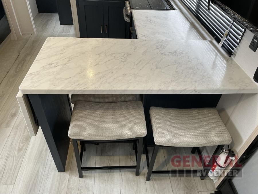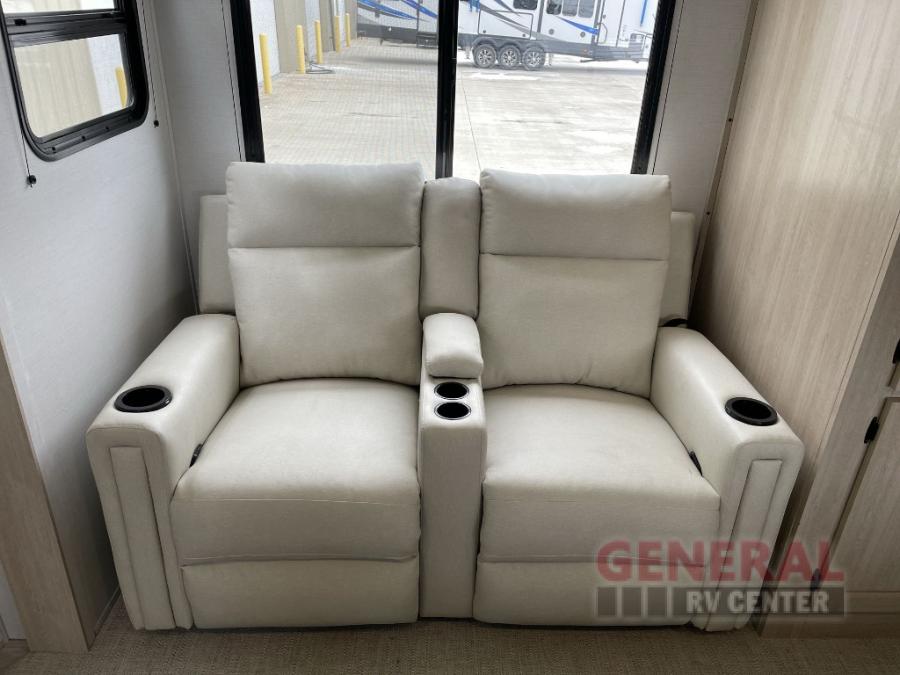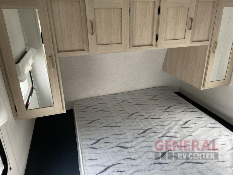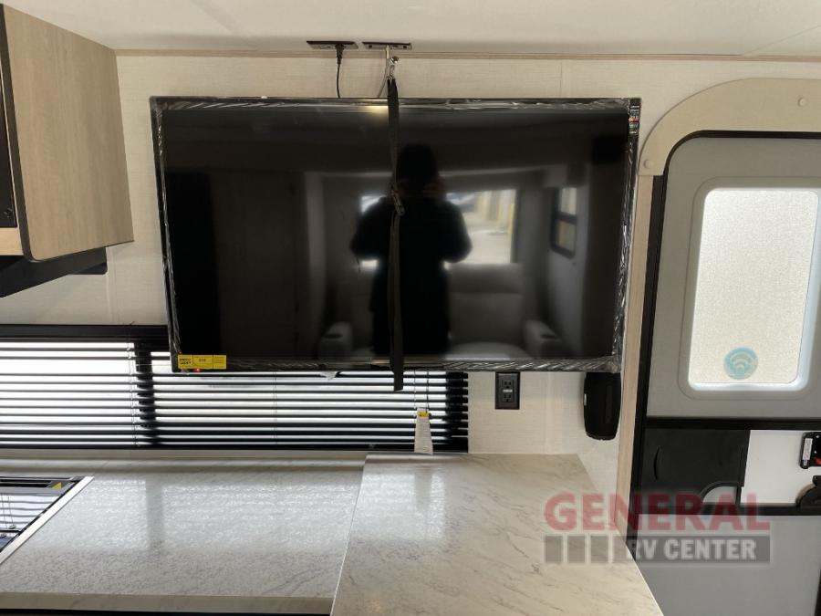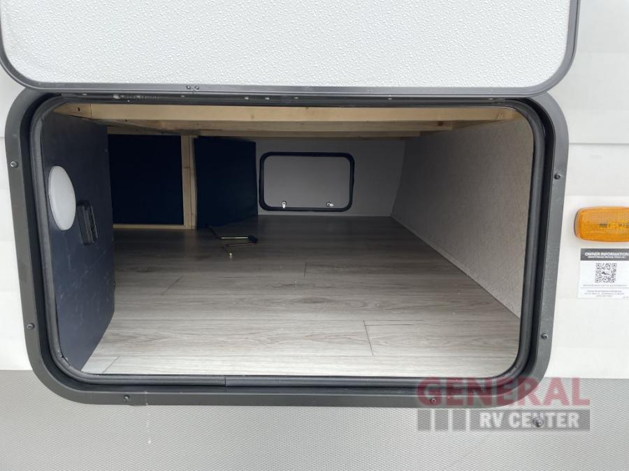 Head to your local state park in this spacious travel trailer! The exterior kitchen is sure to be a big bonus with the chef of your group, and they'll also find a fully-equipped interior kitchen as well. An L-shaped counter with two chairs provides a place to enjoy your morning coffee at, or you may find yourselves on the theater seat within the large slide out. The French door refrigerator and pantry is also found here and can hold all your food for the week. You'll feel right at home in the front private bedroom that includes a queen bed, dual wardrobes, and an overhead cabinet for even more storage, while your guests take the double-size bunks in the back!