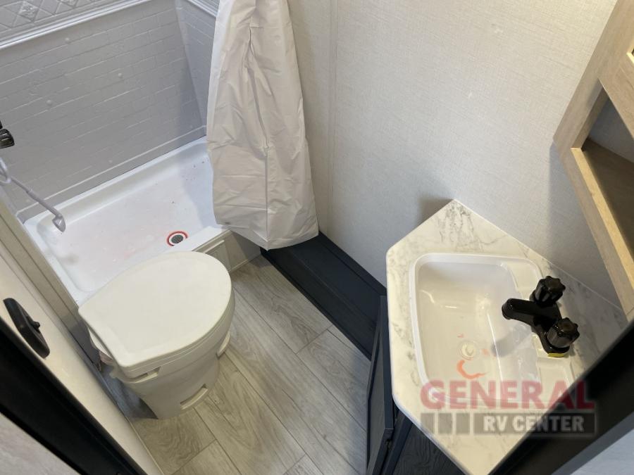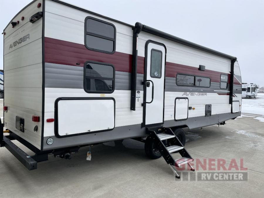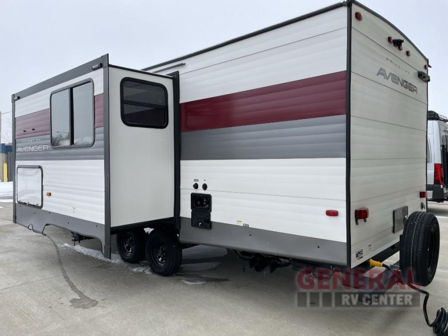 With any Avenger travel trailer by Prime Time, the exterior includes an aerodynamic smooth front metal, a diamond plate front rock guard for protection on the road, and four stabilizer jacks to keep your unit secure. There is a fully walkable roof plus an enclosed and heated underbelly that will help extend your camping season. The interior offers a 15,000 BTU air conditioner for the perfect climate inside, in-floor ducted heat, a systems monitor panel, and a Winegard 360+ antenna with Wi-Fi prep that will give you the option to stay connected as you camp. Each model also includes seamless Carefree Congoleum flooring, kitchen backsplash, shower pans in all models, and pleated nightshades throughout to name a few interior comforts!