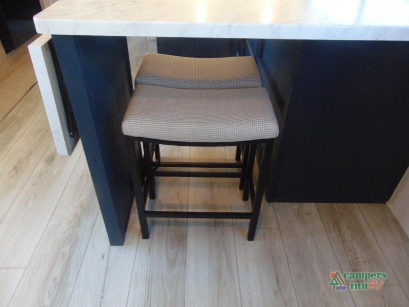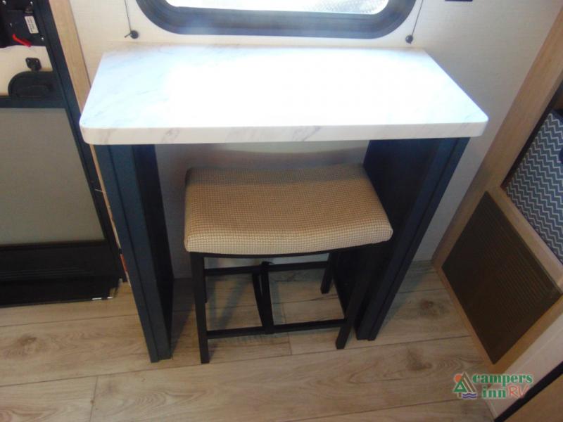 Head to your local state park in this spacious travel trailer! Once you arrive at the campground, you can grab a cold drink from the exterior refrigerator, then head inside to make lunch. An L-shaped counter with two chairs provides a place to enjoy your morning coffee at, or you may find yourselves on the theater seat within the large slide out. The French door refrigerator and pantry is also found here and can hold all your food for the week. You'll feel right at home in the front private bedroom that includes a queen bed, dual wardrobes, and an overhead cabinet for even more storage. This model also includes washer and dryer prep if you choose to add those appliances!