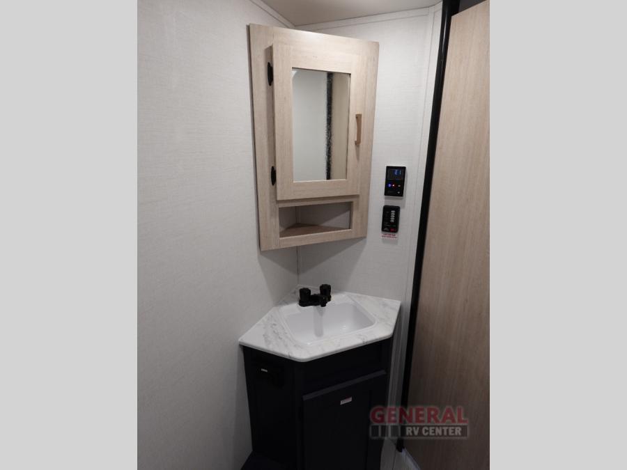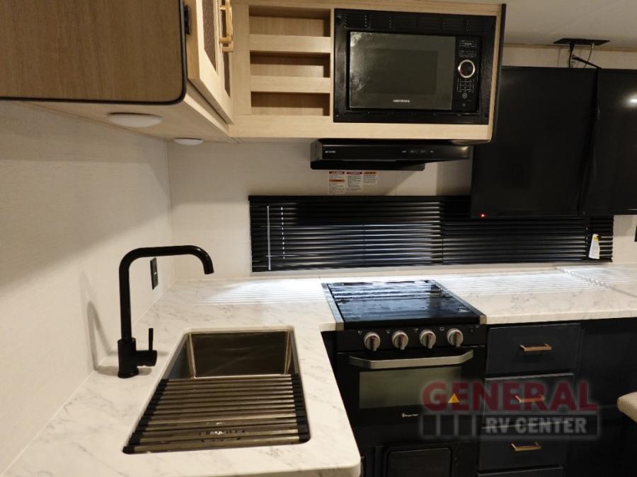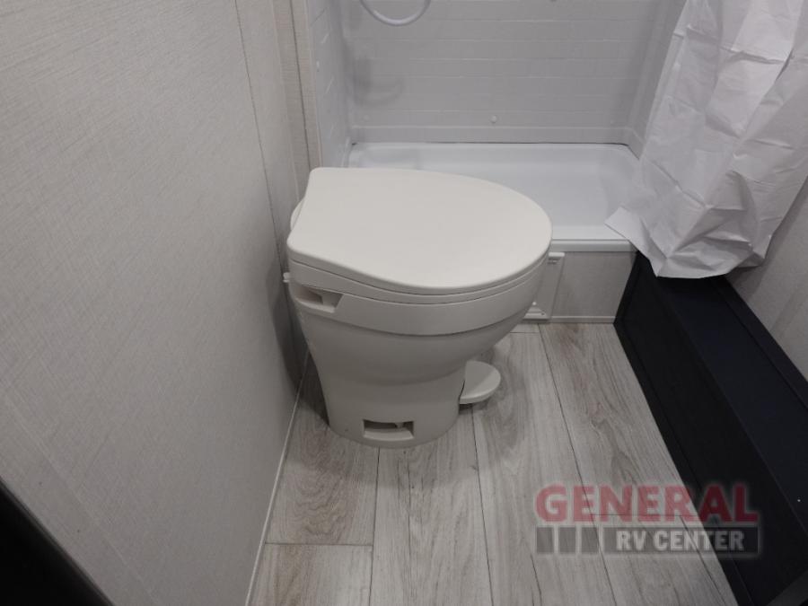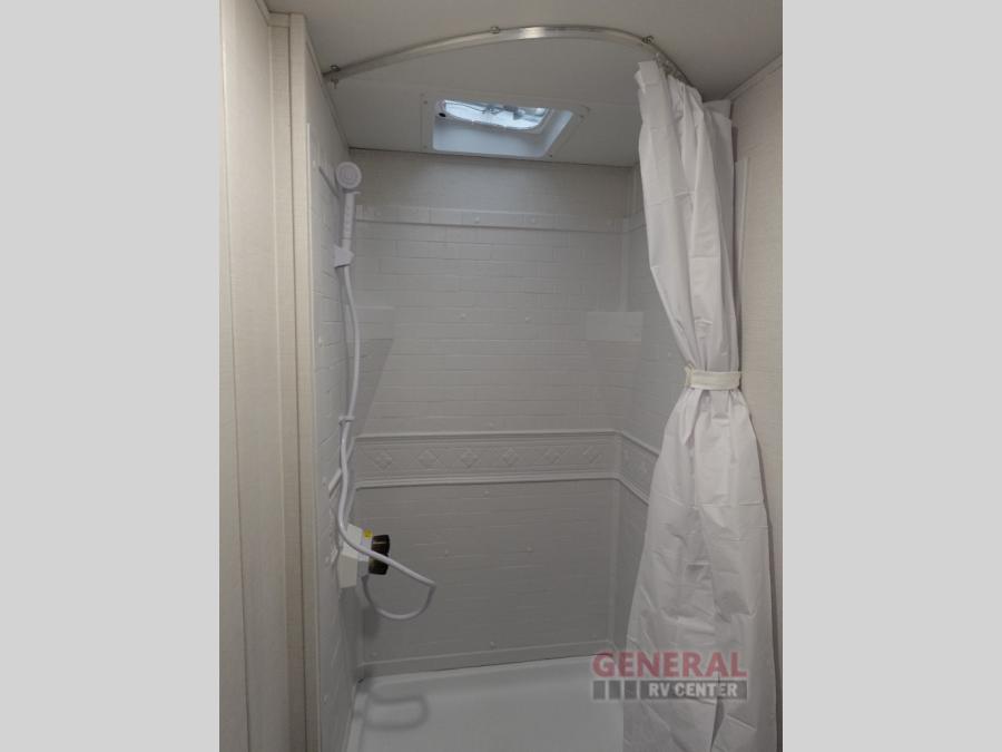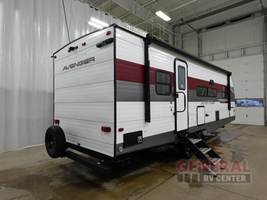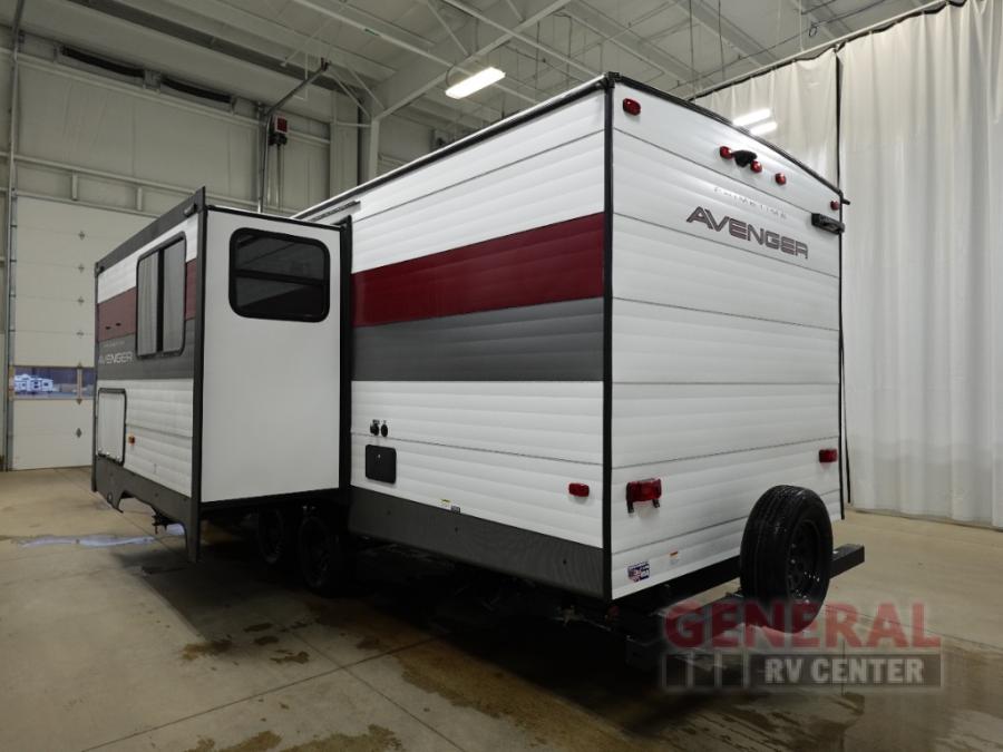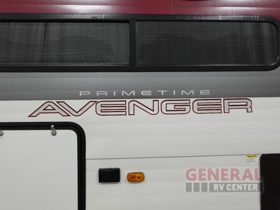With any Avenger travel trailer by Prime Time, the exterior includes an aerodynamic smooth front metal, a diamond plate front rock guard for protection on the road, and four stabilizer jacks to keep your unit secure. There is a fully walkable roof plus an enclosed and heated underbelly that will help extend your camping season. The interior offers a 15,000 BTU air conditioner for the perfect climate inside, in-floor ducted heat, a systems monitor panel, and a Winegard 360+ antenna with Wi-Fi prep that will give you the option to stay connected as you camp. Each model also includes seamless Carefree Congoleum flooring, kitchen backsplash, shower pans in all models, and pleated nightshades throughout to name a few interior comforts!