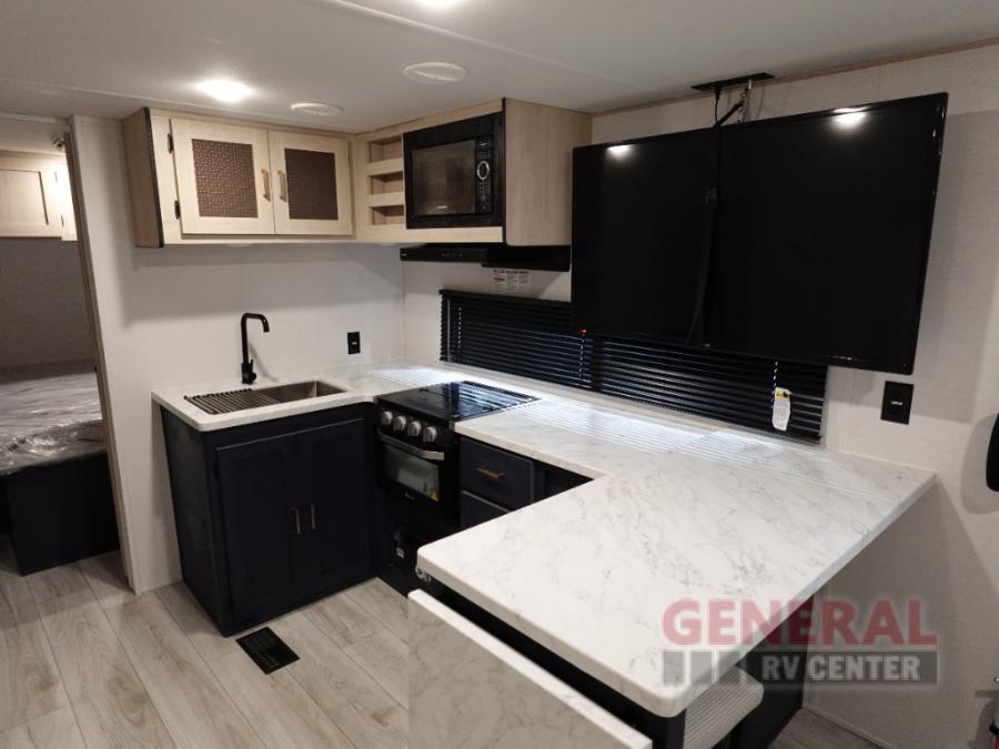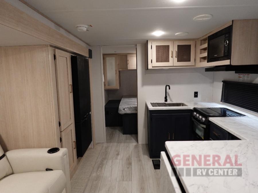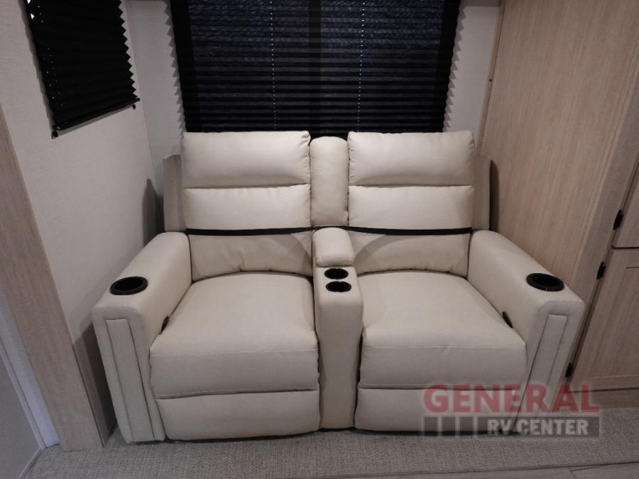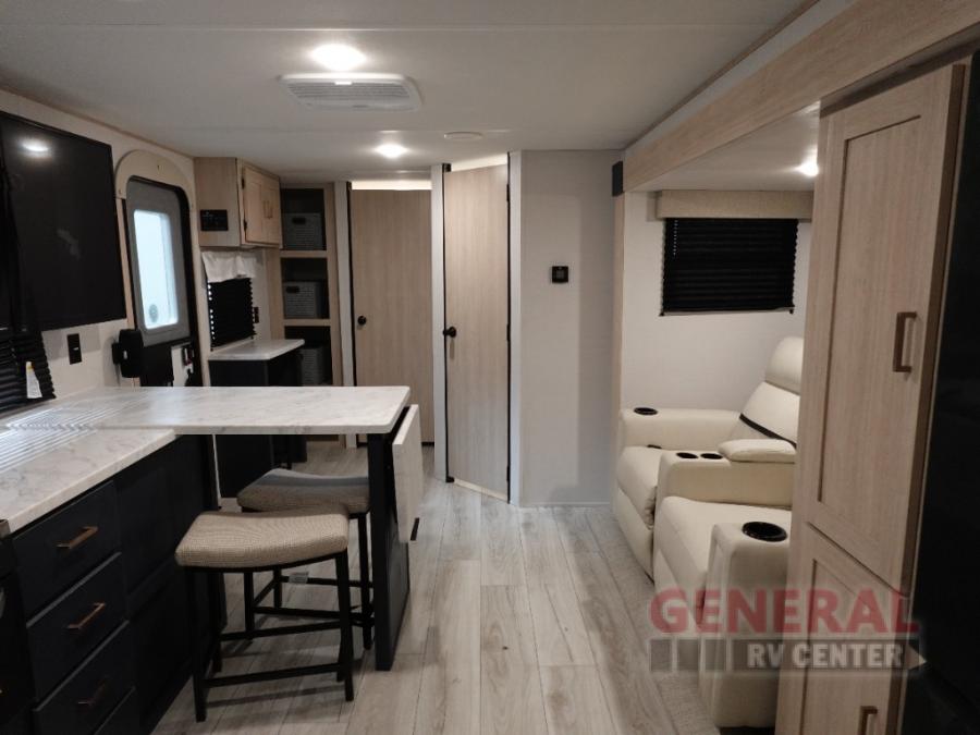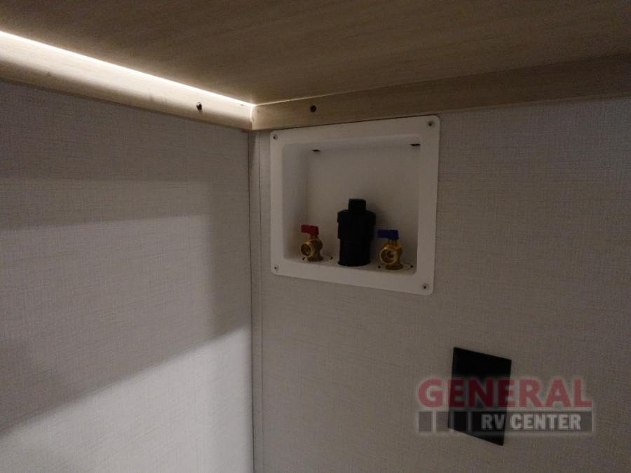 Head to your local state park in this spacious travel trailer! Once you arrive at the campground, you can grab a cold drink from the exterior refrigerator, then head inside to make lunch. An L-shaped counter with two chairs provides a place to enjoy your morning coffee at, or you may find yourselves on the theater seat within the large slide out. The French door refrigerator and pantry is also found here and can hold all your food for the week. You'll feel right at home in the front private bedroom that includes a queen bed, dual wardrobes, and an overhead cabinet for even more storage. This model also includes washer and dryer prep if you choose to add those appliances!