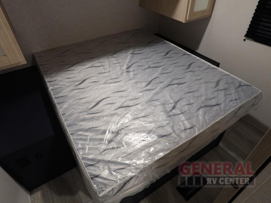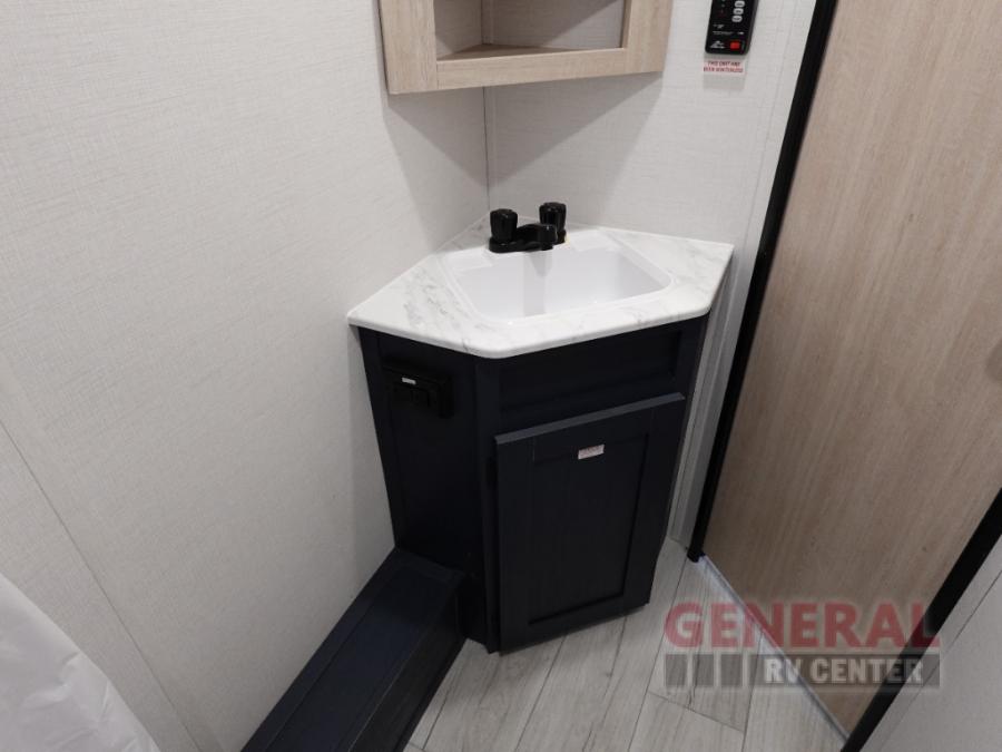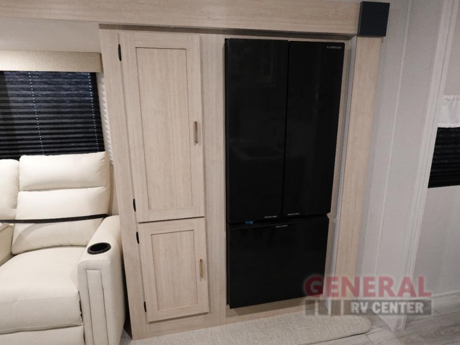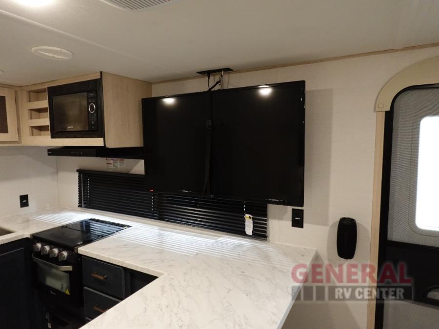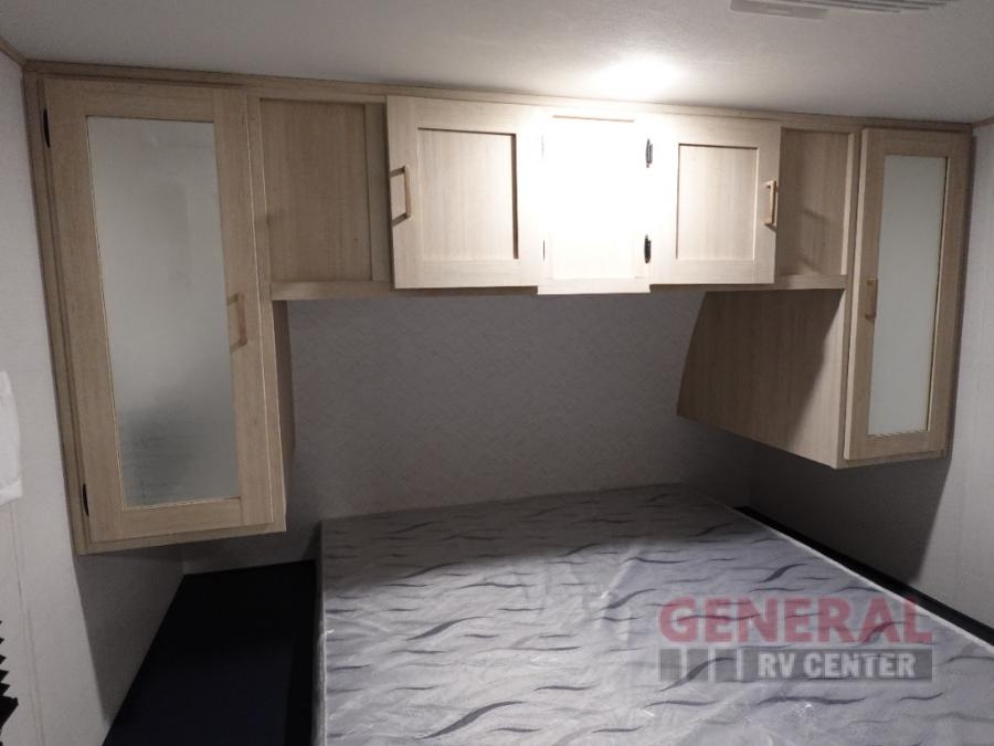 Head to your local state park in this spacious travel trailer! Once you arrive at the campground, you can grab a cold drink from the exterior refrigerator, then head inside to make lunch. An L-shaped counter with two chairs provides a place to enjoy your morning coffee at, or you may find yourselves on the theater seat within the large slide out. The French door refrigerator and pantry is also found here and can hold all your food for the week. You'll feel right at home in the front private bedroom that includes a queen bed, dual wardrobes, and an overhead cabinet for even more storage. This model also includes washer and dryer prep if you choose to add those appliances!