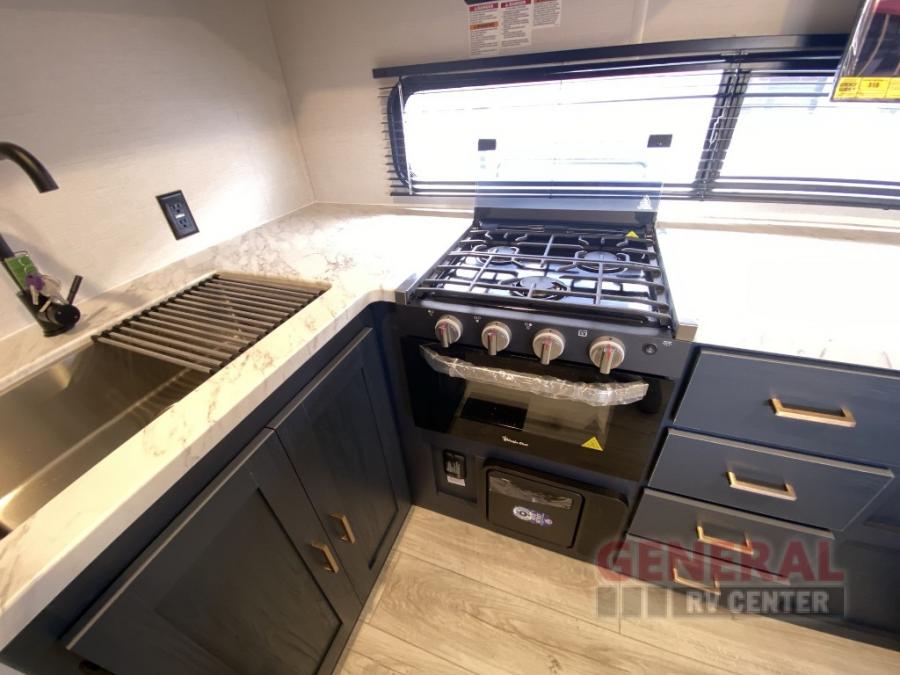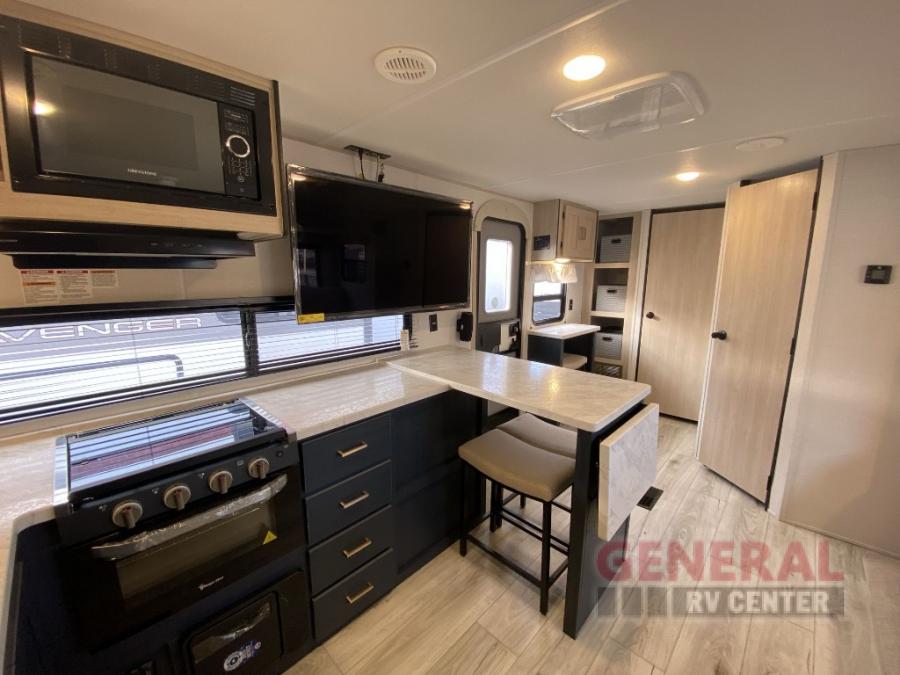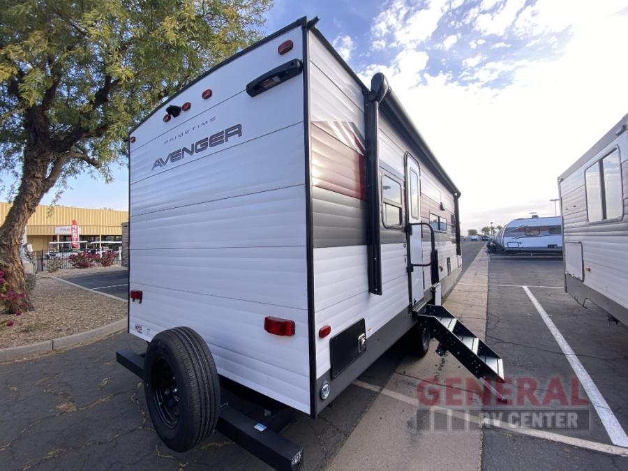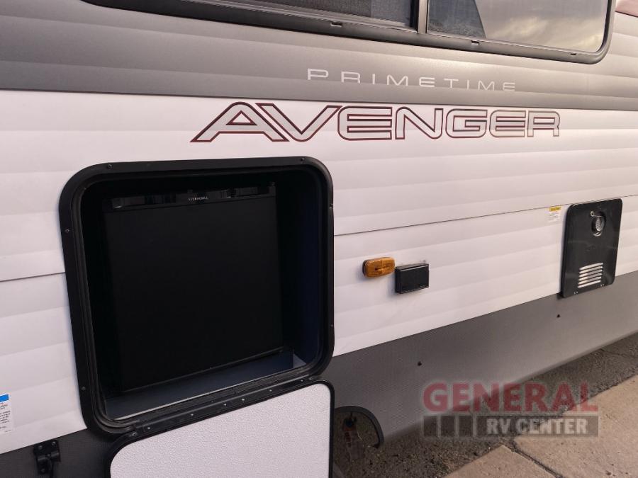 With any Avenger travel trailer by Prime Time, the exterior includes an aerodynamic smooth front metal, a diamond plate front rock guard for protection on the road, and four stabilizer jacks to keep your unit secure. There is a fully walkable roof plus an enclosed and heated underbelly that will help extend your camping season. The interior offers a 15,000 BTU air conditioner for the perfect climate inside, in-floor ducted heat, a systems monitor panel, and a Winegard 360+ antenna with Wi-Fi prep that will give you the option to stay connected as you camp. Each model also includes seamless Carefree Congoleum flooring, kitchen backsplash, shower pans in all models, and pleated nightshades throughout to name a few interior comforts!