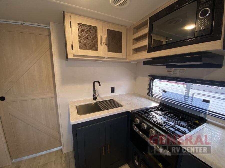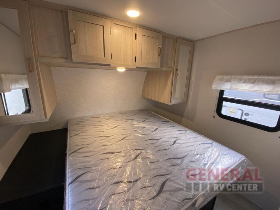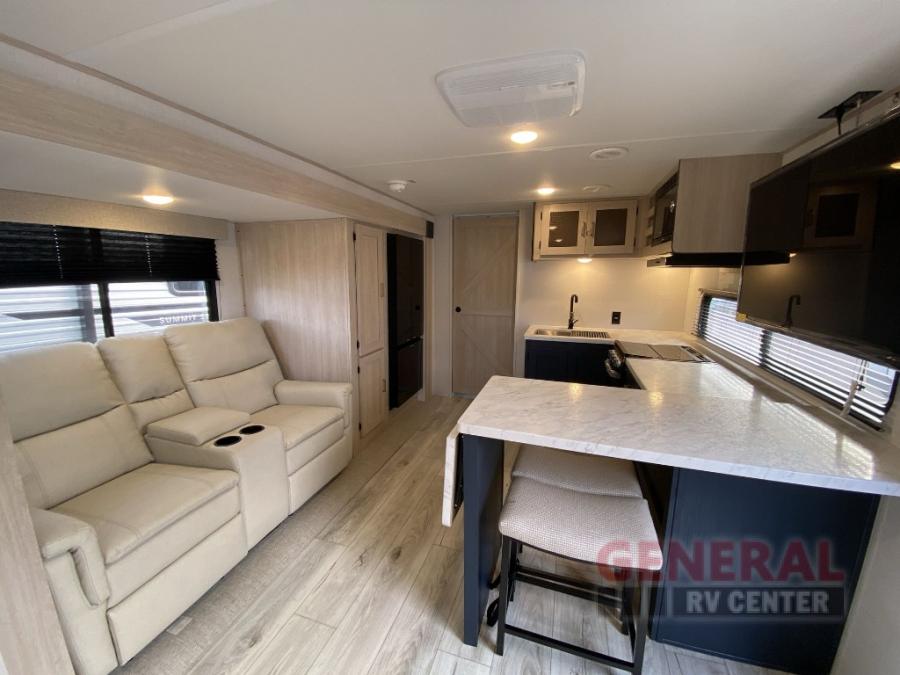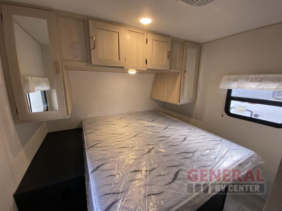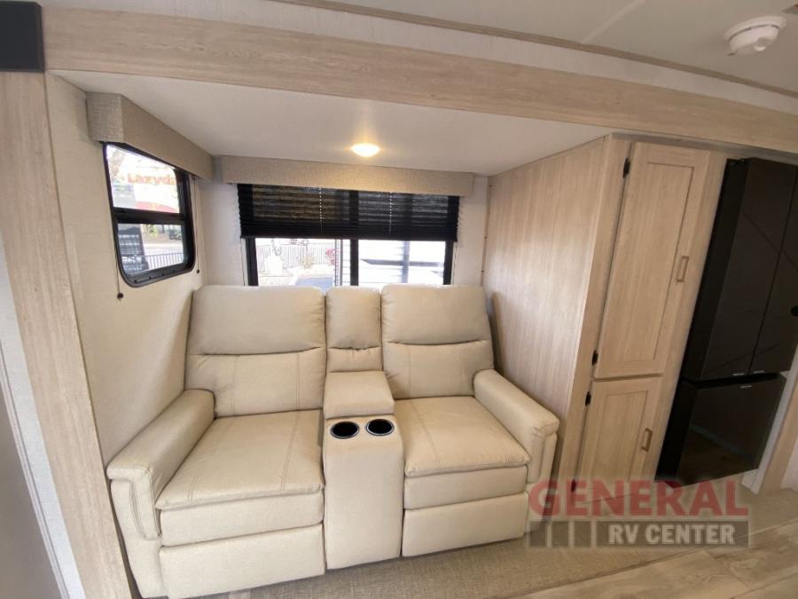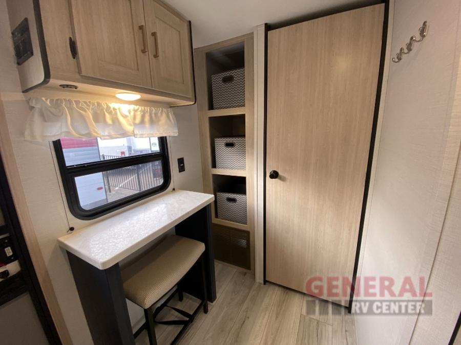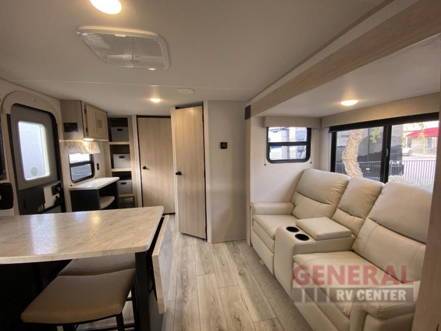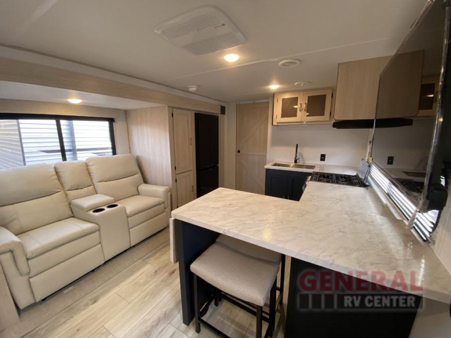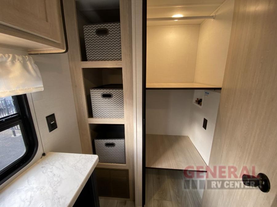 Head to your local state park in this spacious travel trailer! Once you arrive at the campground, you can grab a cold drink from the exterior refrigerator, then head inside to make lunch. An L-shaped counter with two chairs provides a place to enjoy your morning coffee at, or you may find yourselves on the theater seat within the large slide out. The French door refrigerator and pantry is also found here and can hold all your food for the week. You'll feel right at home in the front private bedroom that includes a queen bed, dual wardrobes, and an overhead cabinet for even more storage.