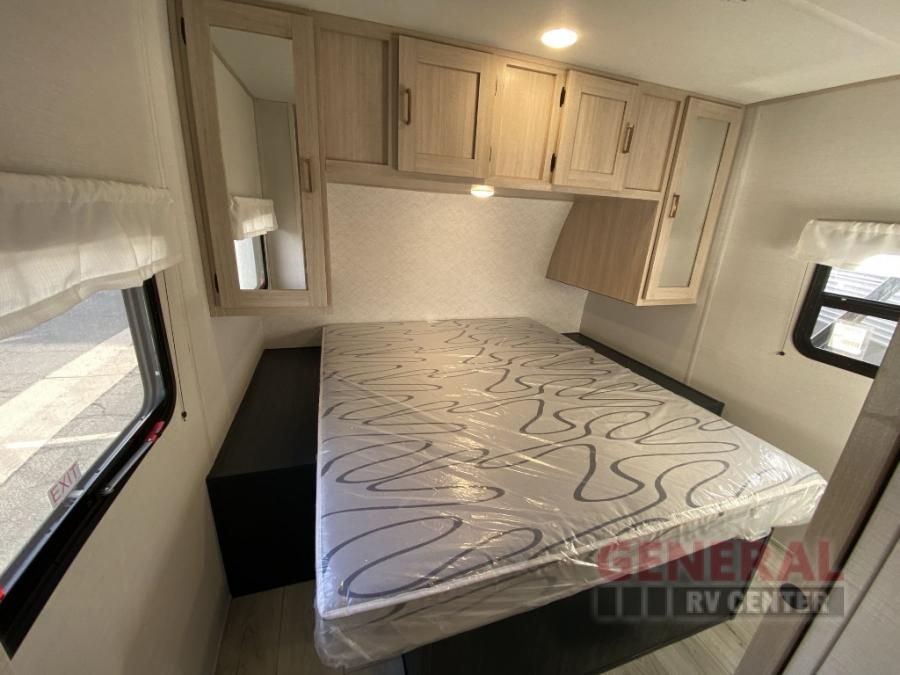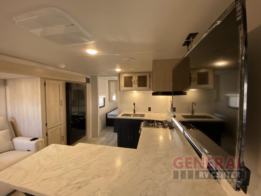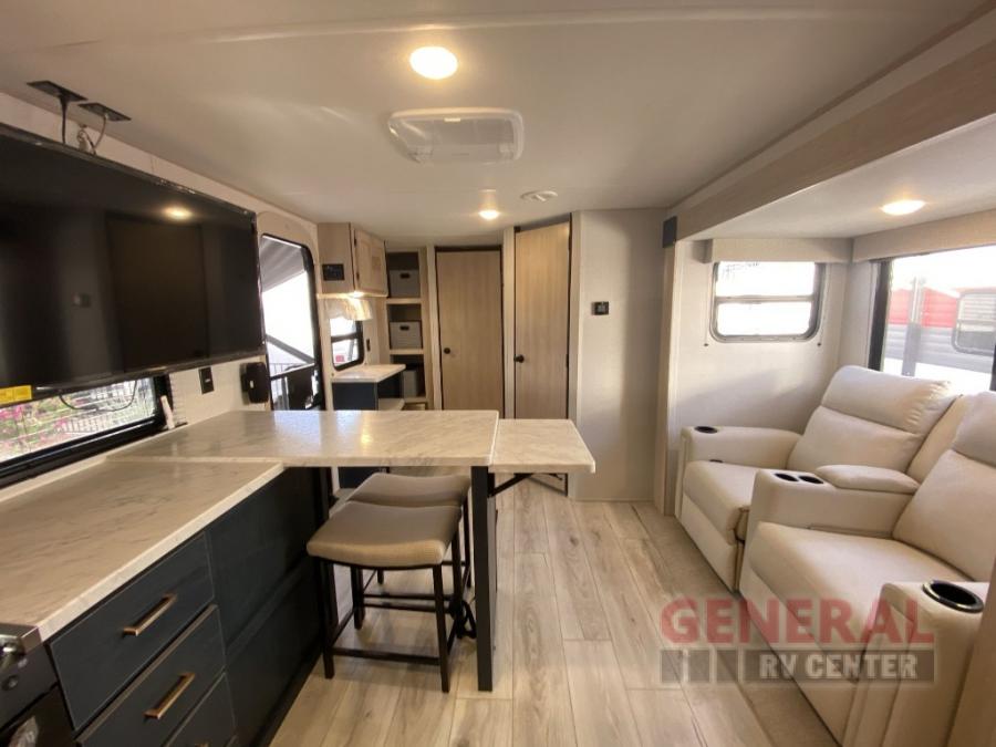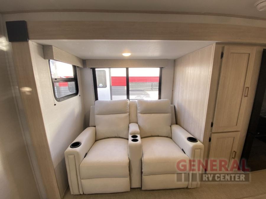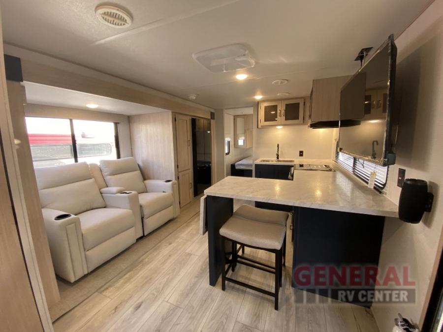 Head to your local state park in this spacious travel trailer! Once you arrive at the campground, you can grab a cold drink from the exterior refrigerator, then head inside to make lunch. An L-shaped counter with two chairs provides a place to enjoy your morning coffee at, or you may find yourselves on the theater seat within the large slide out. The French door refrigerator and pantry is also found here and can hold all your food for the week. You'll feel right at home in the front private bedroom that includes a queen bed, dual wardrobes, and an overhead cabinet for even more storage.