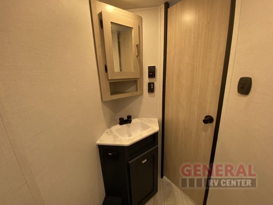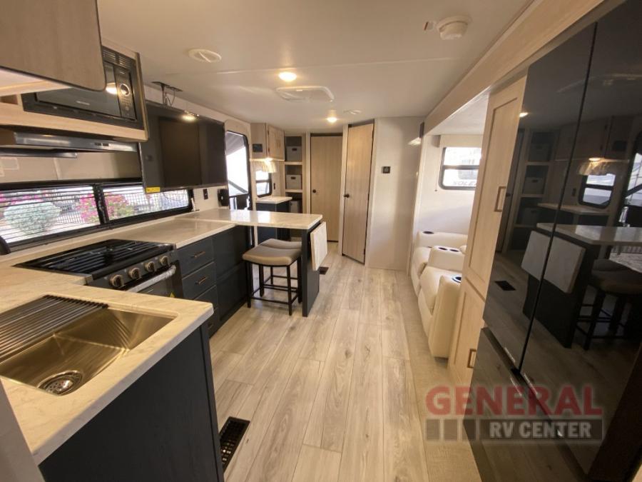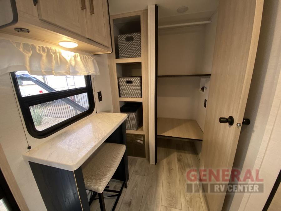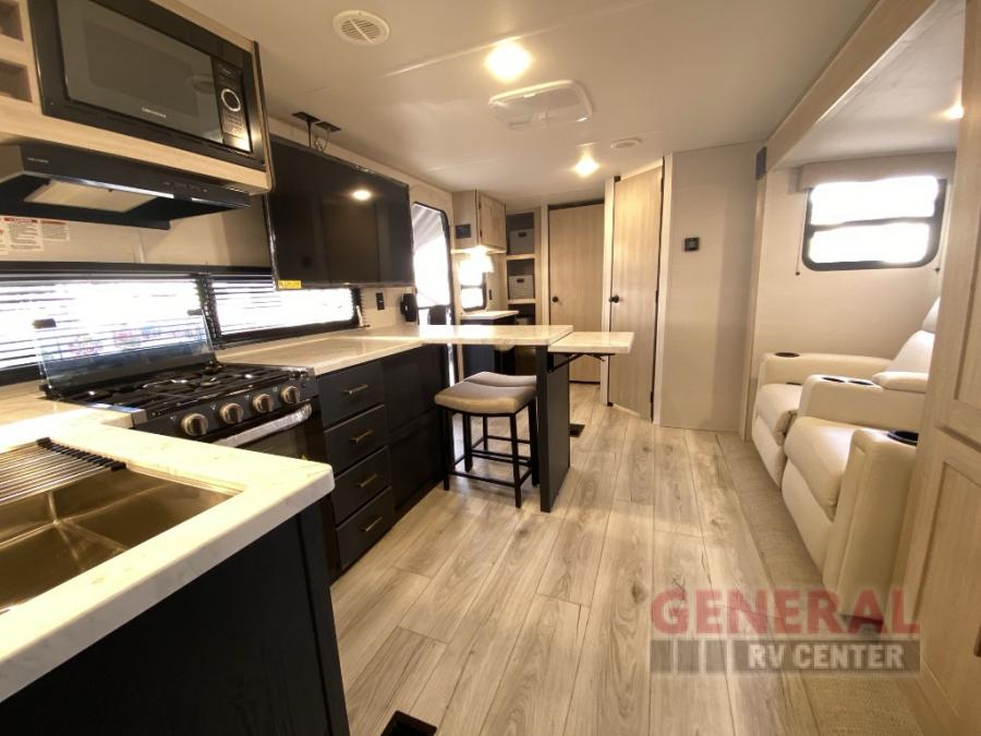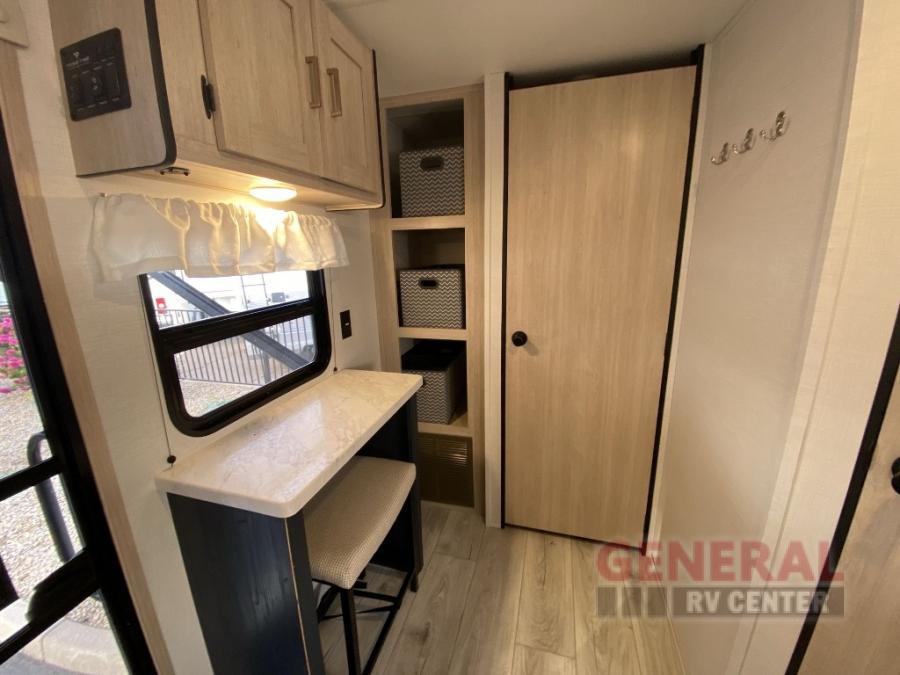Head to your local state park in this spacious travel trailer! Once you arrive at the campground, you can grab a cold drink from the exterior refrigerator, then head inside to make lunch. An L-shaped counter with two chairs provides a place to enjoy your morning coffee at, or you may find yourselves on the theater seat within the large slide out. The French door refrigerator and pantry is also found here and can hold all your food for the week. You'll feel right at home in the front private bedroom that includes a queen bed, dual wardrobes, and an overhead cabinet for even more storage.