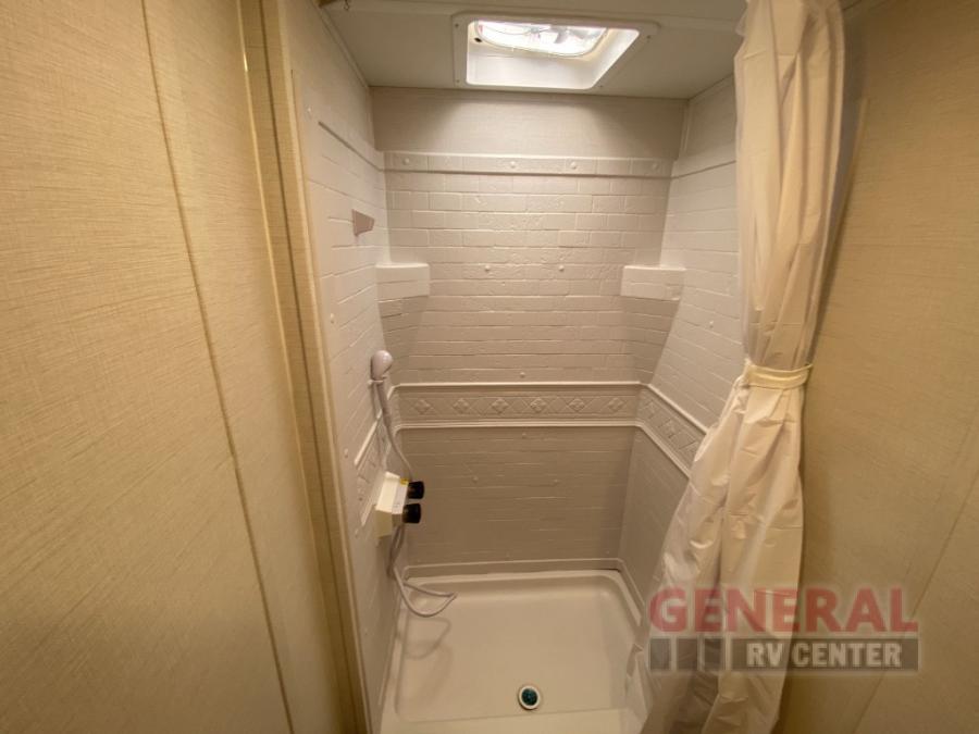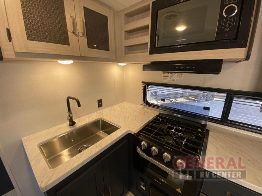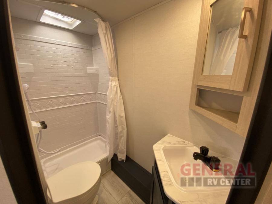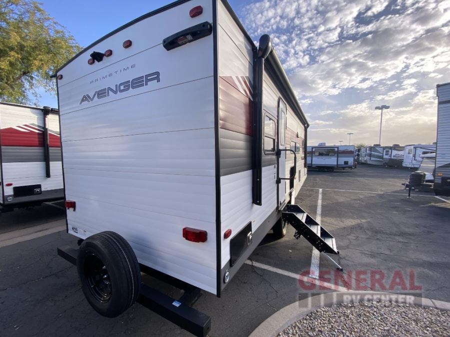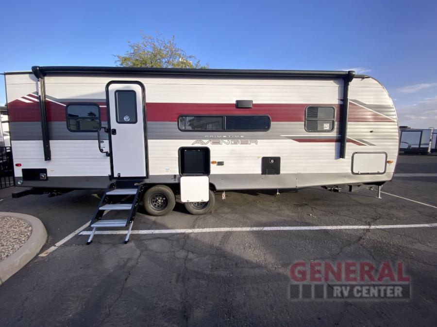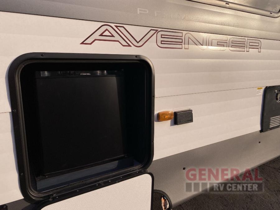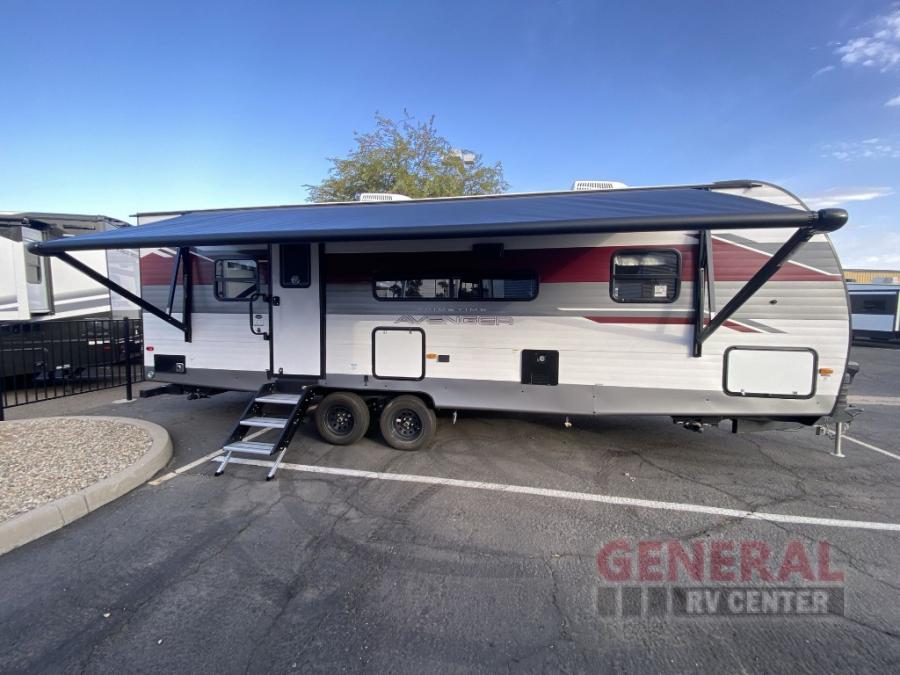 With any Avenger travel trailer by Prime Time, the exterior includes an aerodynamic smooth front metal, a diamond plate front rock guard for protection on the road, and four stabilizer jacks to keep your unit secure. There is a fully walkable roof plus an enclosed and heated underbelly that will help extend your camping season. The interior offers a 15,000 BTU air conditioner for the perfect climate inside, in-floor ducted heat, a systems monitor panel, and a Winegard 360+ antenna with Wi-Fi prep that will give you the option to stay connected as you camp. Each model also includes seamless Carefree Congoleum flooring, kitchen backsplash, shower pans in all models, and pleated nightshades throughout to name a few interior comforts!