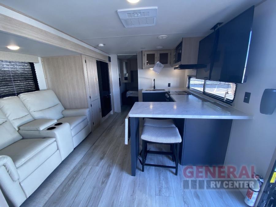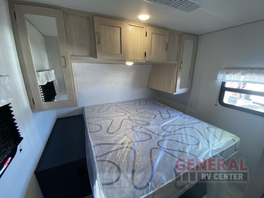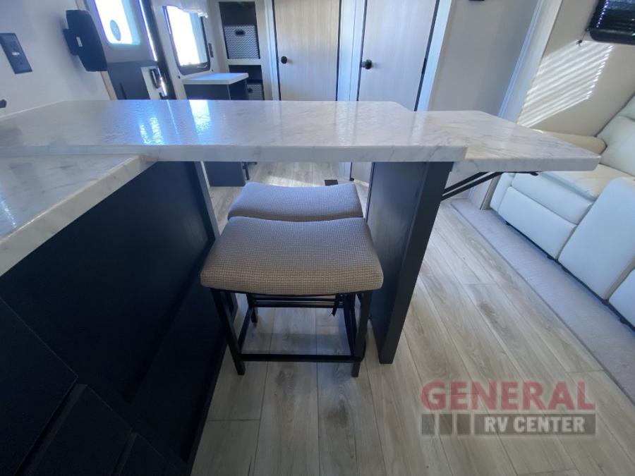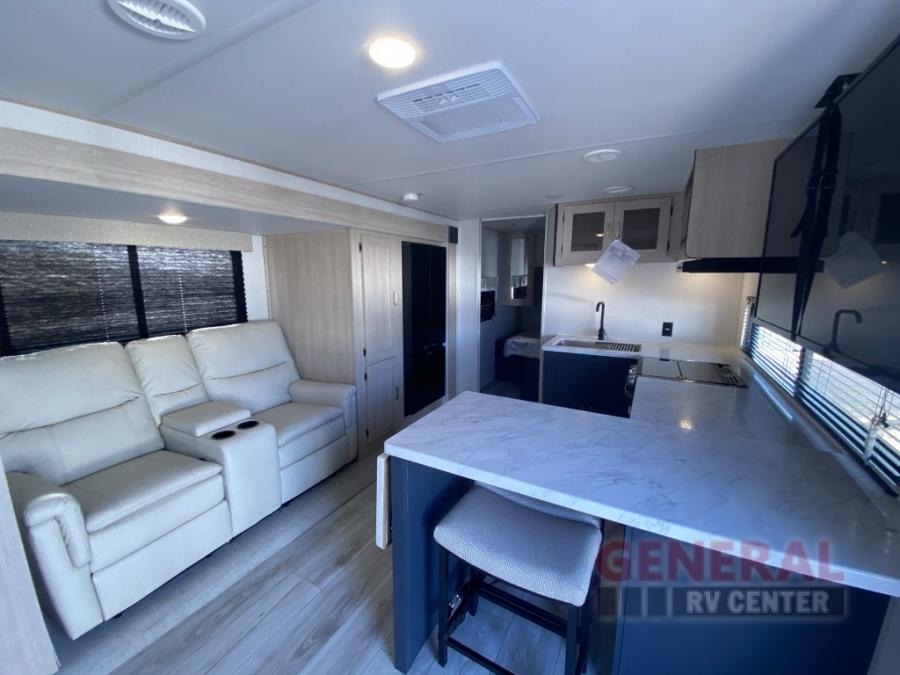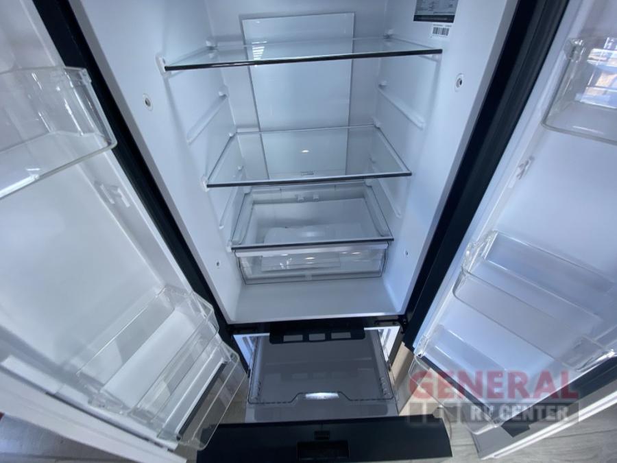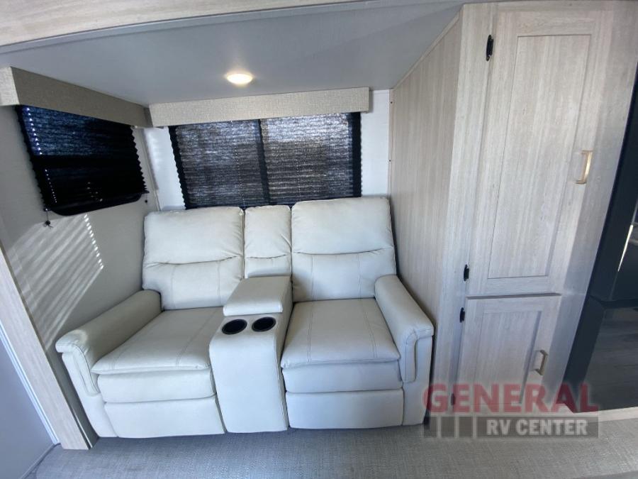Head to your local state park in this spacious travel trailer! Once you arrive at the campground, you can grab a cold drink from the exterior refrigerator, then head inside to make lunch. An L-shaped counter with two chairs provides a place to enjoy your morning coffee at, or you may find yourselves on the theater seat within the large slide out. The French door refrigerator and pantry is also found here and can hold all your food for the week. You'll feel right at home in the front private bedroom that includes a queen bed, dual wardrobes, and an overhead cabinet for even more storage.