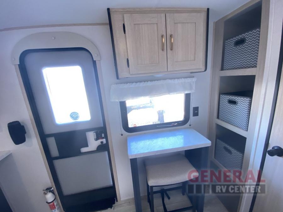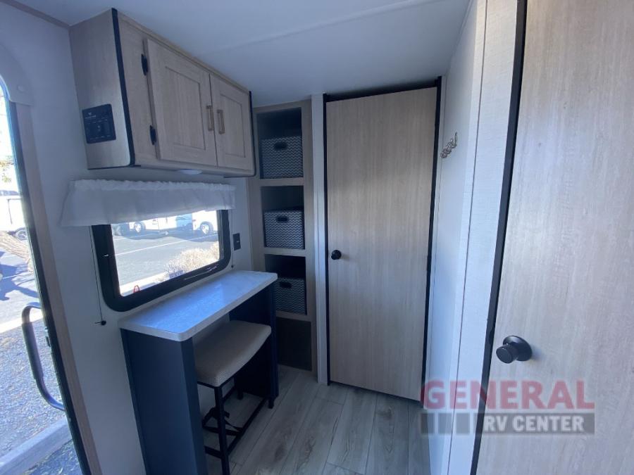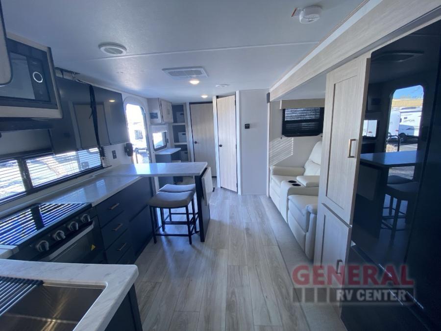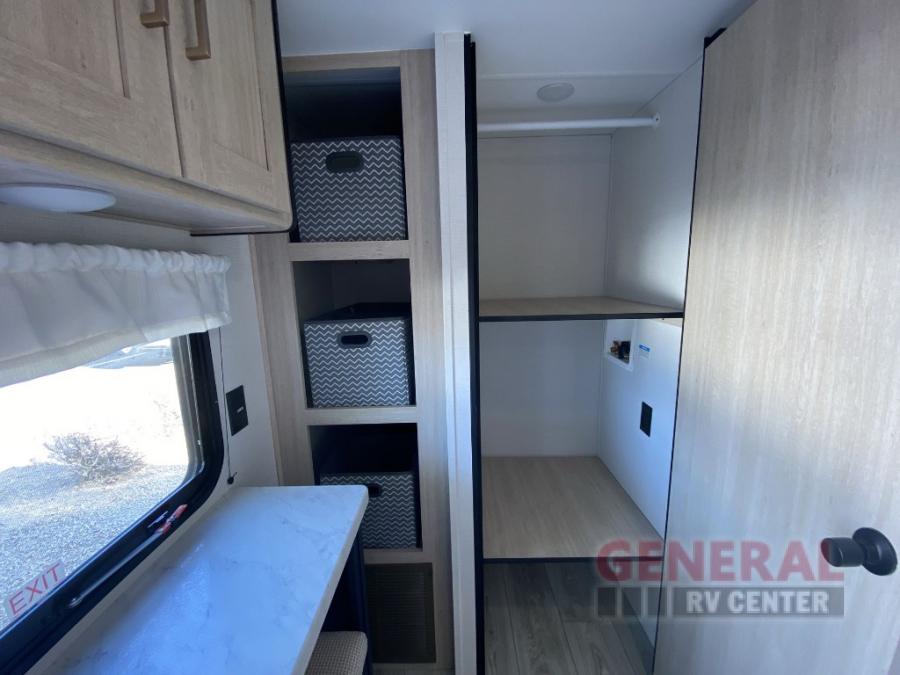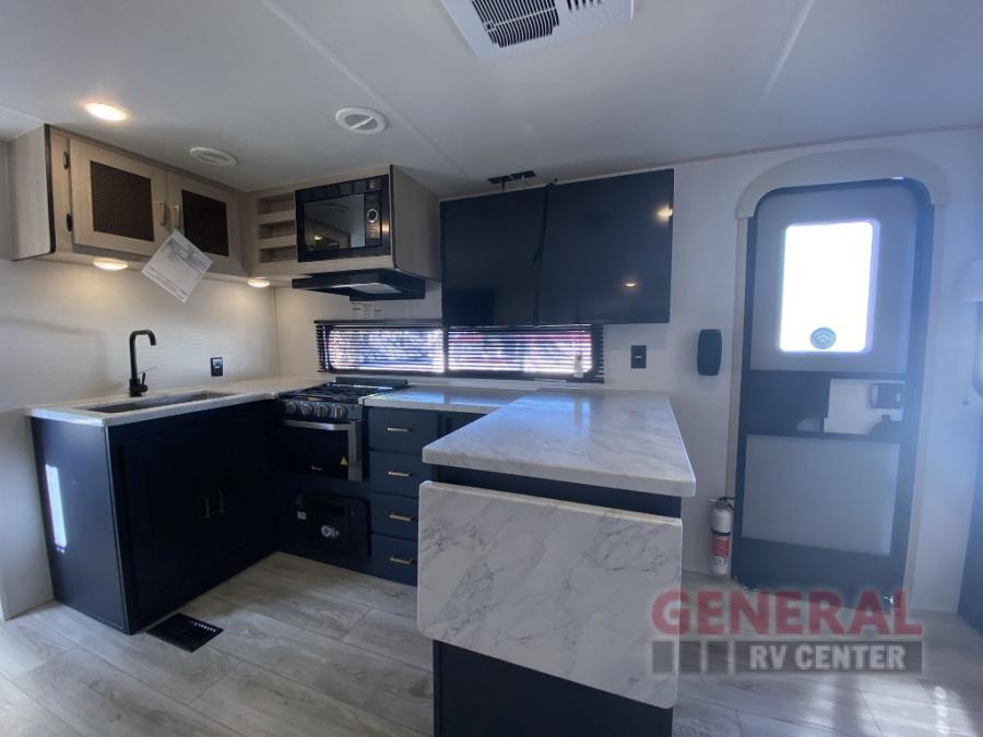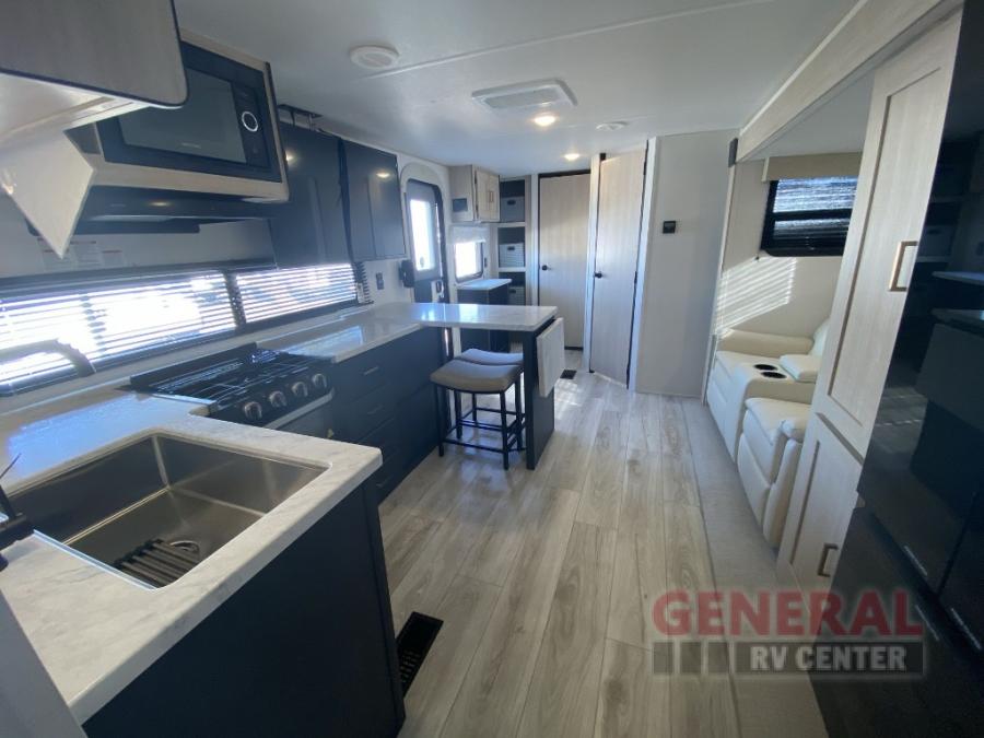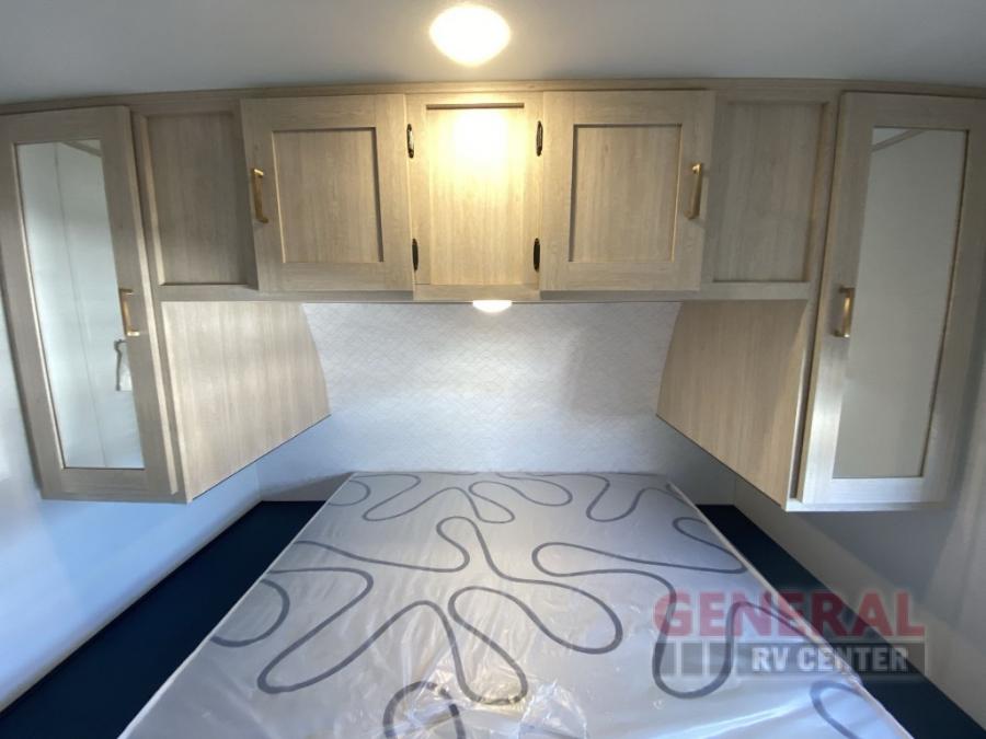 Head to your local state park in this spacious travel trailer! Once you arrive at the campground, you can grab a cold drink from the exterior refrigerator, then head inside to make lunch. An L-shaped counter with two chairs provides a place to enjoy your morning coffee at, or you may find yourselves on the theater seat within the large slide out. The French door refrigerator and pantry is also found here and can hold all your food for the week. You'll feel right at home in the front private bedroom that includes a queen bed, dual wardrobes, and an overhead cabinet for even more storage.