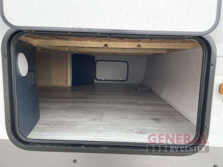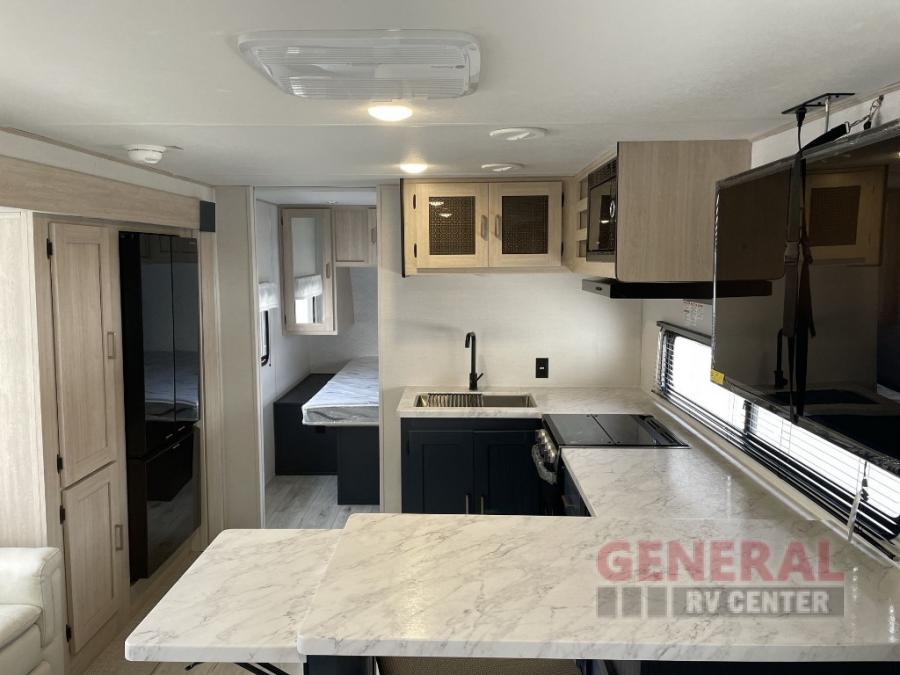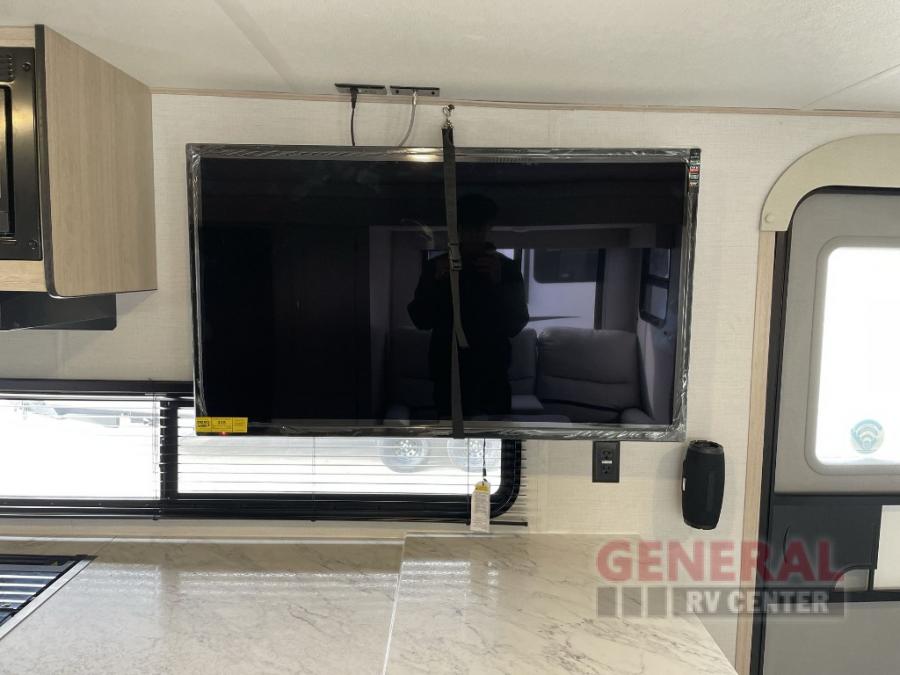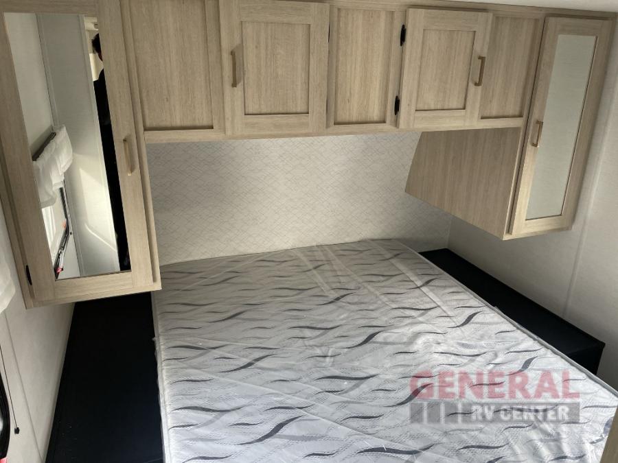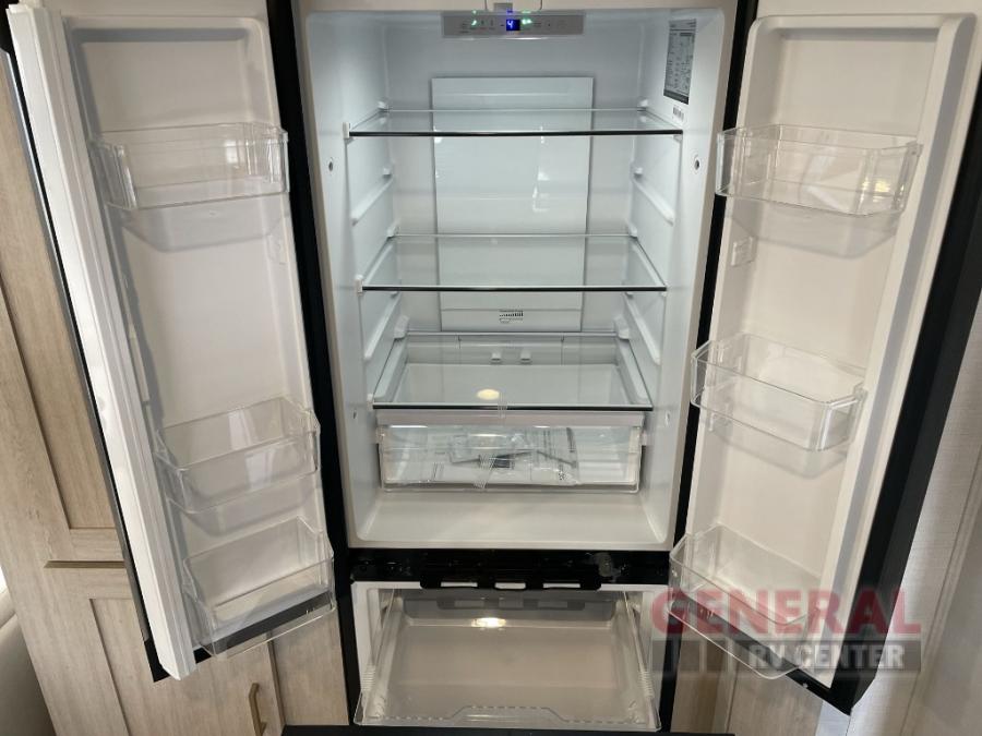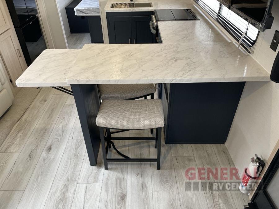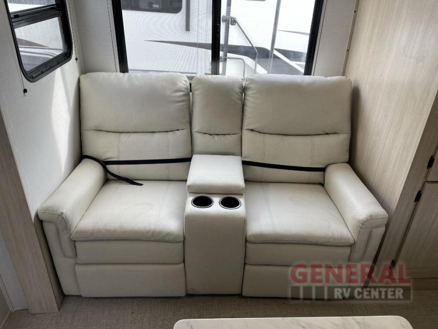 Head to your local state park in this spacious travel trailer! Once you arrive at the campground, you can grab a cold drink from the exterior refrigerator, then head inside to make lunch. An L-shaped counter with two chairs provides a place to enjoy your morning coffee at, or you may find yourselves on the theater seat within the large slide out. The French door refrigerator and pantry is also found here and can hold all your food for the week. You'll feel right at home in the front private bedroom that includes a queen bed, dual wardrobes, and an overhead cabinet for even more storage.