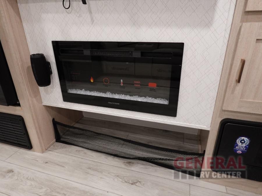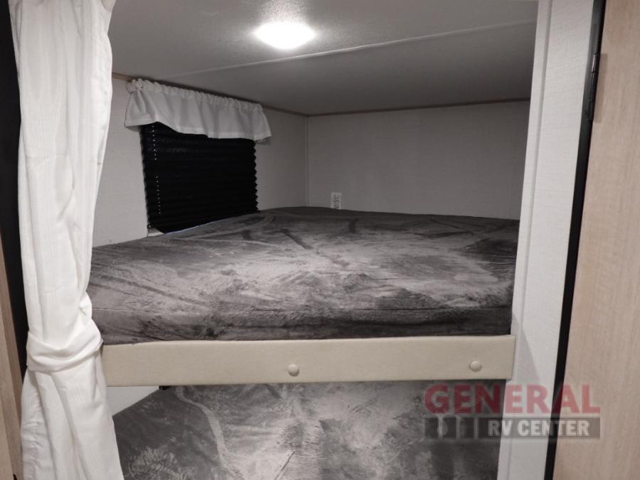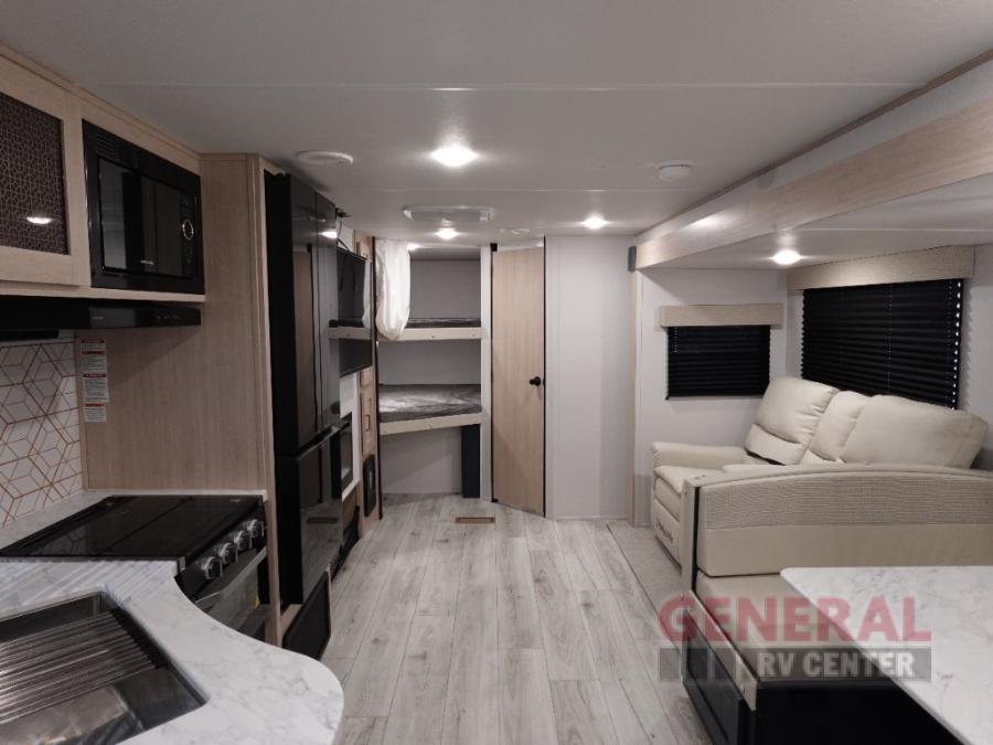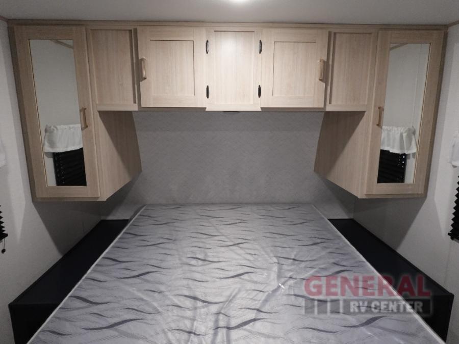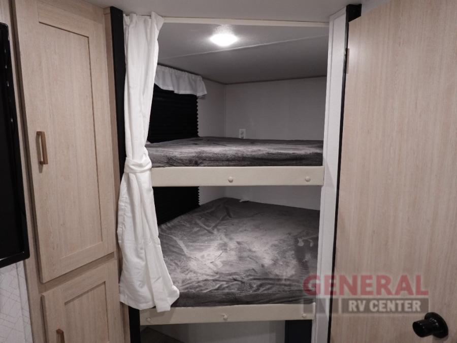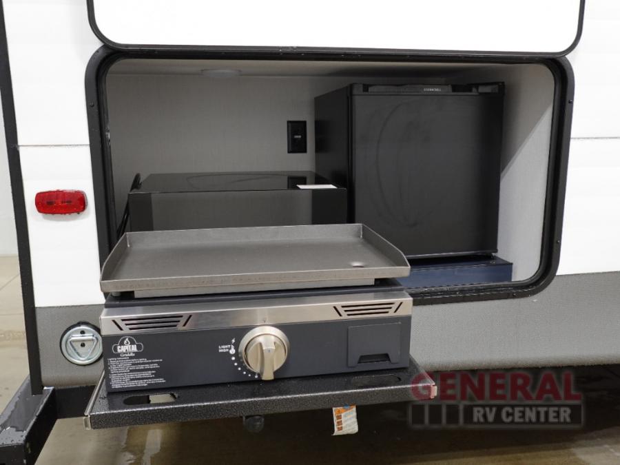 You and your family will love this trailer with all the sleeping accommodations, the privacy and the outdoor features! There are double-size bunks next to the full bathroom, a private front bedroom with space savings sliding doors, a walk-around queen bed, dual wardrobes, and overhead cabinets for storage. The large slide offers more floor space while cooking with full amenities including a pantry, and the theater seat and U-shaped dinette offer plenty of seating. This model also includes an outside kitchen that provides the cook another choice when feeding everyone, plus the 16' power awning gives you protection from the elements.