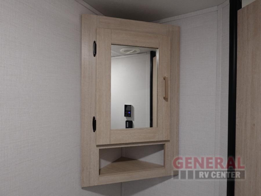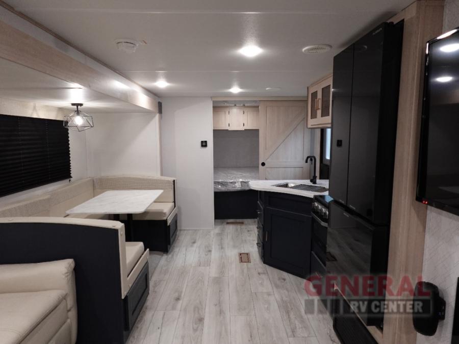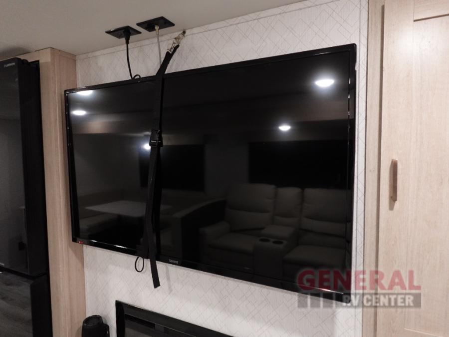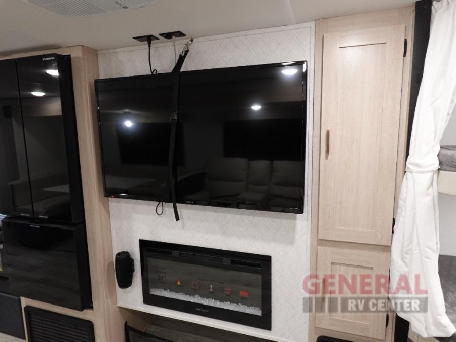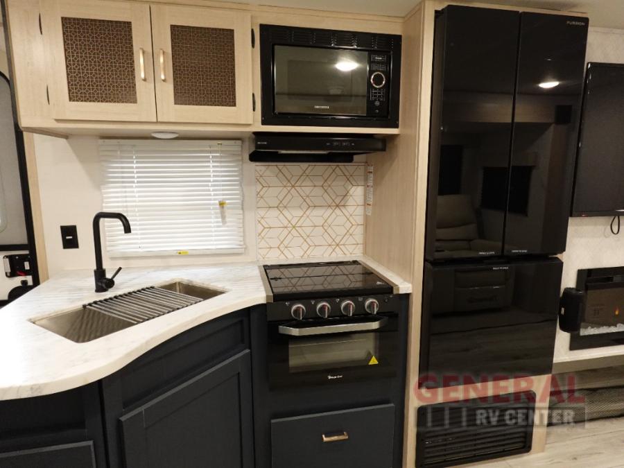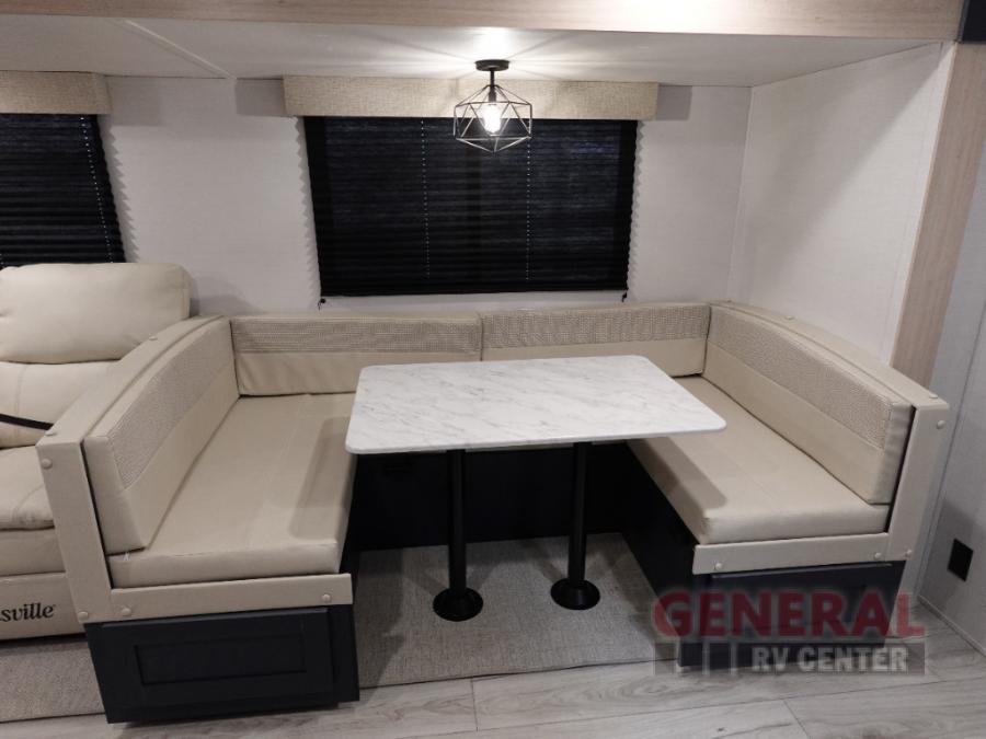You and your family will love this trailer with all the sleeping accommodations, the privacy and the outdoor features! There are double-size bunks next to the full bathroom, a private front bedroom with space savings sliding doors, a walk-around queen bed, dual wardrobes, and overhead cabinets for storage. The large slide offers more floor space while cooking with full amenities including a pantry, and the theater seat and U-shaped dinette offer plenty of seating. This model also includes an outside kitchen that provides the cook another choice when feeding everyone, plus the 16' power awning gives you protection from the elements.