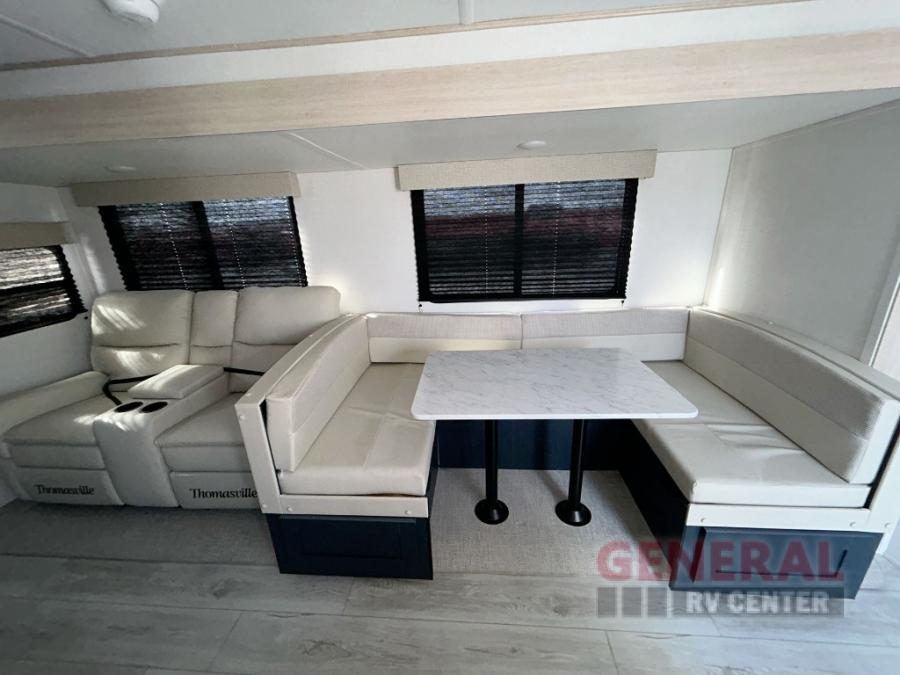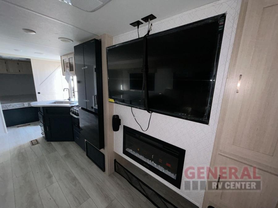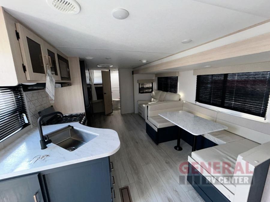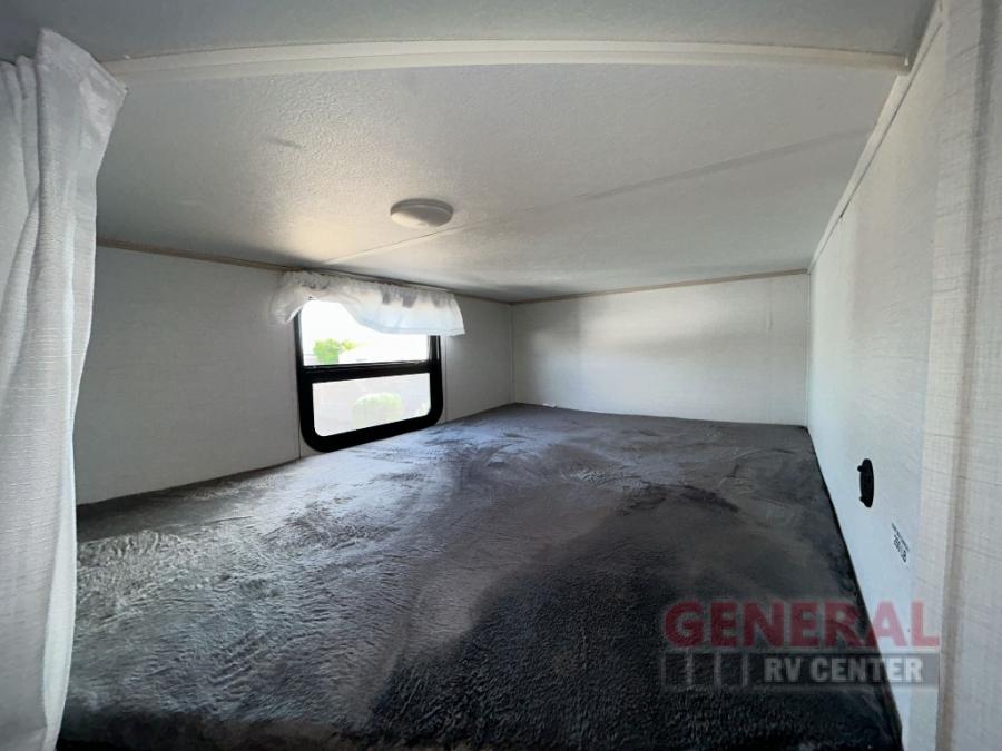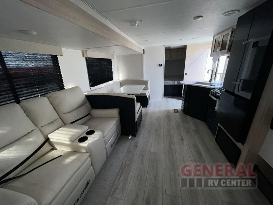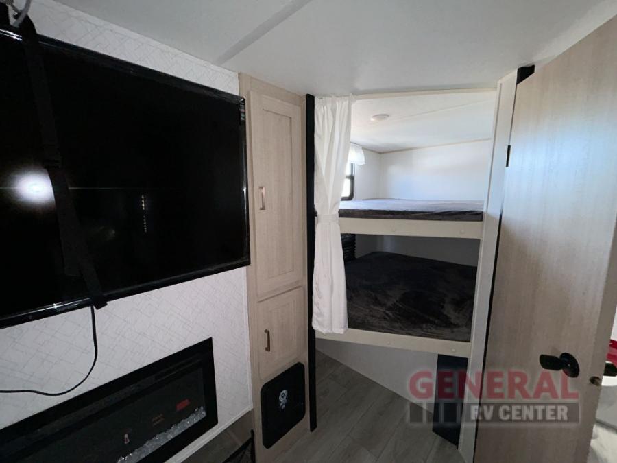 You and your family will love this trailer with all the sleeping accommodations, the privacy and the outdoor features! There are double-size bunks next to the full bathroom, a private front bedroom with space savings sliding doors, a walk-around queen bed, dual wardrobes, and overhead cabinets for storage. The large slide offers more floor space while cooking with full amenities including a pantry, and the theater seat and U-shaped dinette offer plenty of seating. This model also includes an outside kitchen that provides the cook another choice when feeding everyone, plus the 16' power awning gives you protection from the elements.