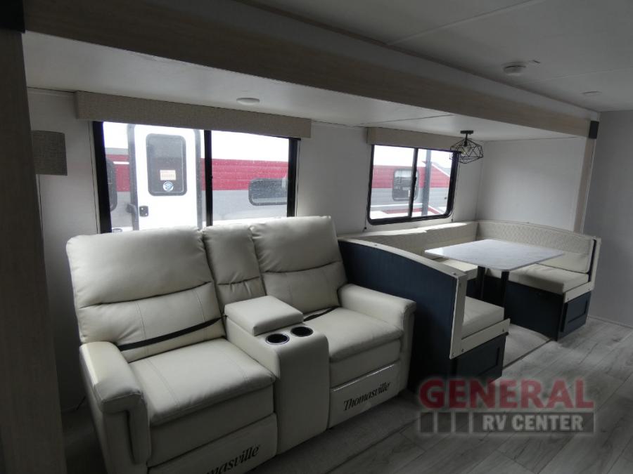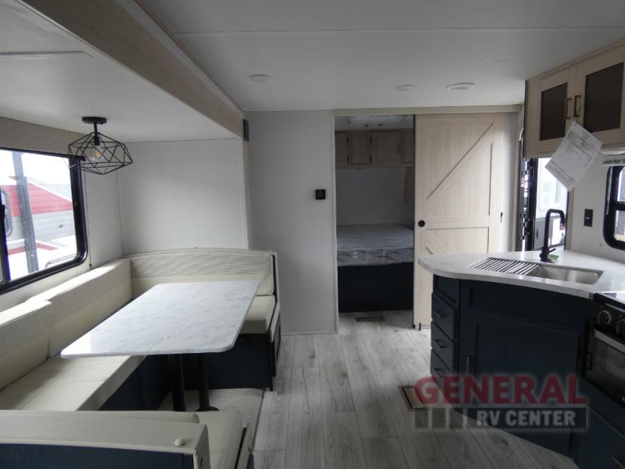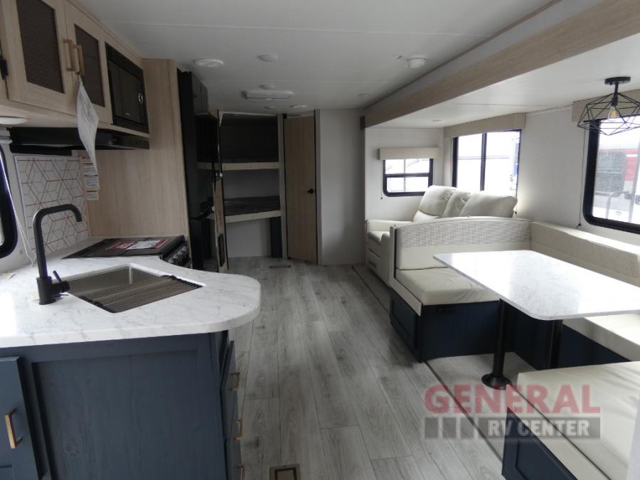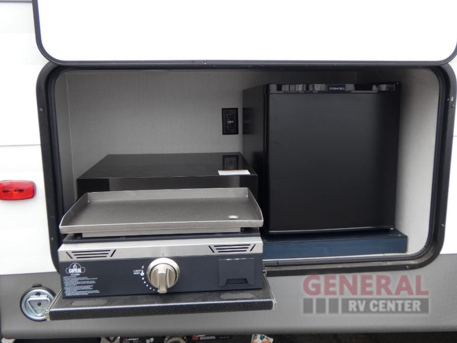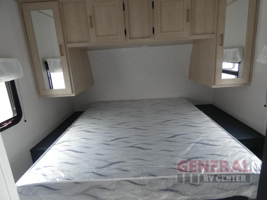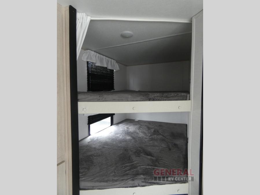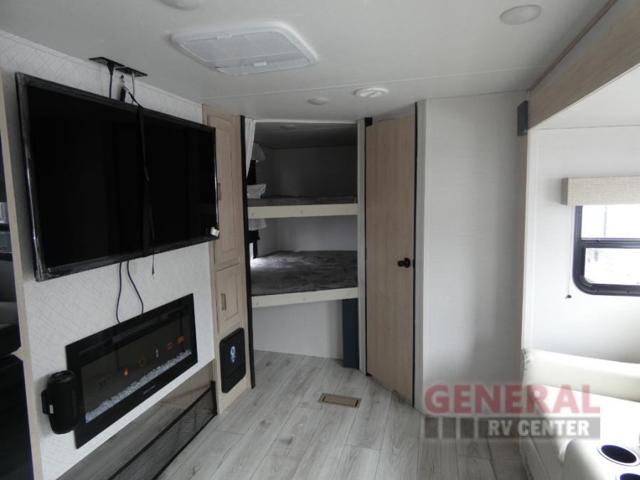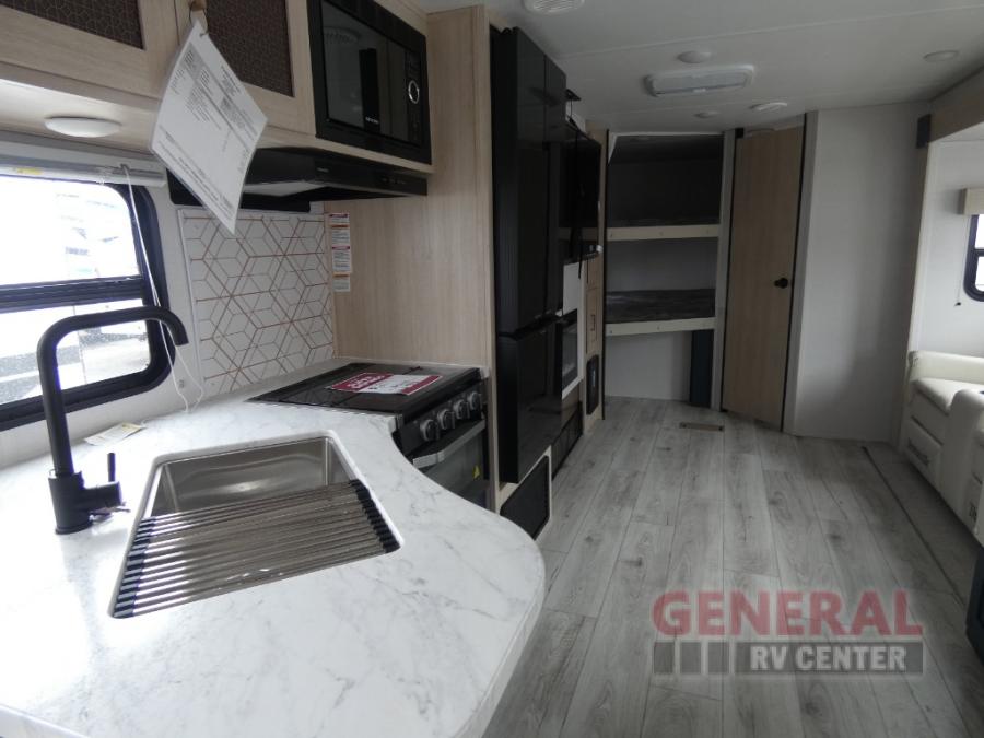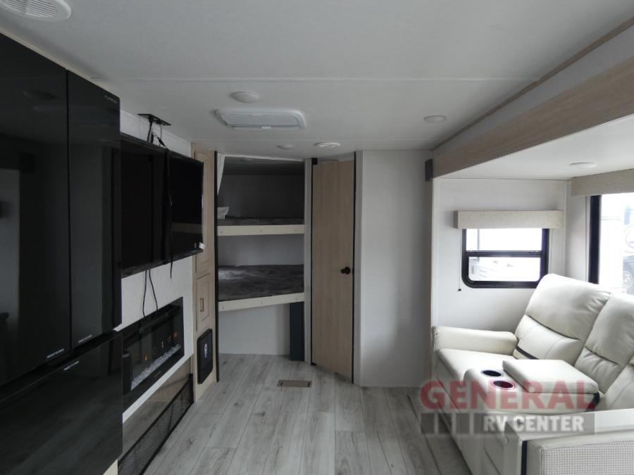 You and your family will love this trailer with all the sleeping accommodations, the privacy and the outdoor features! There are double-size bunks next to the full bathroom, a private front bedroom with space savings sliding doors, a walk-around queen bed, dual wardrobes, and overhead cabinets for storage. The large slide offers more floor space while cooking with full amenities including a pantry, and the theater seat and U-shaped dinette offer plenty of seating. This model also includes an outside kitchen that provides the cook another choice when feeding everyone, plus the 16' power awning gives you protection from the elements.