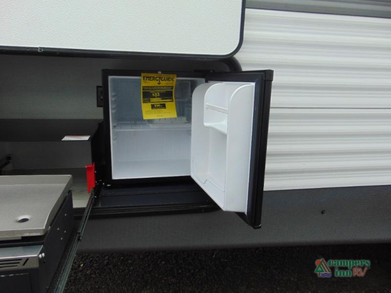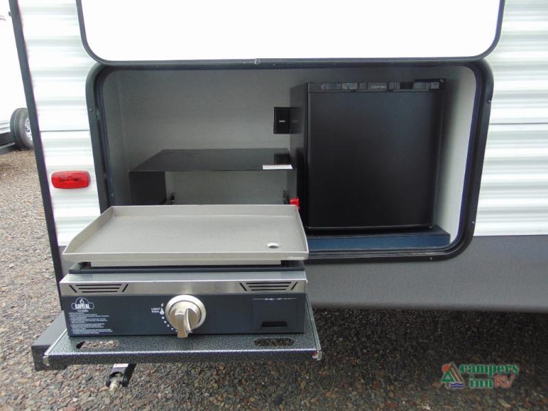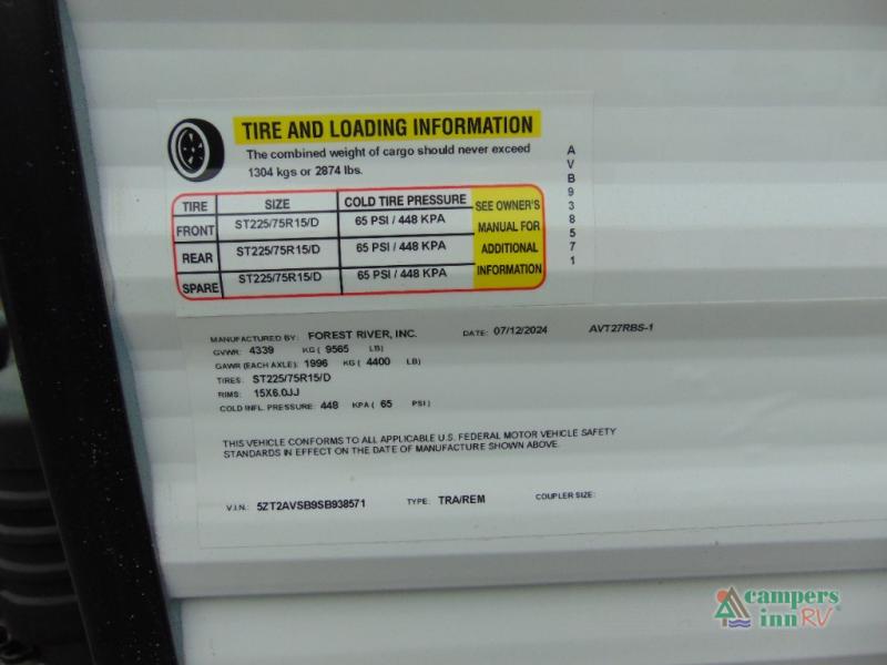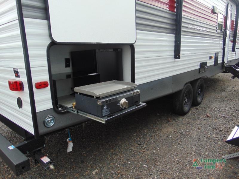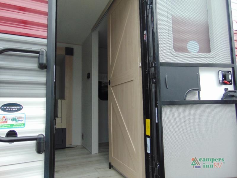 Outside, the Avenger 27RBS stands out with its durable construction and practical features, including a large awning for shaded outdoor living, exterior storage compartments, and easy hookups for water, electricity, and sewer. Every detail is designed to enhance your travel experience, making it easy to focus on fun and adventure.