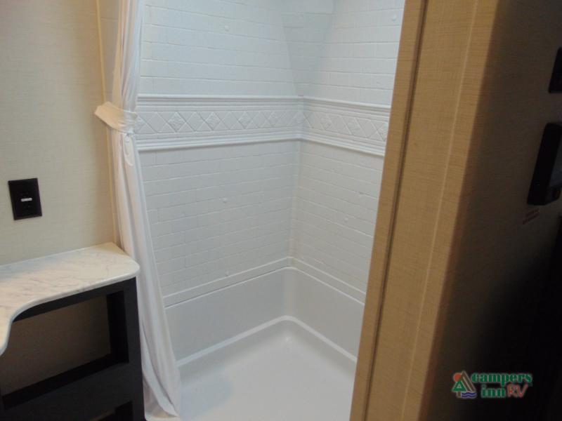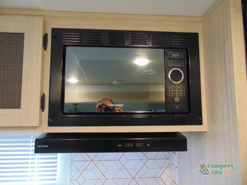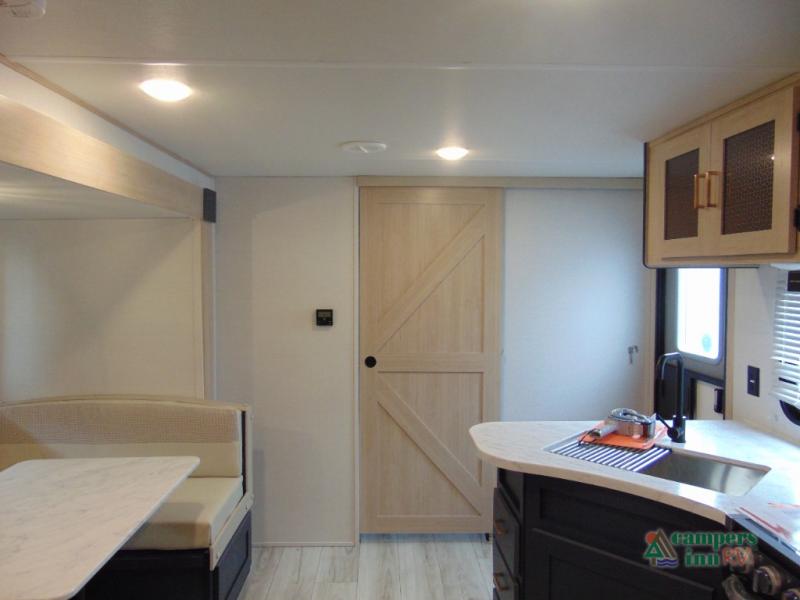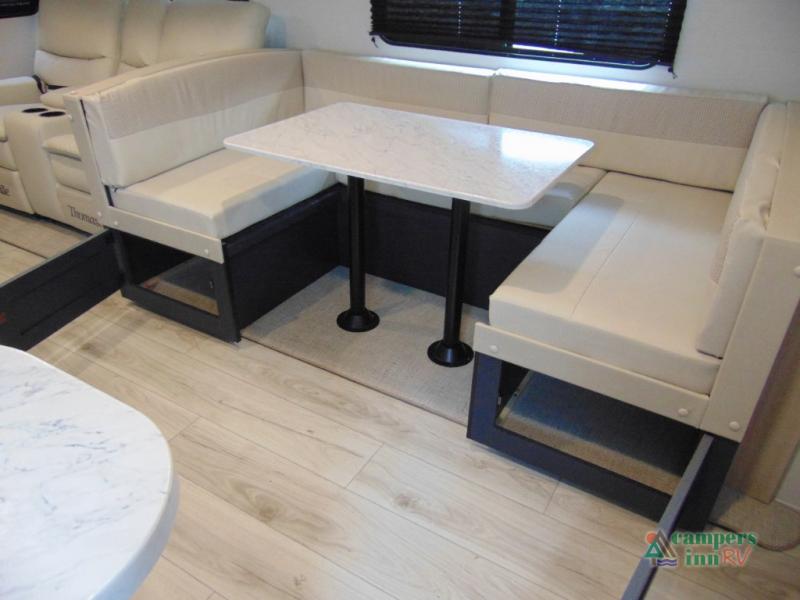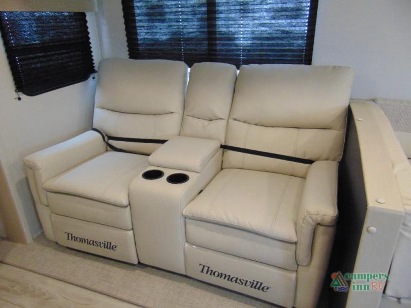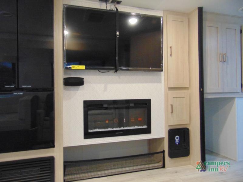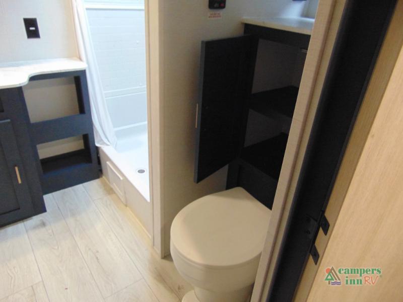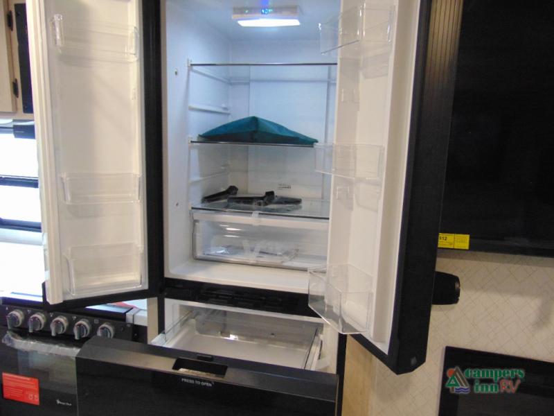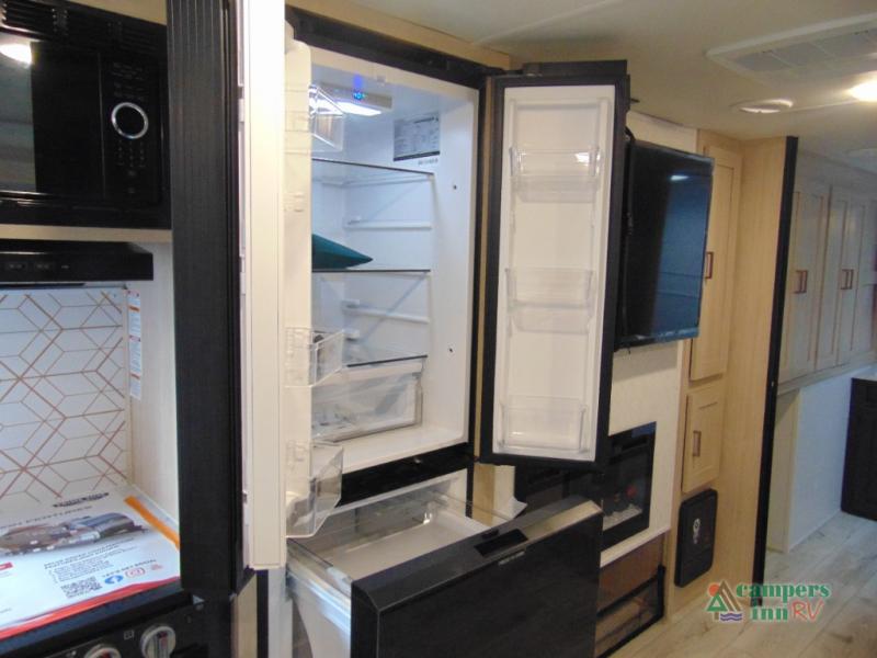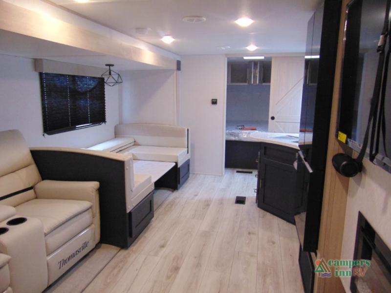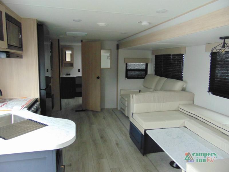 Step inside and discover a spacious interior thoughtfully designed for modern RV living. The rear kitchen features a full-size refrigerator, microwave, stove, and ample counter space, making meal preparation easy and convenient. The living area offers a comfortable dinette and sofa, perfect for relaxing, dining, or entertaining. The private bedroom provides a cozy retreat at the end of the day, while the well-appointed bathroom ensures convenience on every trip.