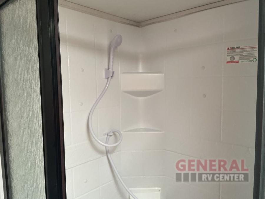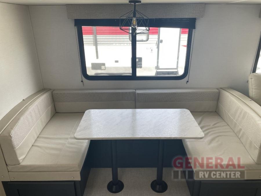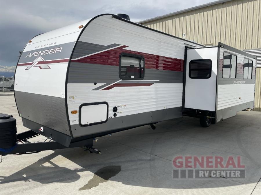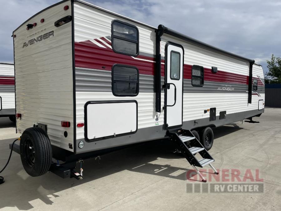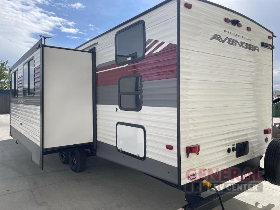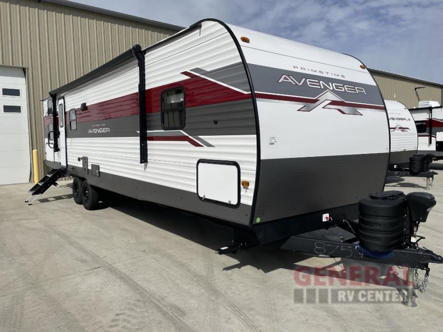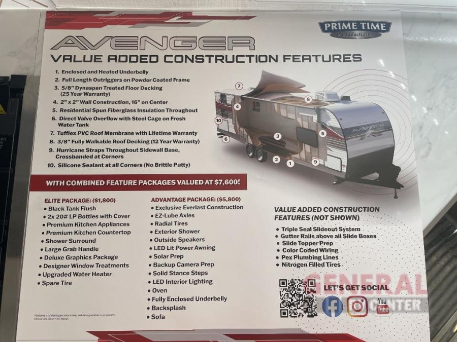 With any Avenger travel trailer by Prime Time, the exterior includes an aerodynamic smooth front metal, a diamond plate front rock guard for protection on the road, and four stabilizer jacks to keep your unit secure. There is a fully walkable roof plus an enclosed and heated underbelly that will help extend your camping season. The interior offers a 15,000 BTU air conditioner for the perfect climate inside, in-floor ducted heat, a systems monitor panel, and a Winegard 360+ antenna with Wi-Fi prep that will give you the option to stay connected as you camp. Each model also includes seamless Carefree Congoleum flooring, kitchen backsplash, shower pans in all models, and pleated nightshades throughout to name a few interior comforts!
