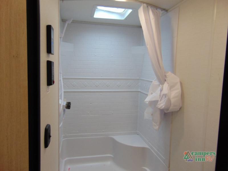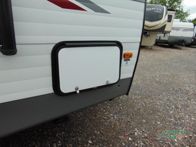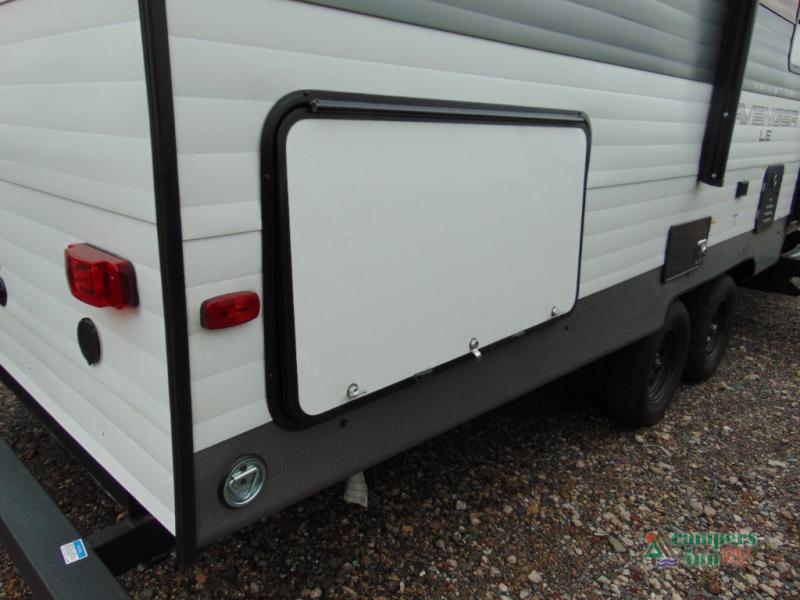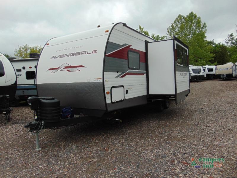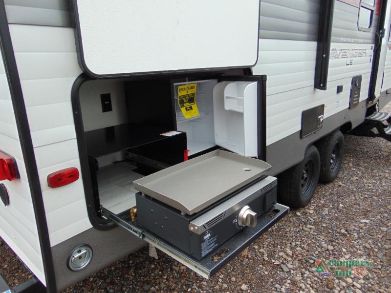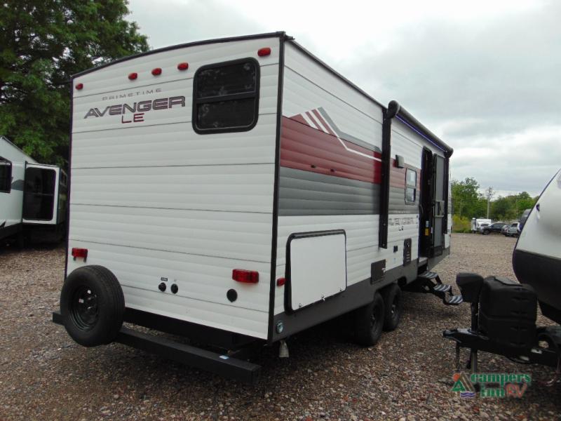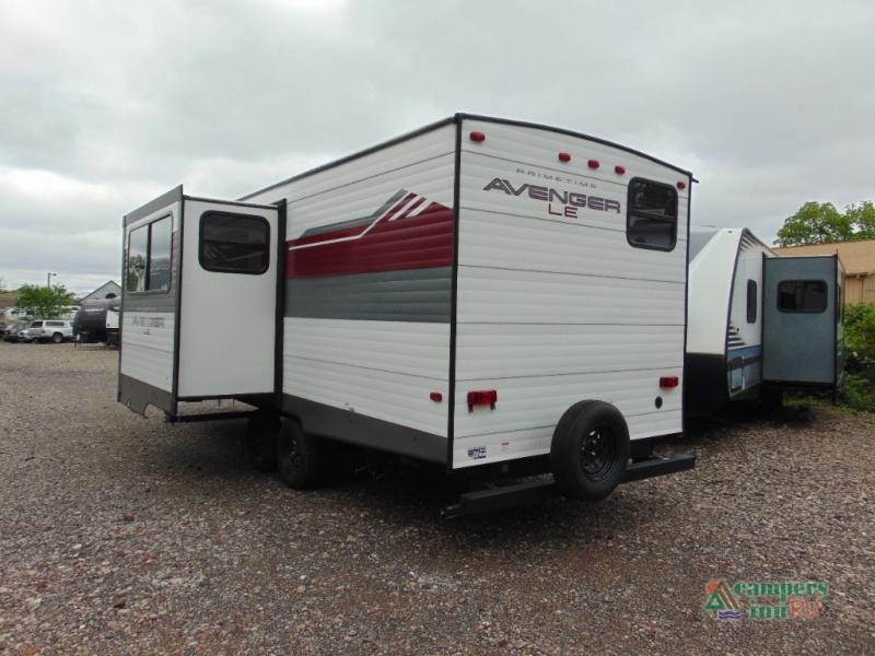With any Avenger LE travel trailer by Prime Time RV you will enjoy at-home comforts while at the campground! Durable construction begins with an enclosed and heated underbelly, a one-piece roof membrane, and diamond plate front rock guard for added protection against debris during transport. There are also locking magnetic latches on the baggage doors, fully vented windows throughout, four stabilizer jacks, plus solar prep if you want the option to go off-grid. The interior will have you feeling right at home with residential extended ball bearing drawer glides, seamless Carefree Congoleum flooring, an XL single basin kitchen sink, and shower pans in all models that will make it easy to get in and out of the bath. Some of the convenient appliances and equipment you will appreciate are the 15,000 BTU A/C, 12V high-capacity water pump, Slim Profile range hood, and the Winegard 360+ antenna with Wi-Fi prep!