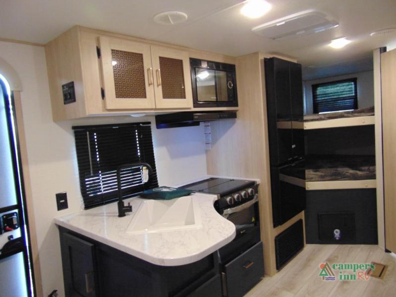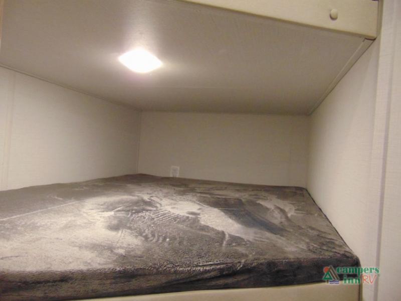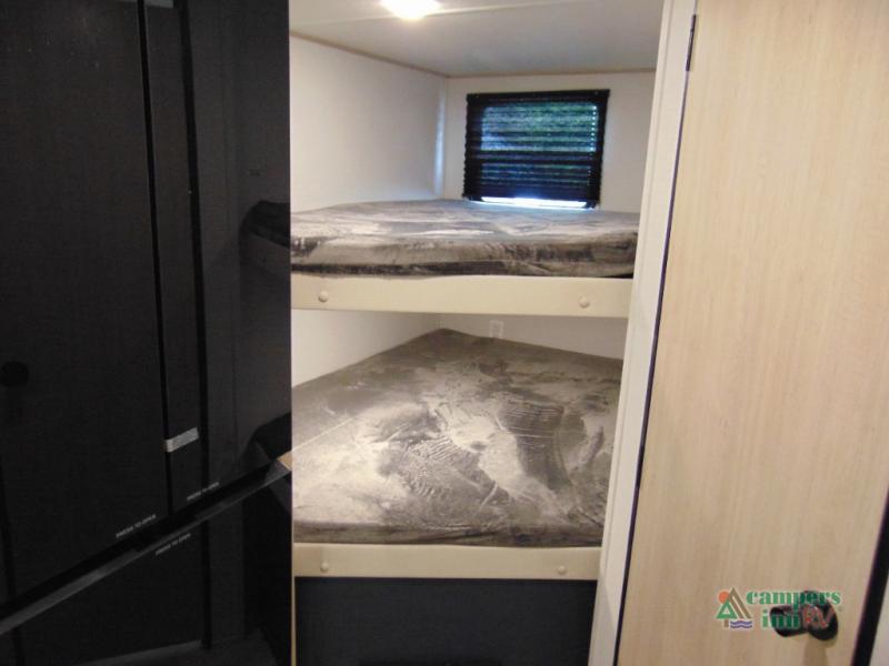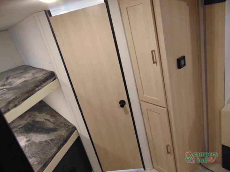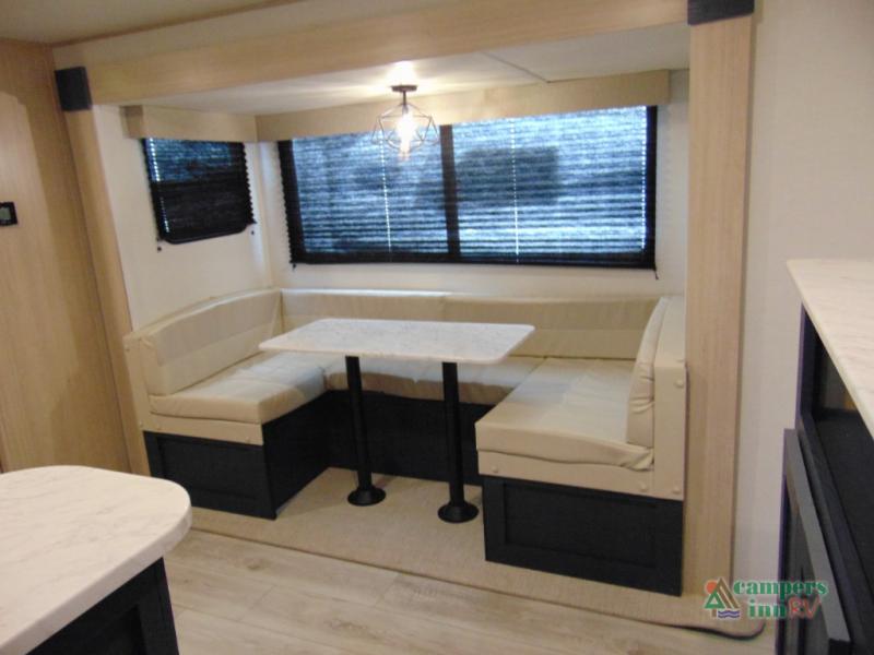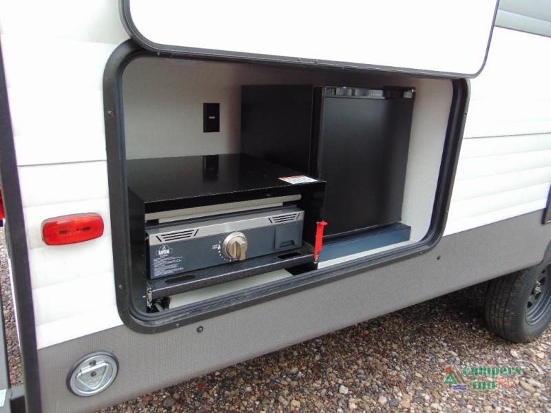 Gather the crew, load up and head out to enjoy a long-weekend at the state park! This trailer offers sleeping accommodations for eight because of the double-size bunks, the U-shaped dinette, and the queen bed. There is a rear corner full bathroom with a medicine cabinet to store personal belongings. You will find full kitchen amenities inside, as well as an outdoor kitchen where you can watch the kids play while making dinner. The single slide provides more living space in the interior, as well as extra sleeping space on the U-shaped dinette.