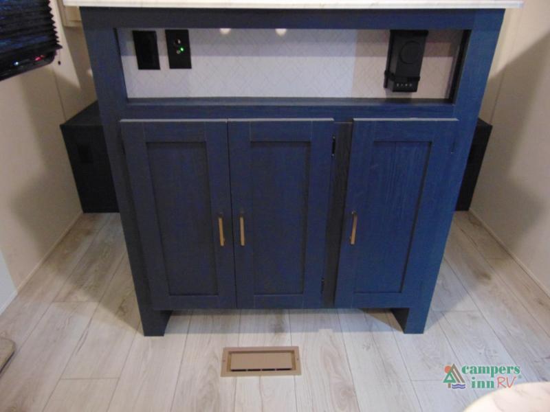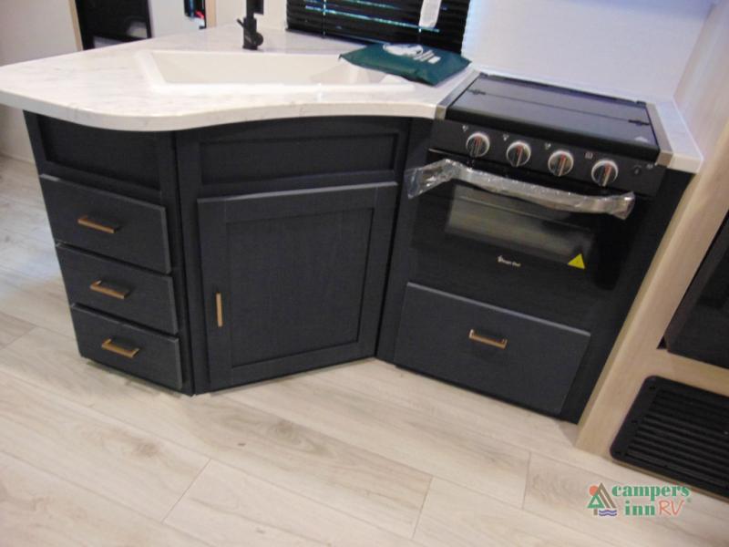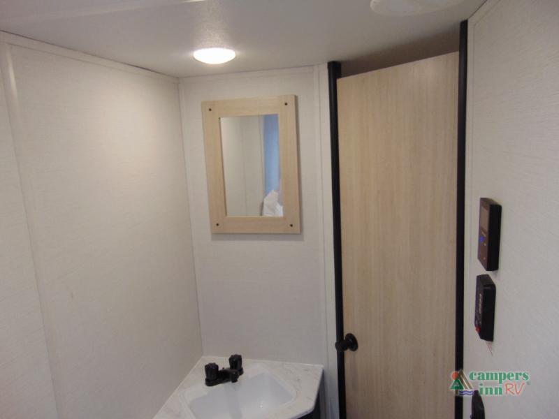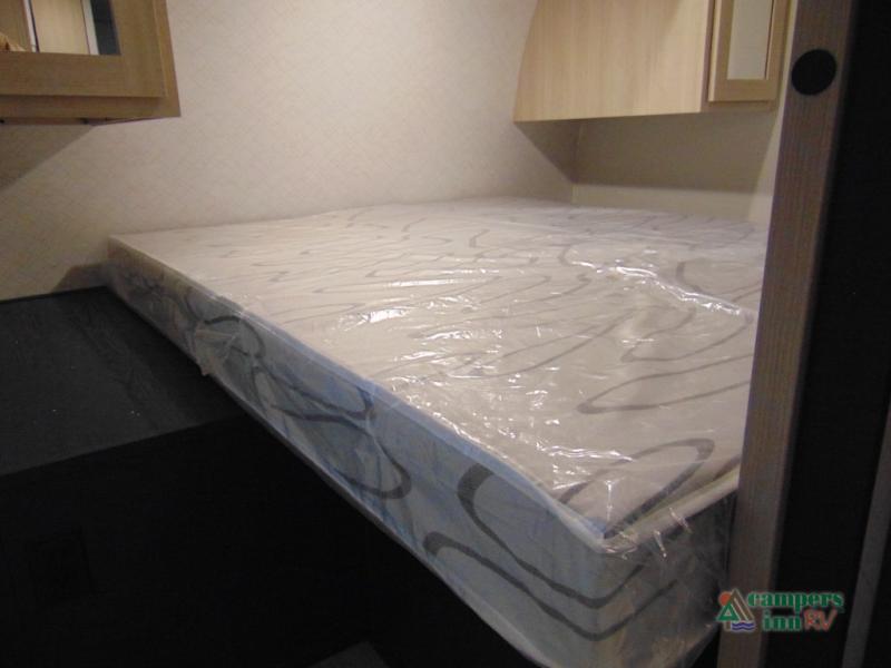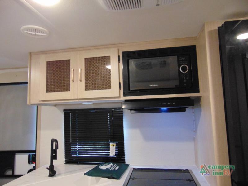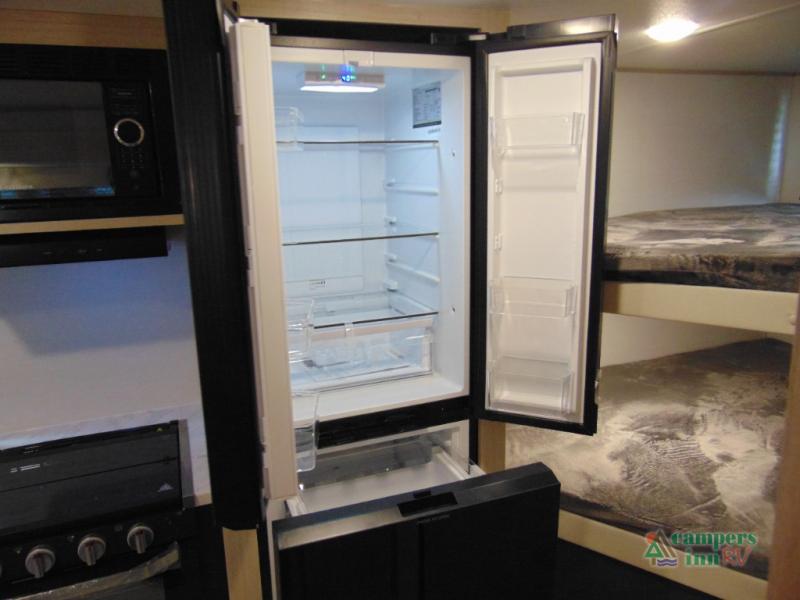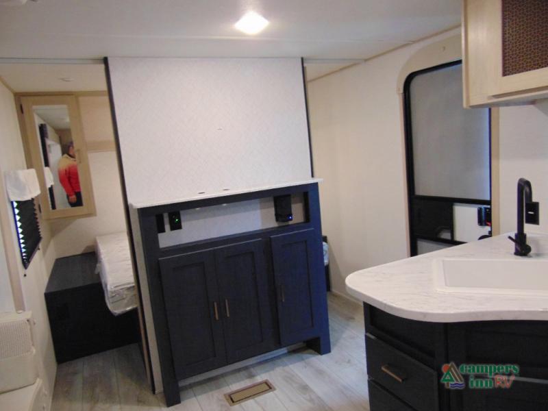 Gather the crew, load up and head out to enjoy a long-weekend at the state park! This trailer offers sleeping accommodations for eight because of the double-size bunks, the U-shaped dinette, and the queen bed. There is a rear corner full bathroom with a medicine cabinet to store personal belongings. You will find full kitchen amenities inside, as well as an outdoor kitchen where you can watch the kids play while making dinner. The single slide provides more living space in the interior, as well as extra sleeping space on the U-shaped dinette.