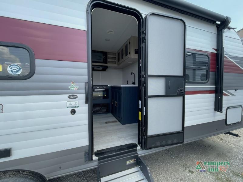 Bring the whole family along with sleeping space for up to eight people, thanks to the double bunks, convertible booth dinette, jackknife sofa, and queen bed. The well-equipped indoor kitchen and outdoor kitchen make meal prep a breeze, and the full bathroom is located right by the bunks for easy access.
