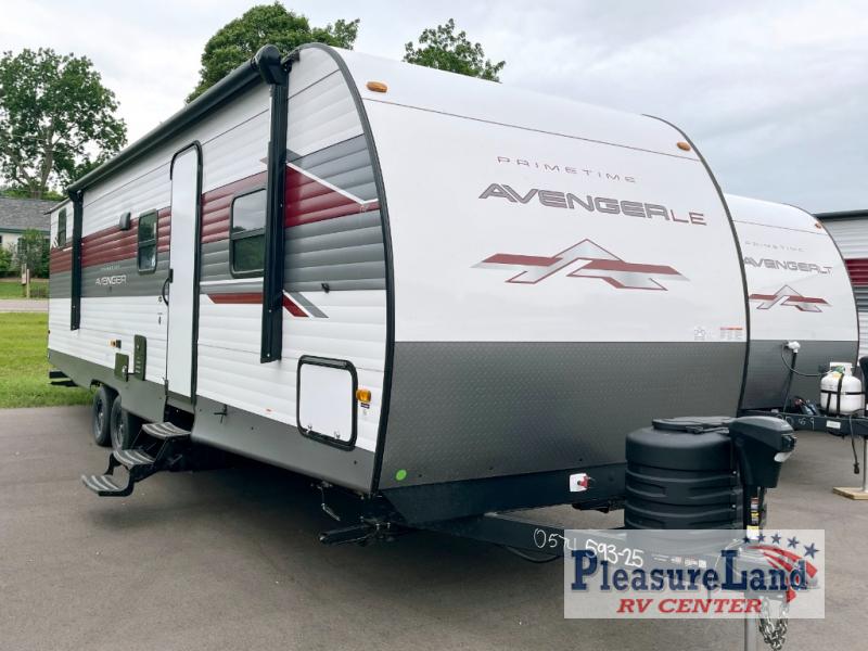 With any Avenger LE travel trailer by Prime Time RV you will enjoy at-home comforts while at the campground! Durable construction begins with an enclosed and heated underbelly, a one-piece roof membrane, and diamond plate front rock guard for added protection against debris during transport. There are also locking magnetic latches on the baggage doors, fully vented windows throughout, four stabilizer jacks, plus solar prep if you want the option to go off-grid. The interior will have you feeling right at home with residential extended ball bearing drawer glides, seamless Carefree Congoleum flooring, an XL single basin kitchen sink, and shower pans in all models that will make it easy to get in and out of the bath. Some of the convenient appliances and equipment you will appreciate are the 15,000 BTU A/C, 12V high-capacity water pump, Slim Profile range hood, and the Winegard 360+ antenna with Wi-Fi prep!