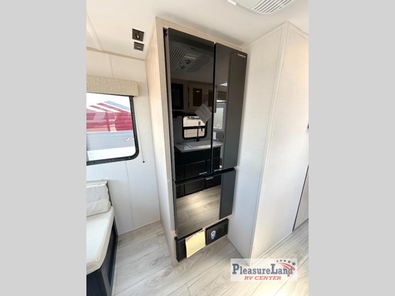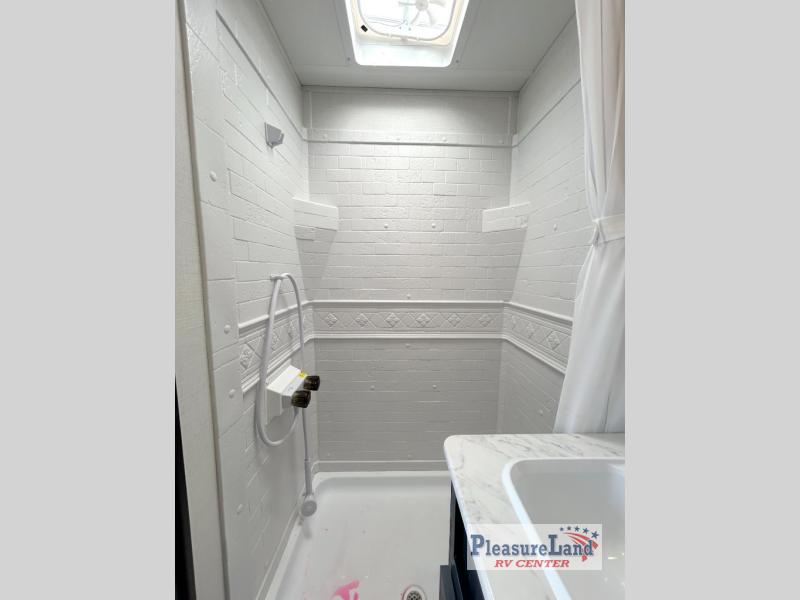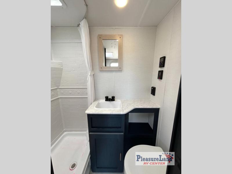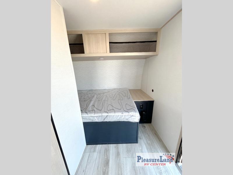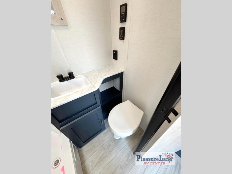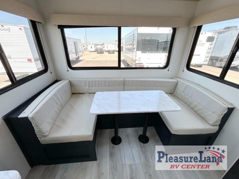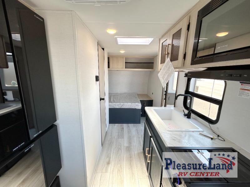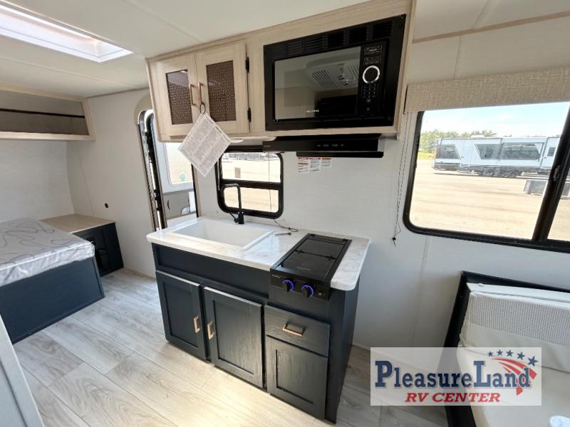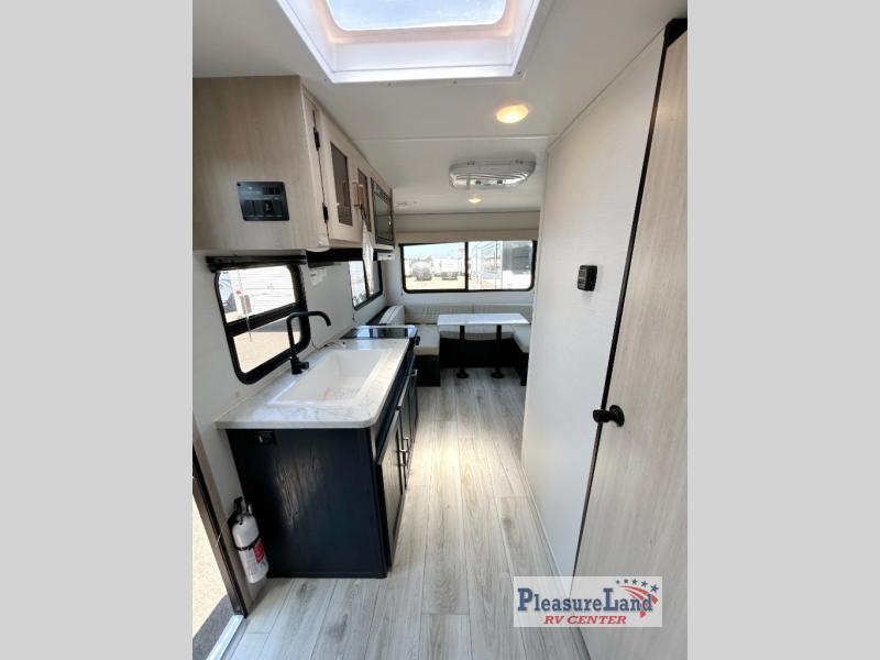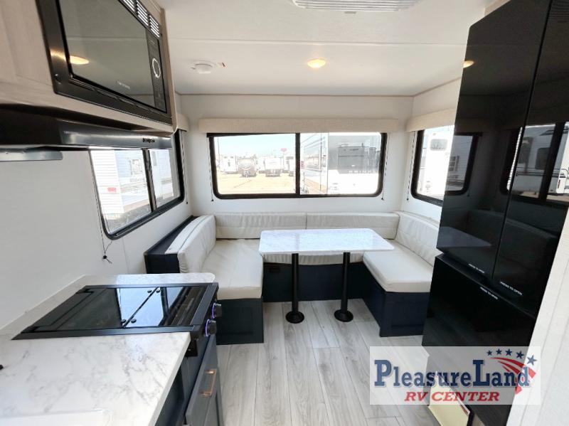 Camping with your friends or family doesn't have to be hard! This easy-to-tow, store and clean up RV allows two to four people to sleep comfortably on the U-shaped dinette along the rear wall with a large window and the front bed with nightstand. The kitchen includes a 10.7 cu. ft. 12V refrigerator, a microwave, plus a two-burner cooktop for preparing meals just like you do at home.