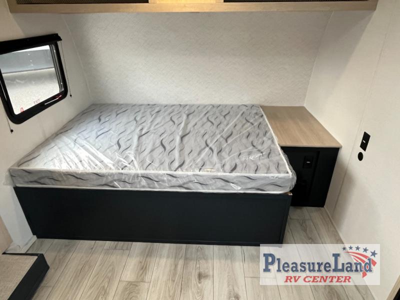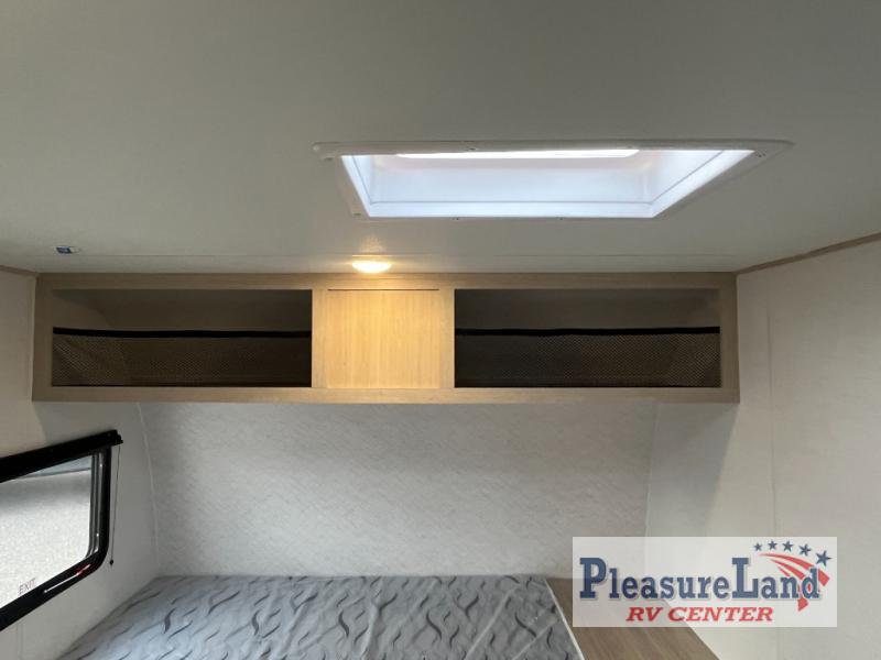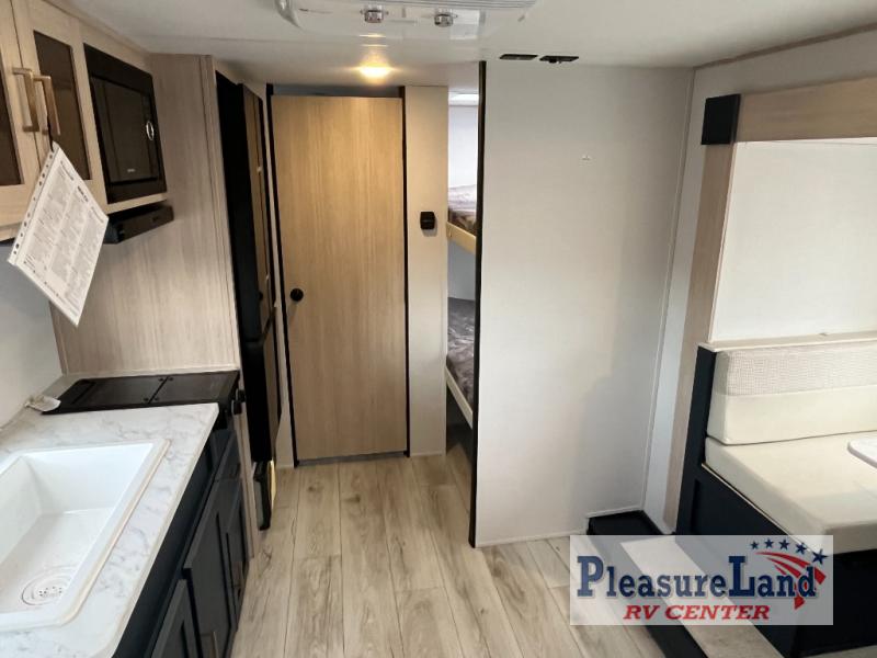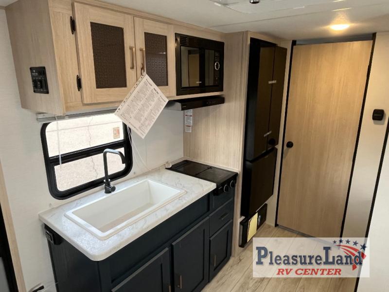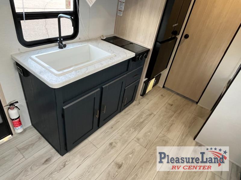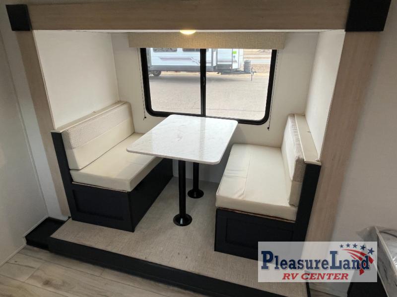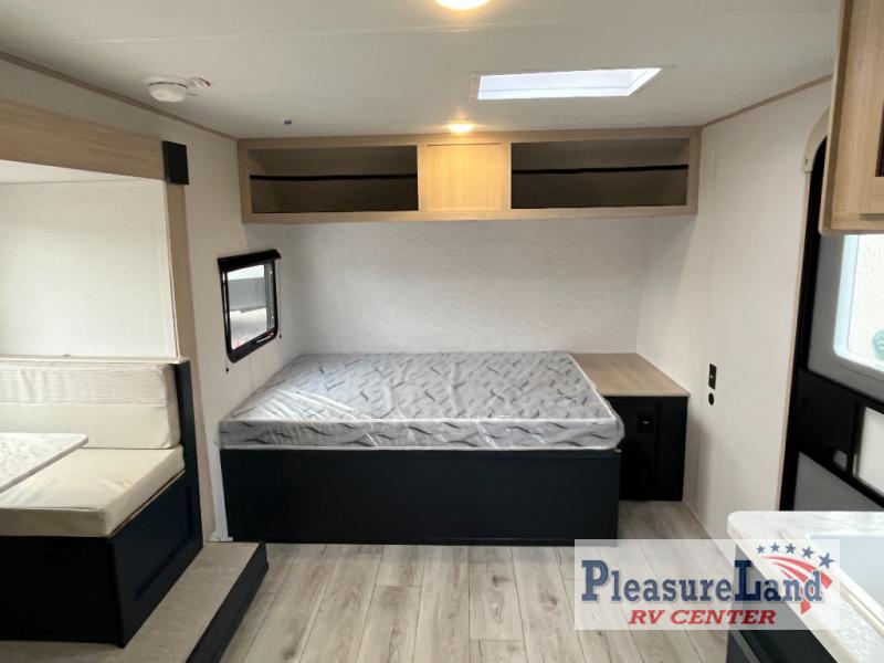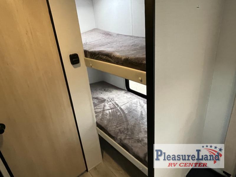 Go hiking, biking or exploring for new places when you have this trailer at the campgrounds! You will find sleeping for five between the rear corner bunk beds, and the front bed with a nightstand for your cellphones and such. And one more can sleep on the dinette slide. You'll be delighted with the kitchen skylight that gives natural lighting as you cook a meal. The LED-lit power awning provides a protected outdoor living area as you visit or make s'mores around the campfire.