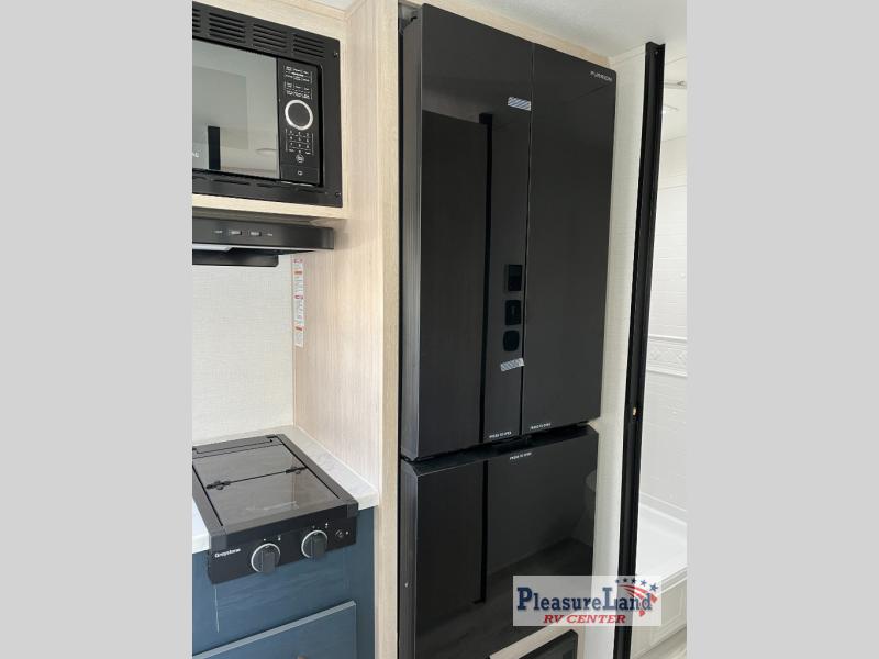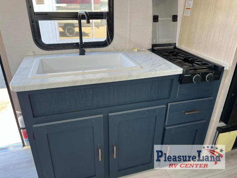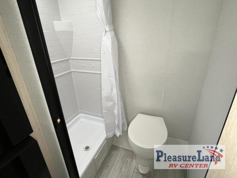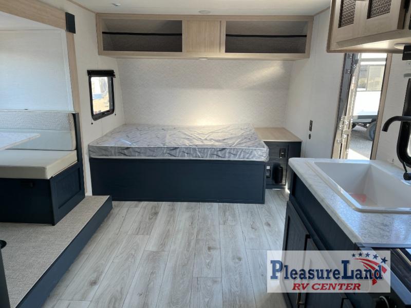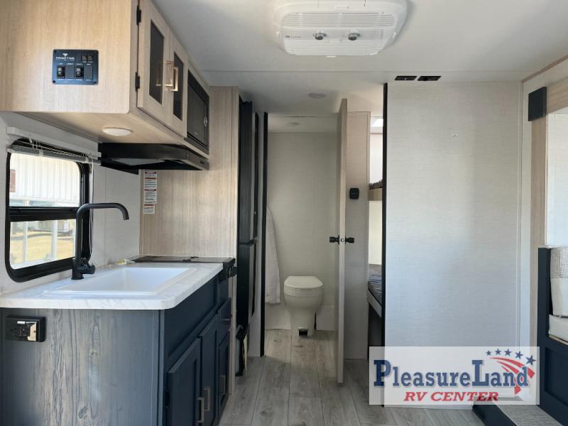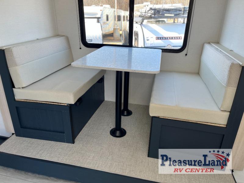 Go hiking, biking or exploring for new places when you have this trailer at the campgrounds! You will find sleeping for five between the rear corner bunk beds, and the front bed with a nightstand for your cellphones and such. And one more can sleep on the dinette slide. You'll be delighted with the kitchen skylight that gives natural lighting as you cook a meal. The LED-lit power awning provides a protected outdoor living area as you visit or make s'mores around the campfire.