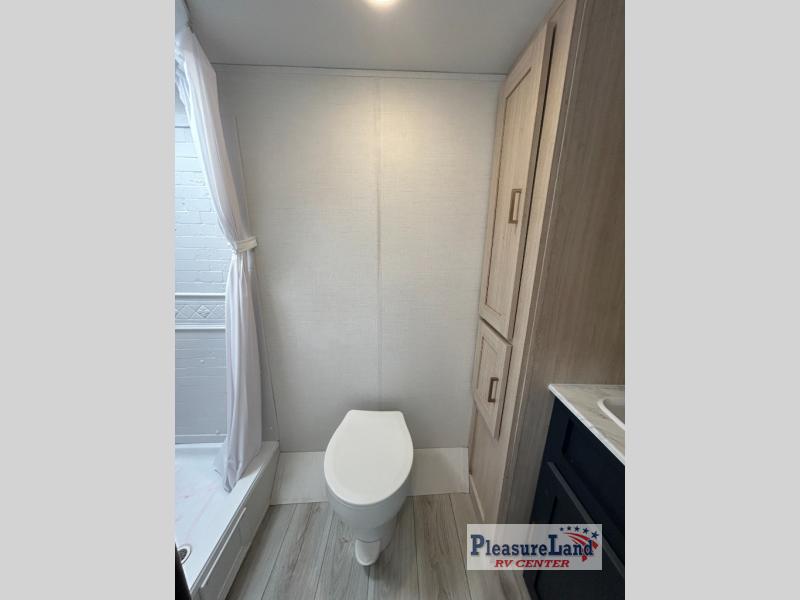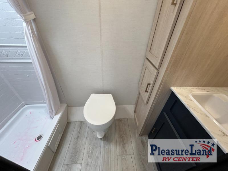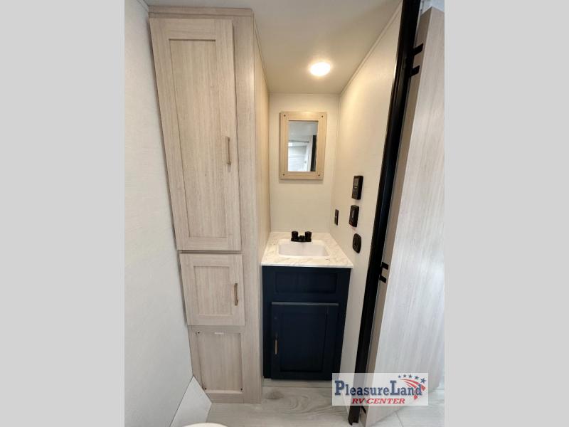 Enjoy a little more floor space in this trailer thanks to the dinette slide that can be utilized as a dining, gaming and/or sleeping space. The front walk-around queen bed offers overhead storage and dual wardrobes to keep this area tidy. The galley kitchen includes everything you need to make warm meals, and store leftovers in the 10.7 cu. ft. 12V refrigerator, plus there is a pantry for dry good storage. The rear bathroom offers privacy and convenience when changing and getting cleaned up, and there is also linen storage which is handy.