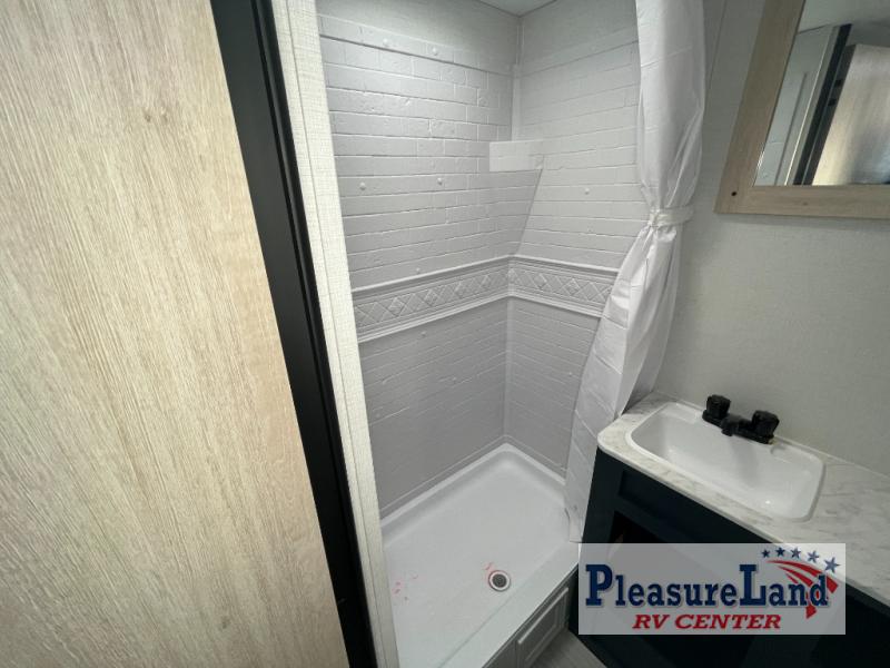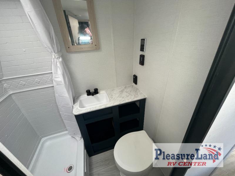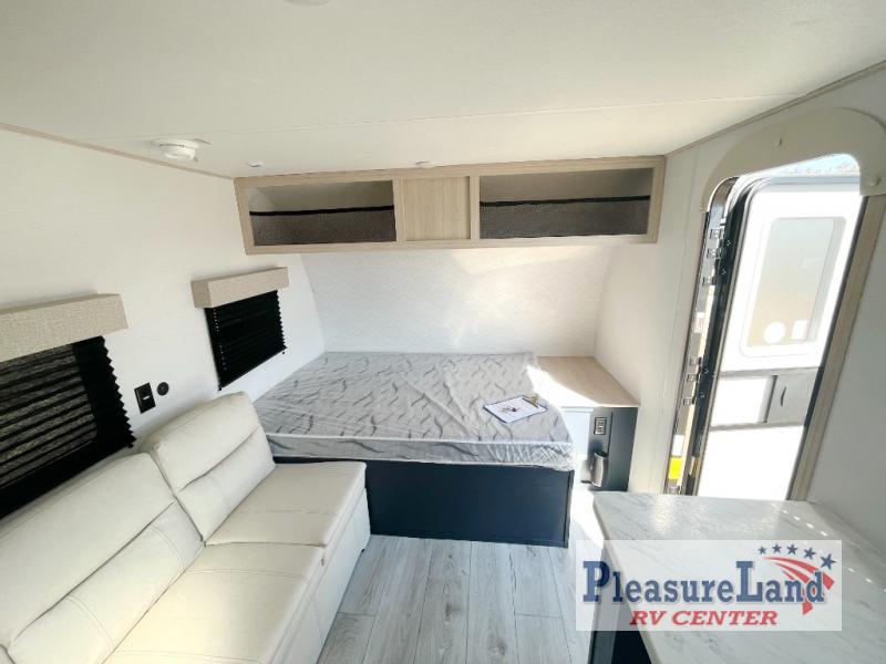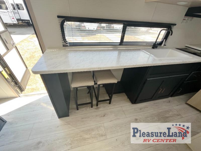 Camping in this travel trailer will be just what the doctor ordered! The rear corner kitchen includes ample counter space to prep meals, along with a desktop if you need to get some work done. The bartop with two stools will provide a place to dine together, and the sofa lets you relax in the evenings. Cook all of your meals on the two burner cooktop or in the electric microwave, and store your food in the 10.7 cu. ft. 12V refrigerator. A full bath lets you freshen up before bed, and the nightstand at the foot of the queen bed will keep your belongings tucked away!