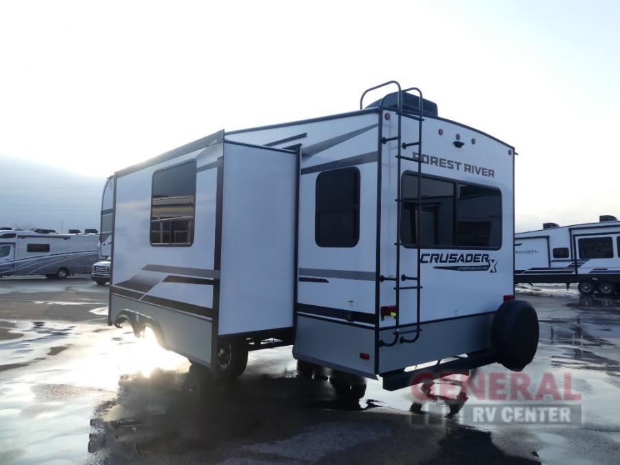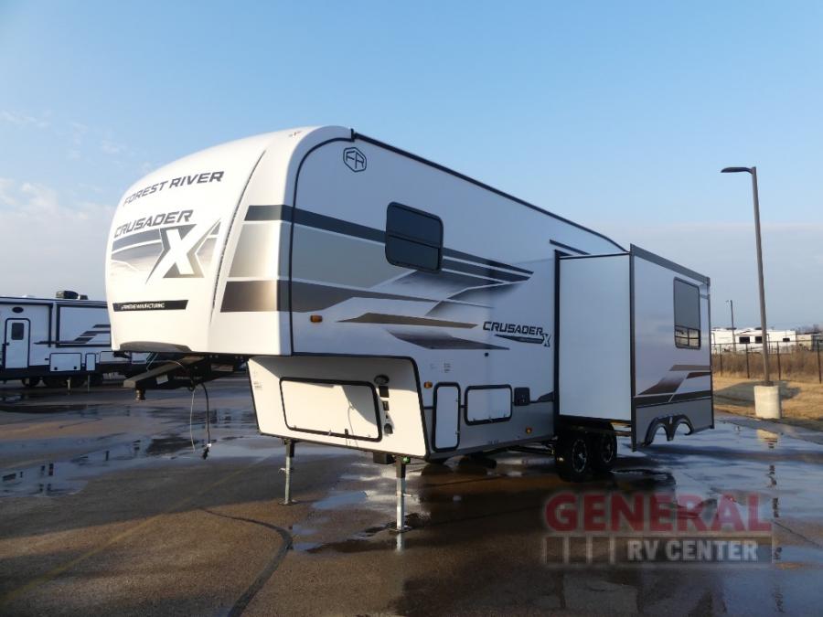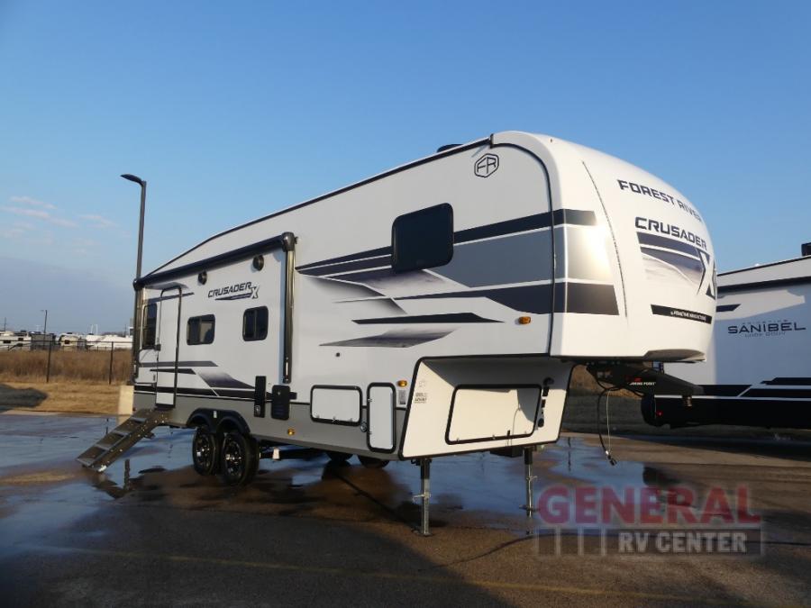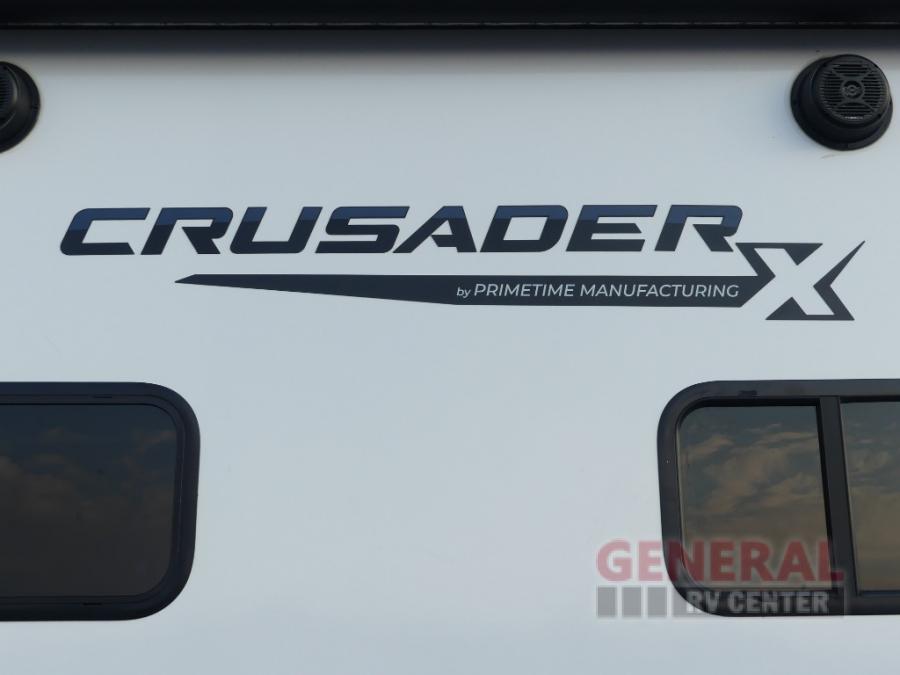 The Crusader X fifth wheels by Prime Time RV are a step above the rest and it's not hard to see why. Each model has been constructed to last with its Eternabond construction, a one-piece PVC roof, and a gel coat fiberglass exterior. The labeled universal docking center will have you set up to camp in no-time, and there is a convenient bottle opener and Doggy D-ring for your furry companions. You will feel right at home with designer countertops, designer carefree linoleum with Scotchgard technology, blackout pleated shades, and many more comforts. The Crusader X also comes standard with a 15,000 BTU A/C, a 35,000 BTU high capacity gas furnace, a tankless on-demand water heater, and the Extreme Thermal Package Plus, making your camping season year-around!