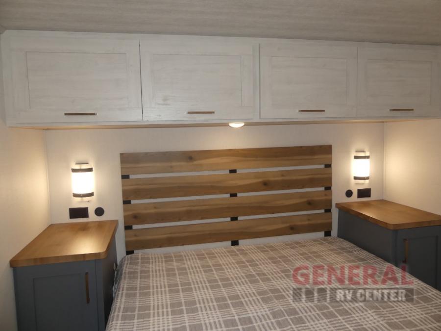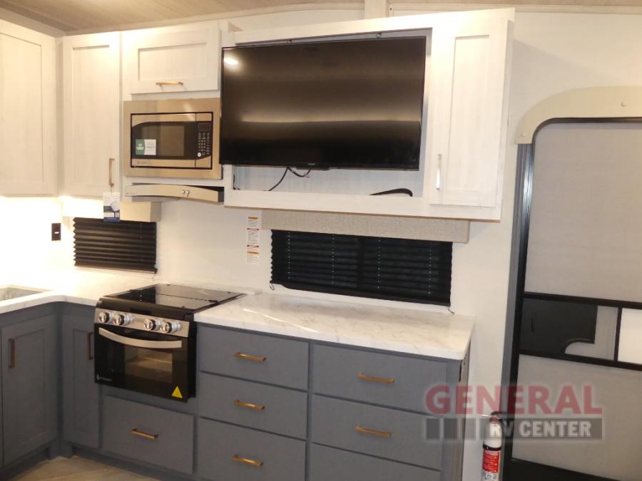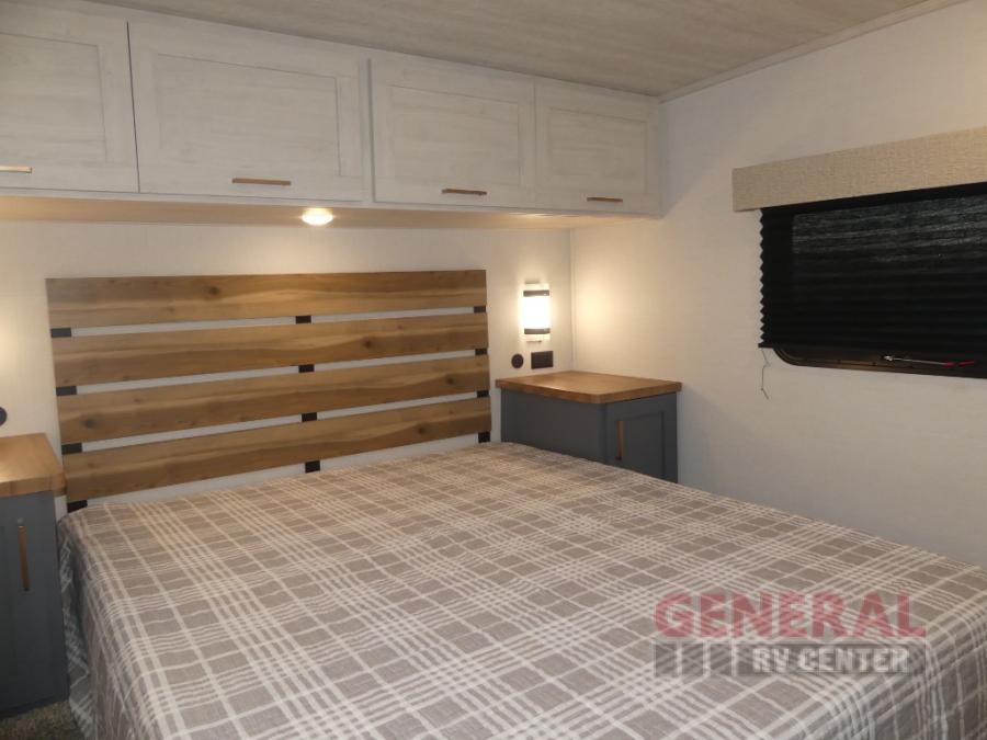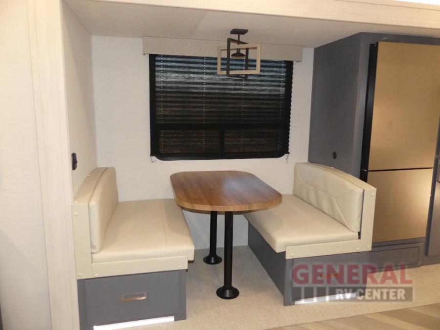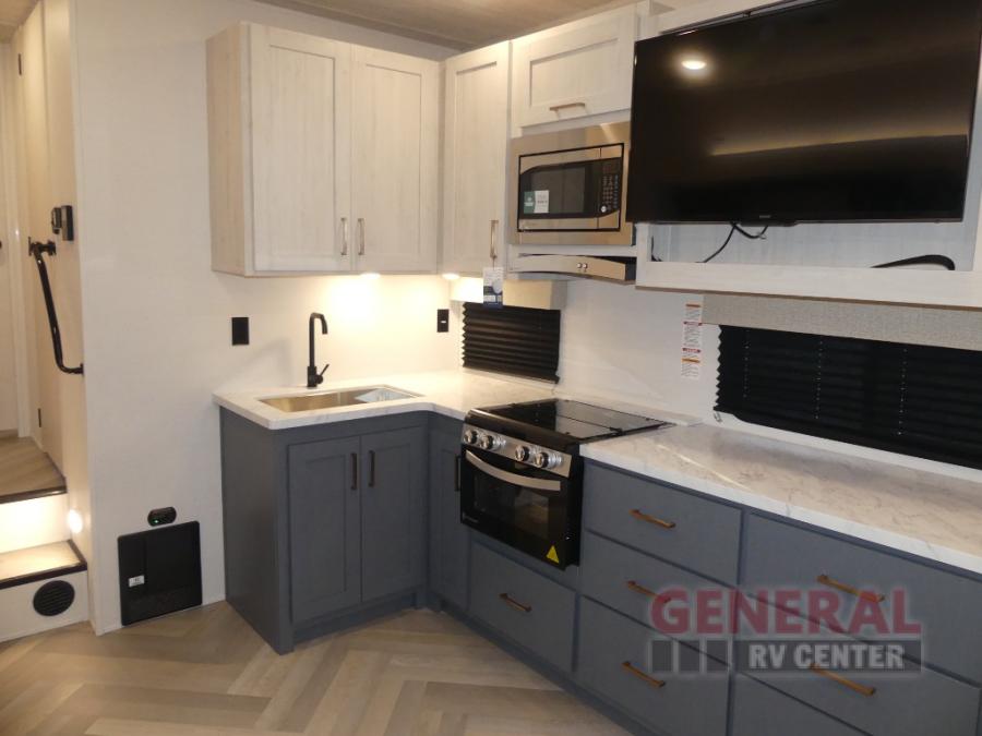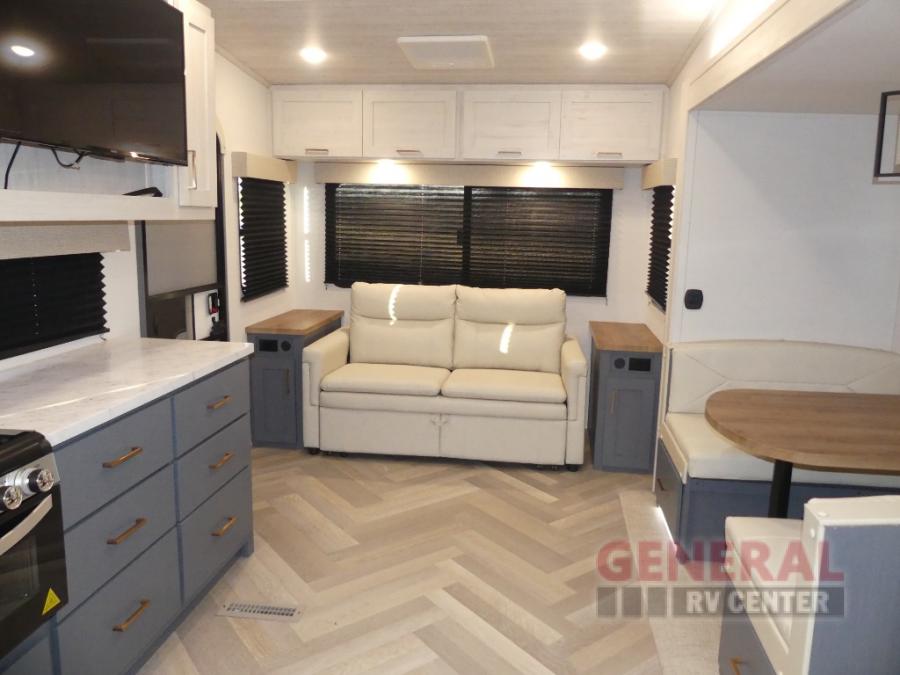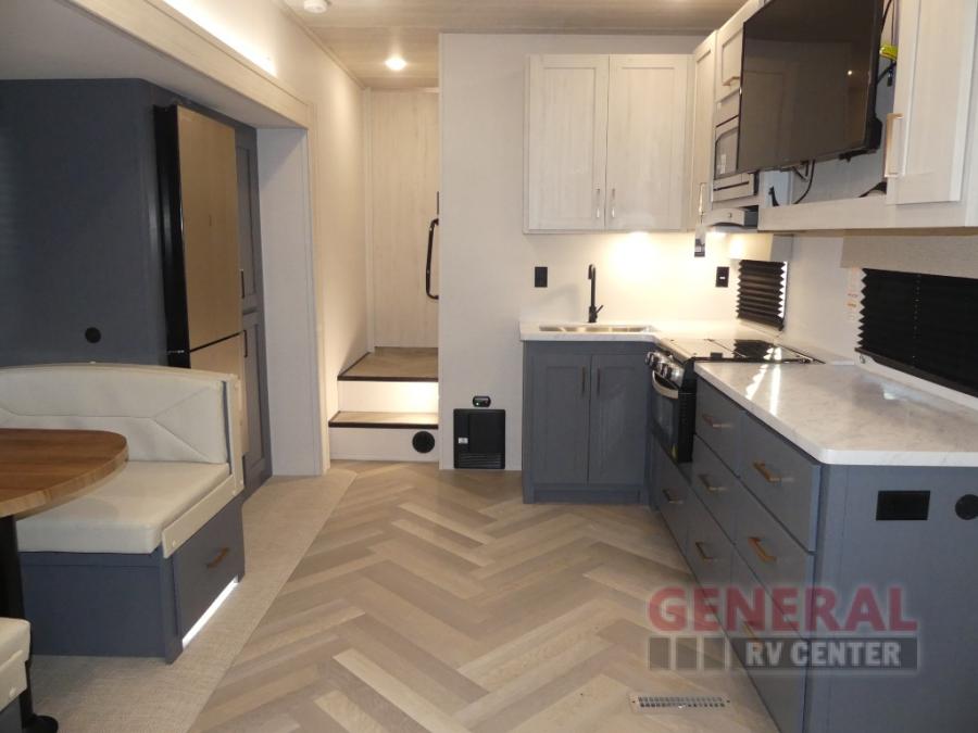 When you're ready to escape the hustle and bustle of city life, hook up this fifth wheel and head out to the woods! Once you set up the awning, you can grab the fishing poles from the pass-through storage and get some fishing in before dinner. The kitchen includes a 10.7 cu. ft. 12V refrigerator, a high-rise faucet, and designer countertops you are sure to love. You can dine at the booth dinette within the slide out, or relax on the sofa, both of which are in good view of the 40" LED Smart TV! The front private bedroom in this model will feel just like home with its walk-around queen bed, wardrobe, and dual nightstands!