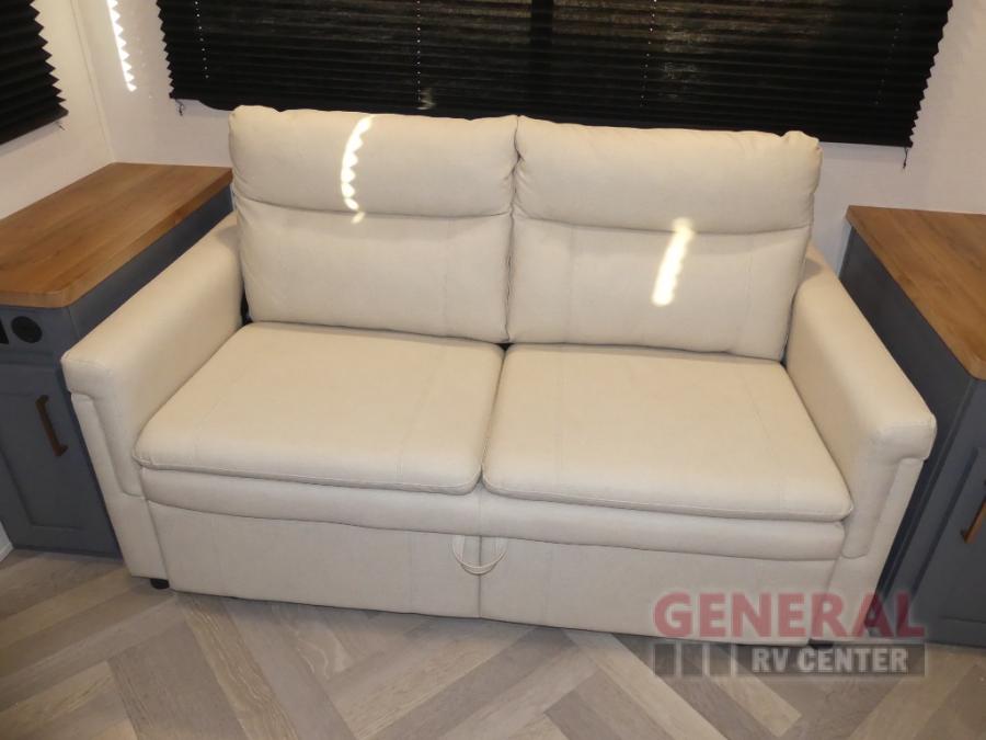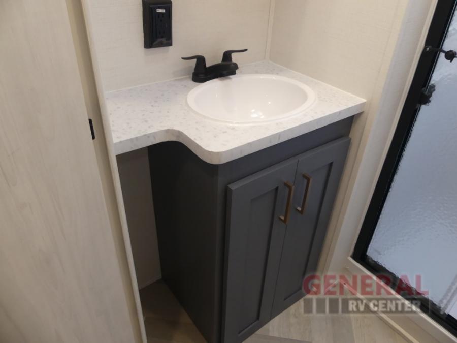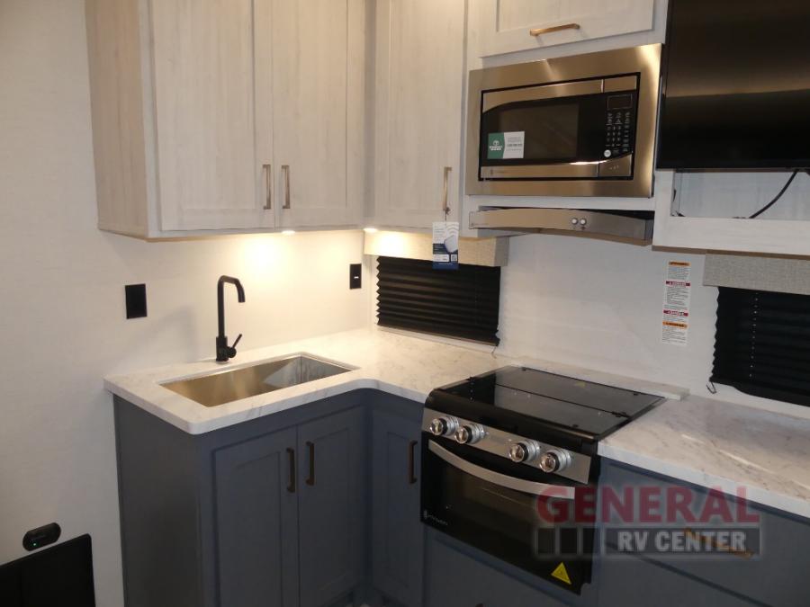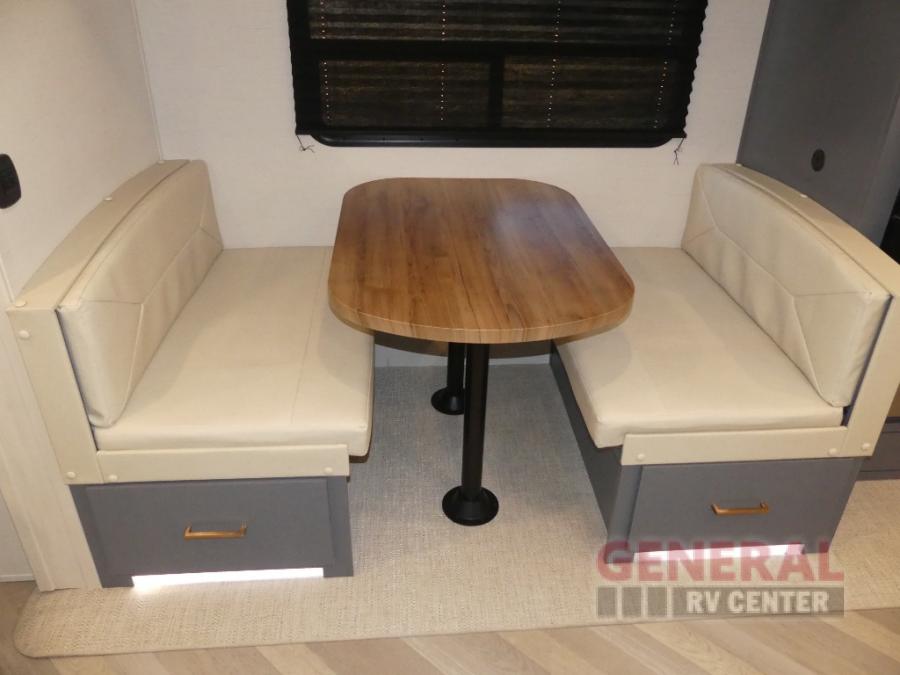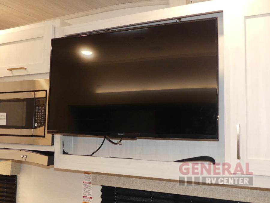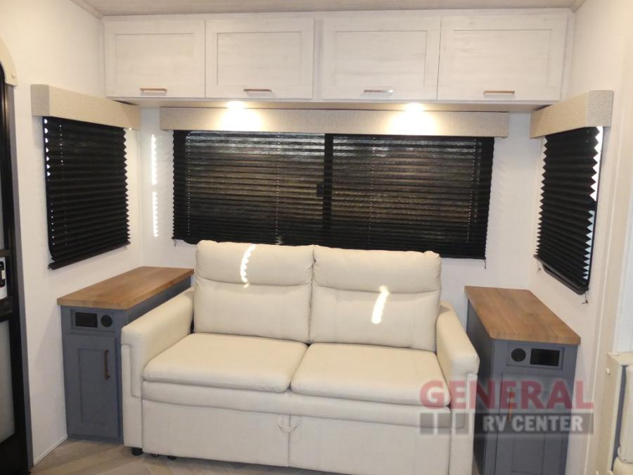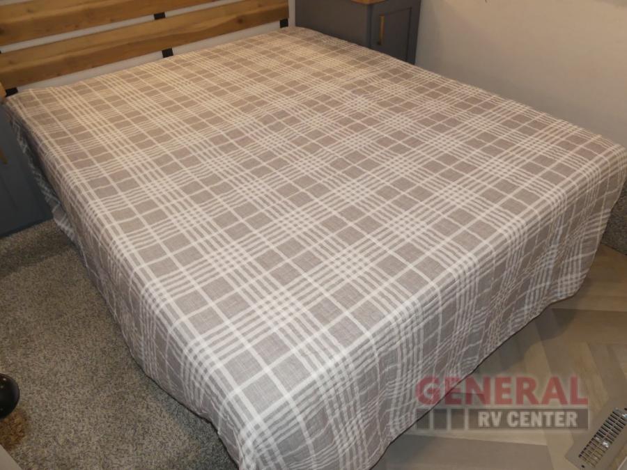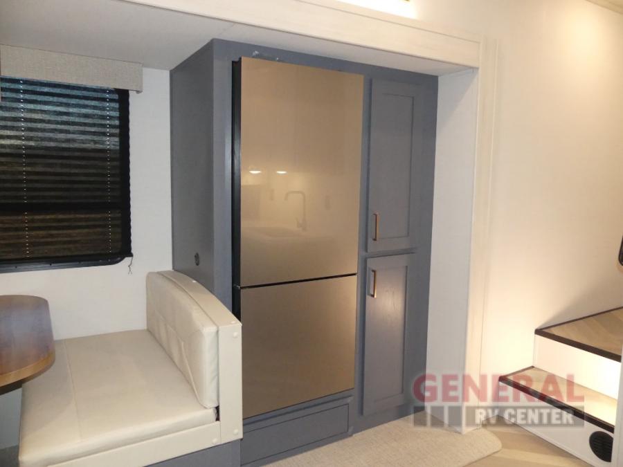 When you're ready to escape the hustle and bustle of city life, hook up this fifth wheel and head out to the woods! Once you set up the awning, you can grab the fishing poles from the pass-through storage and get some fishing in before dinner. The kitchen includes a 10.7 cu. ft. 12V refrigerator, a high-rise faucet, and designer countertops you are sure to love. You can dine at the booth dinette within the slide out, or relax on the sofa, both of which are in good view of the 40" LED Smart TV! The front private bedroom in this model will feel just like home with its walk-around queen bed, wardrobe, and dual nightstands!