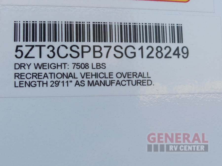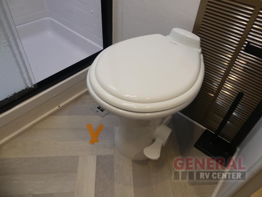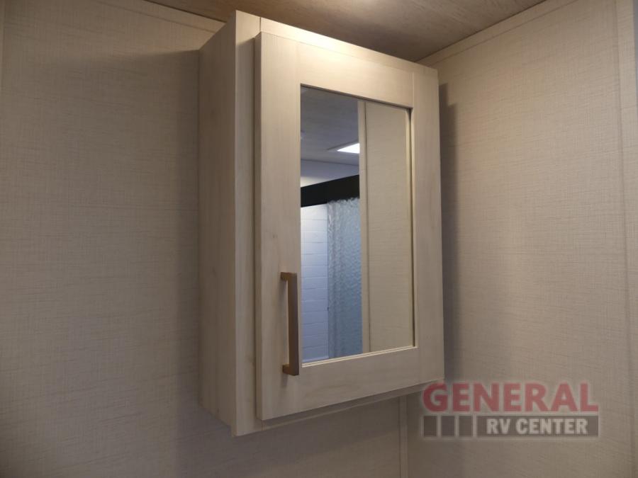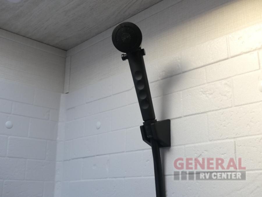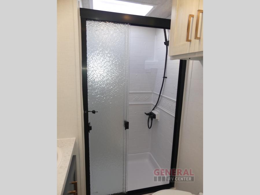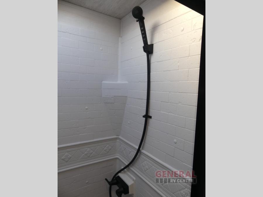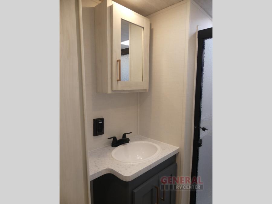 When you're ready to escape the hustle and bustle of city life, hook up this fifth wheel and head out to the woods! Once you set up the awning, you can grab the fishing poles from the pass-through storage and get some fishing in before dinner. The kitchen includes a 10.7 cu. ft. 12V refrigerator, a high-rise faucet, and designer countertops you are sure to love. You can dine at the booth dinette within the slide out, or relax on the sofa, both of which are in good view of the 40" LED Smart TV! The front private bedroom in this model will feel just like home with its walk-around queen bed, wardrobe, and dual nightstands!
