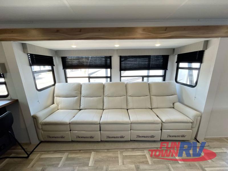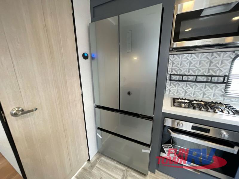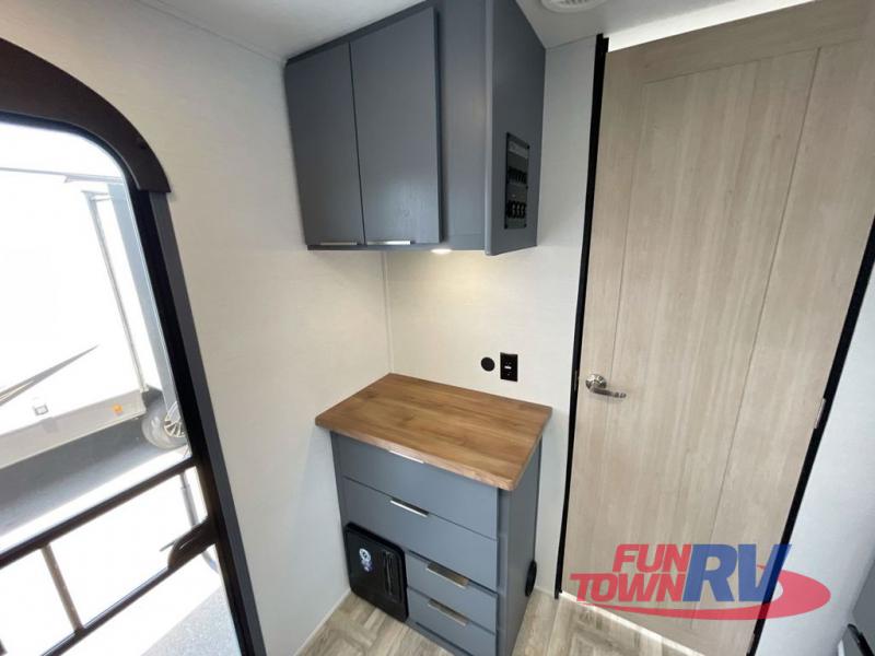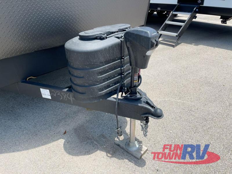 This Lacrosse travel trailer is made for entertaining! The living room is a standout with its unique bar seating at the large front window. This is perfect for eating and drinking, or use it as desk space to work from the road. The sofa sits in its own slide out for extra comfort, and has a great view of the enormous entertainment center with fireplace and 70" TV. A second fireplace warms up the rear bedroom, which also features a king bed slide for maximum floor space. There's a full bath, a well-equipped kitchen, and plenty of storage space. Invite your friends along for a great time!