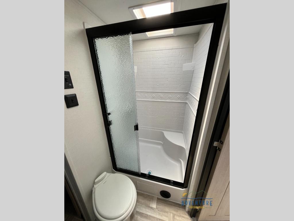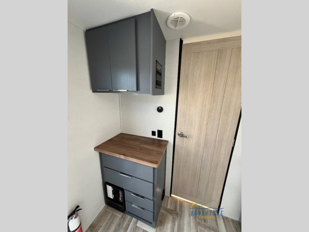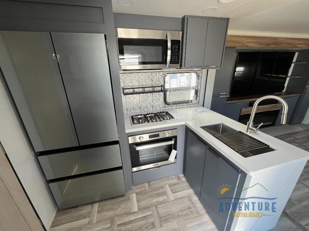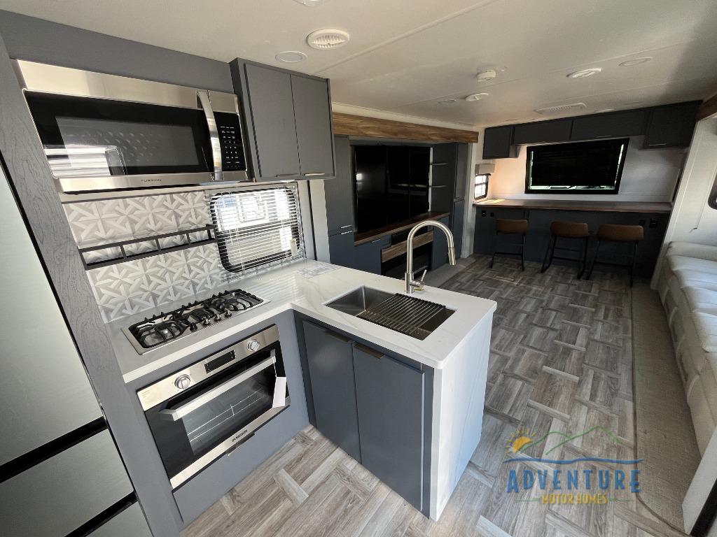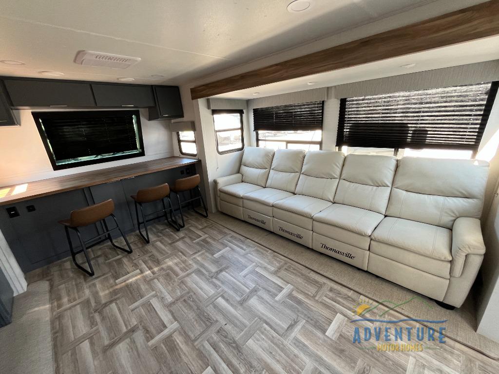 This Lacrosse travel trailer is made for entertaining! The living room is a standout with its unique bar seating at the large front window. This is perfect for eating and drinking, or use it as desk space to work from the road. The sofa sits in its own slide out for extra comfort, and has a great view of the enormous entertainment center with fireplace and 70" TV. A second fireplace warms up the rear bedroom, which also features a king bed slide for maximum floor space. There's a full bath, a well-equipped kitchen, and plenty of storage space. Invite your friends along for a great time!