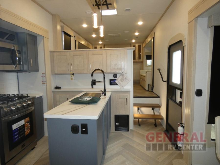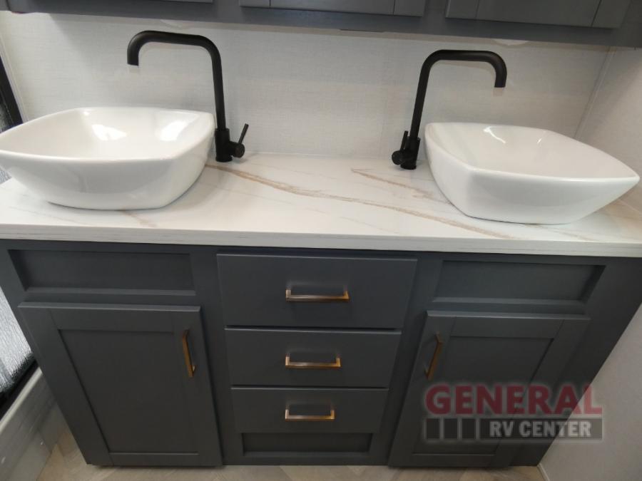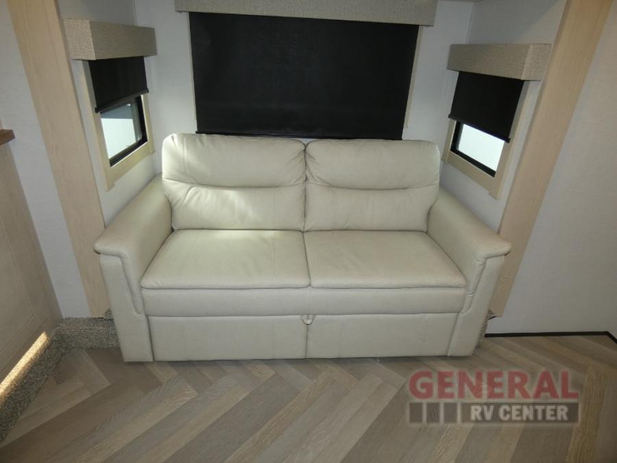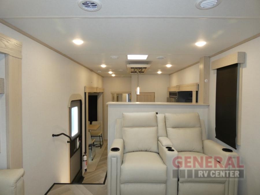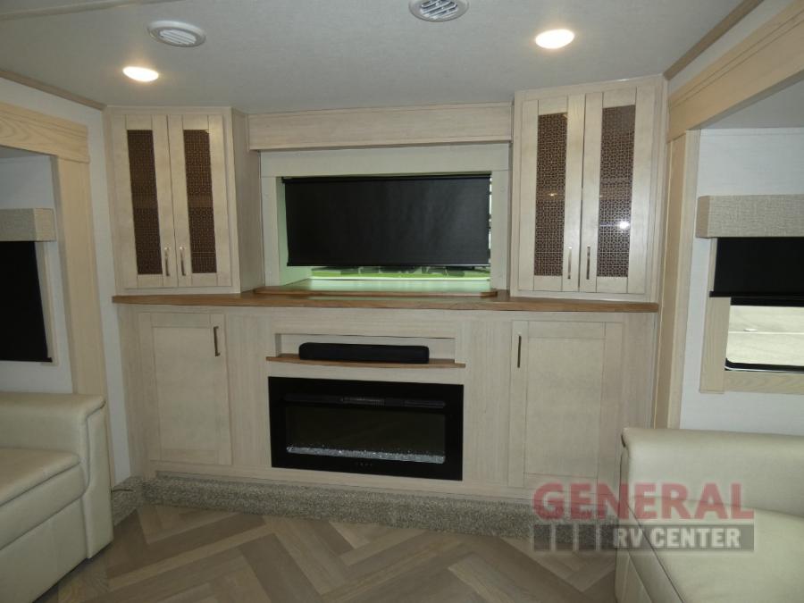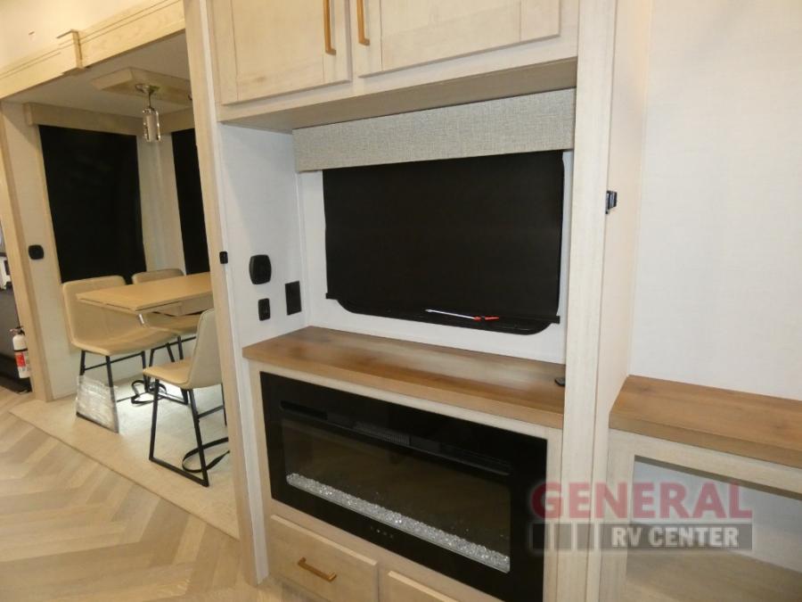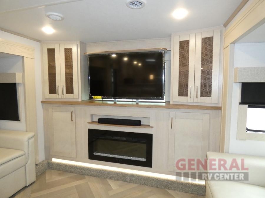 It's a clean decision with a bath and a half to take this fifth wheel on your next adventure! The front living area includes opposing EZ glide couches, 65" theater seating, and a front entertainment with a Smart LED pop up TV and fireplace for a cozy evening indoors. Prepare meals on the four burner cooktop, and leftovers can go in the 16 cu. ft. French door 12V refrigerator. You and your spouse will love the master suite that includes a king bed slide, plenty of storage space, and an entrance into the full rear bathroom with a dual sink vanity. There is even a linen closet with washer and dryer prep if you want to add those appliances!