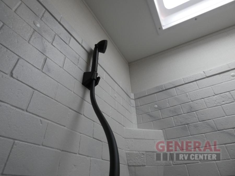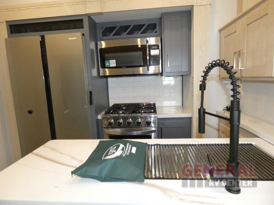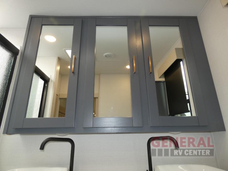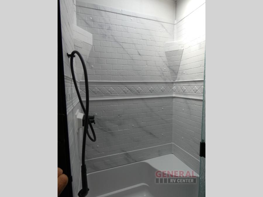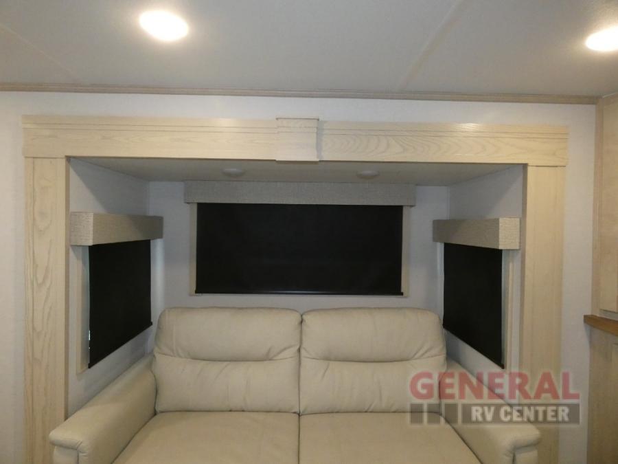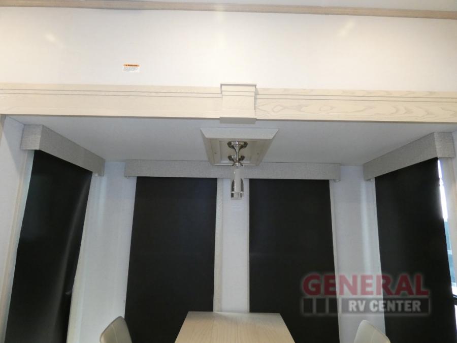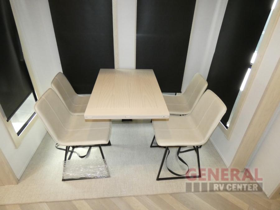 It's a clean decision with a bath and a half to take this fifth wheel on your next adventure! The front living area includes opposing EZ glide couches, 65" theater seating, and a front entertainment with a Smart LED pop up TV and fireplace for a cozy evening indoors. Prepare meals on the four burner cooktop, and leftovers can go in the 16 cu. ft. French door 12V refrigerator. You and your spouse will love the master suite that includes a king bed slide, plenty of storage space, and an entrance into the full rear bathroom with a dual sink vanity. There is even a linen closet with washer and dryer prep if you want to add those appliances!