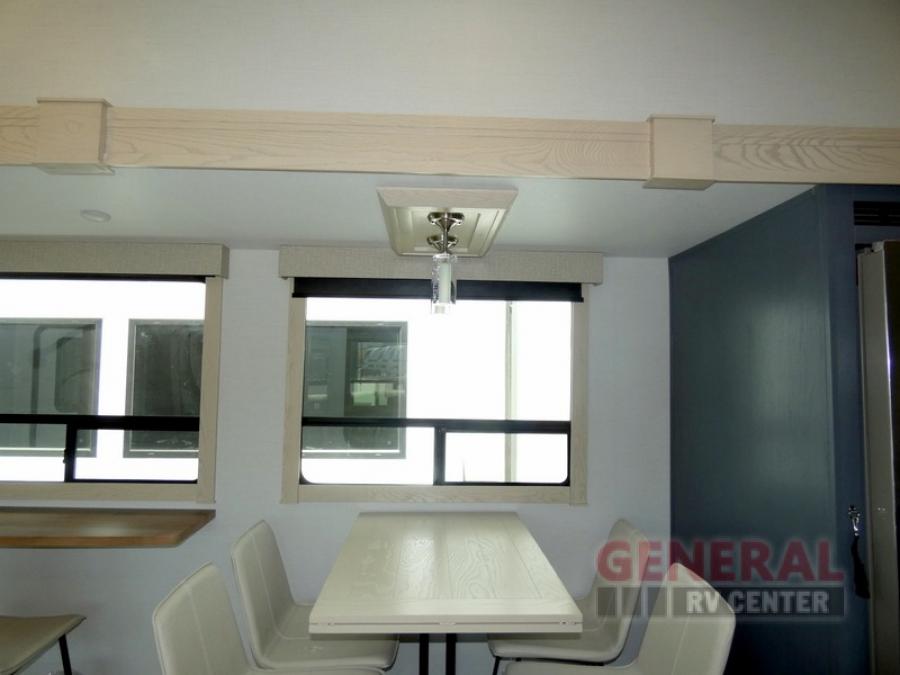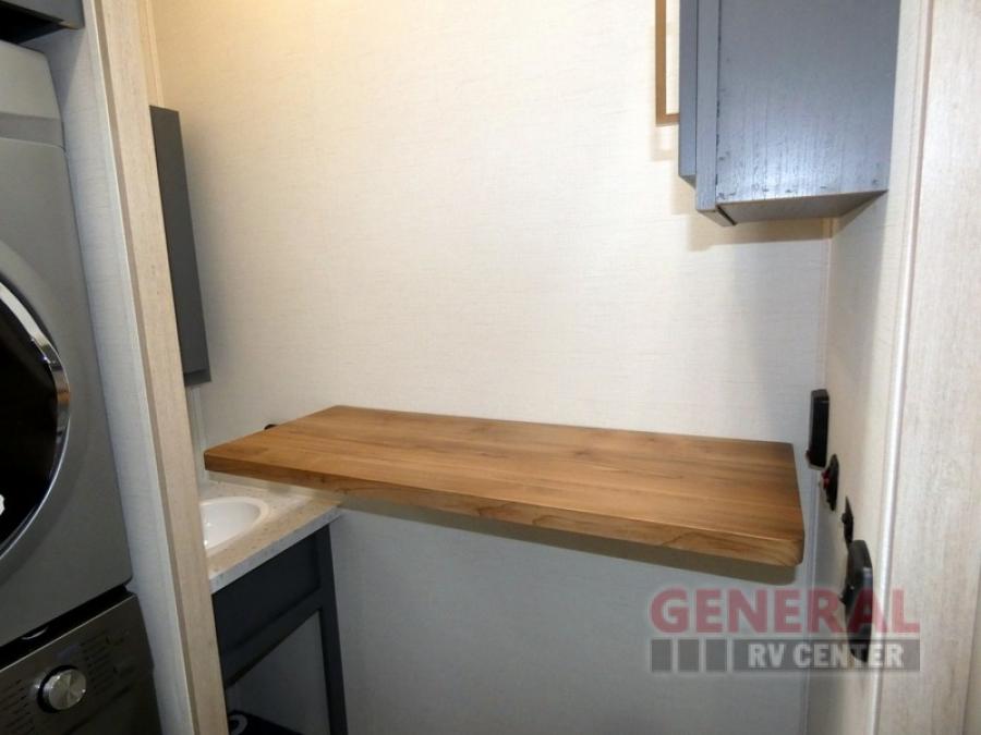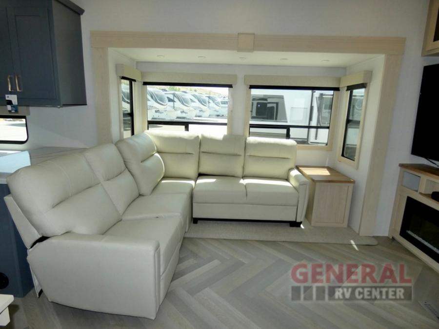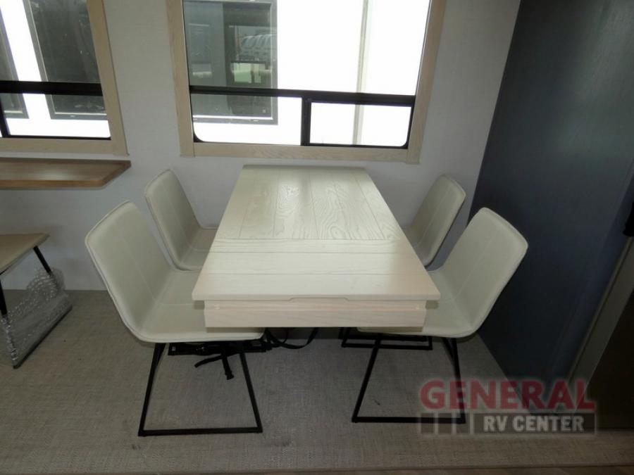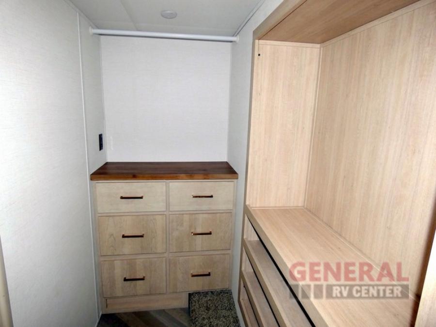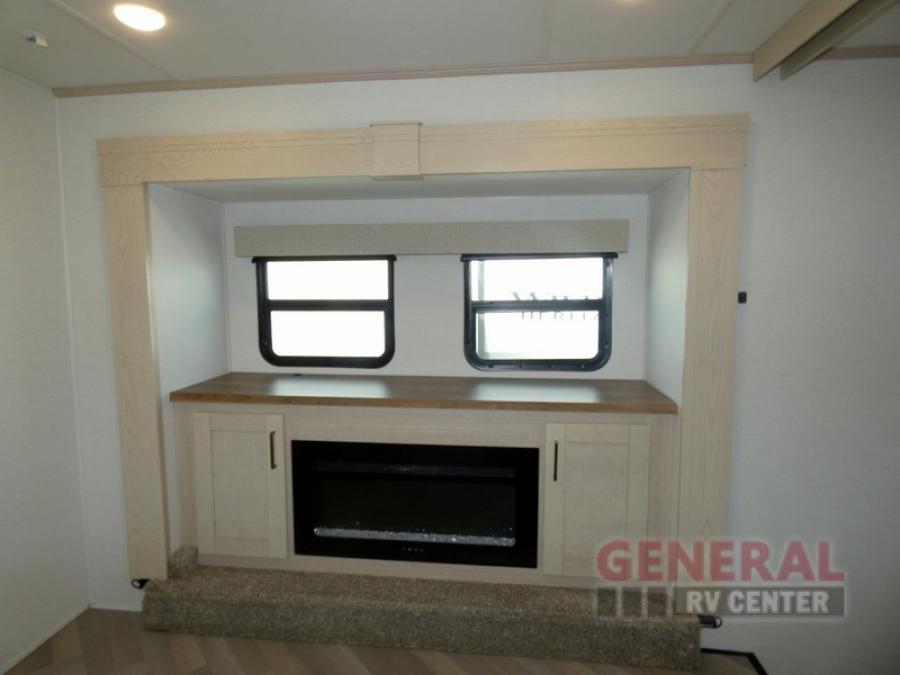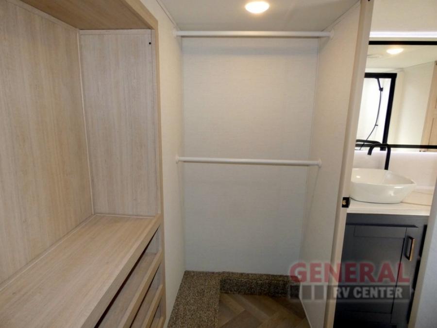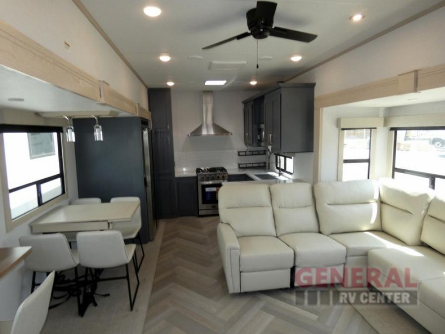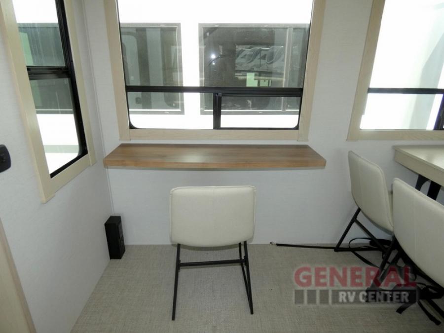 It will be so easy to enjoy extended stays or weekend trips in this spacious fifth wheel. You will love waking up in your private master bedroom that includes a king bed slide, bedroom wardrobe, and 40" TV. The front full bath includes dual bath sinks for added convenience and a large walk-in closet with clothes bars. If you have any guests stay over, they can sleep on the L-shaped easy glide sofa with a theater seat on one end. There is also a free-standing dinette with four chairs and a desk with a chair if you need to get some work done. The chef of your group will love the rear kitchen with a u-shaped counter, two kitchen pantries, and a 16 cu. ft. refrigerator for food storage. This model also includes a mid-coach half bath with washer and dryer prep if you choose to add those appliances!