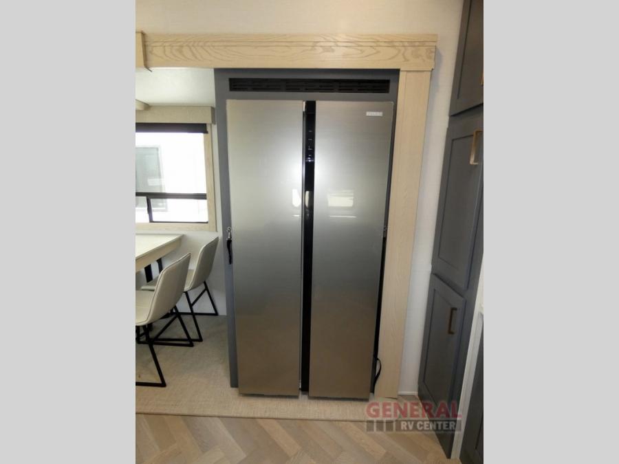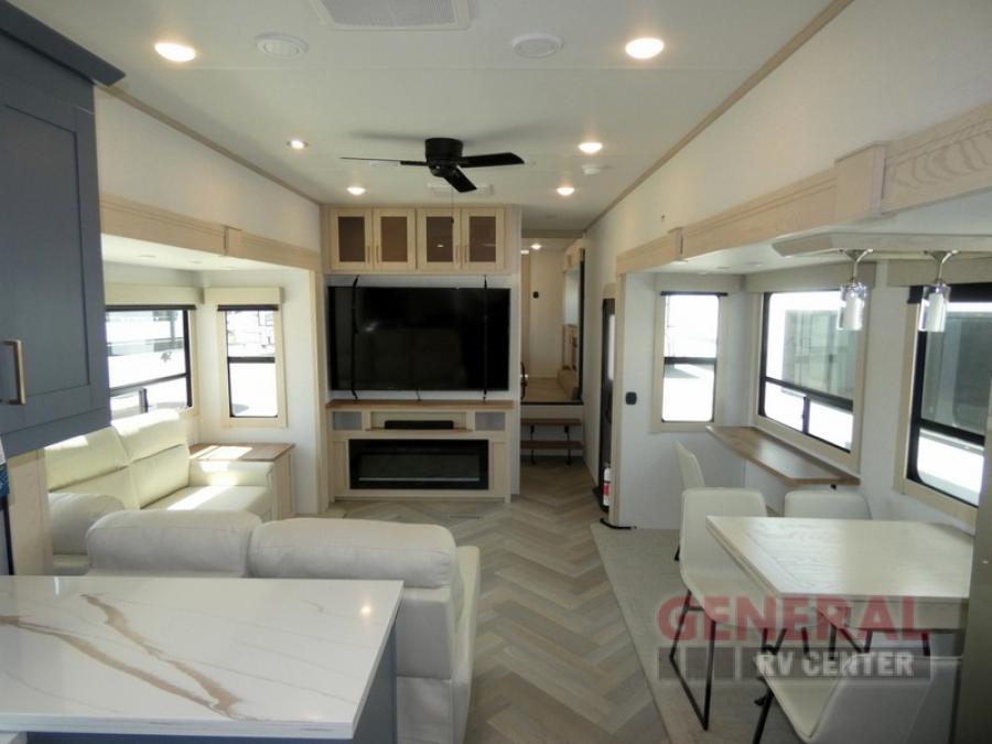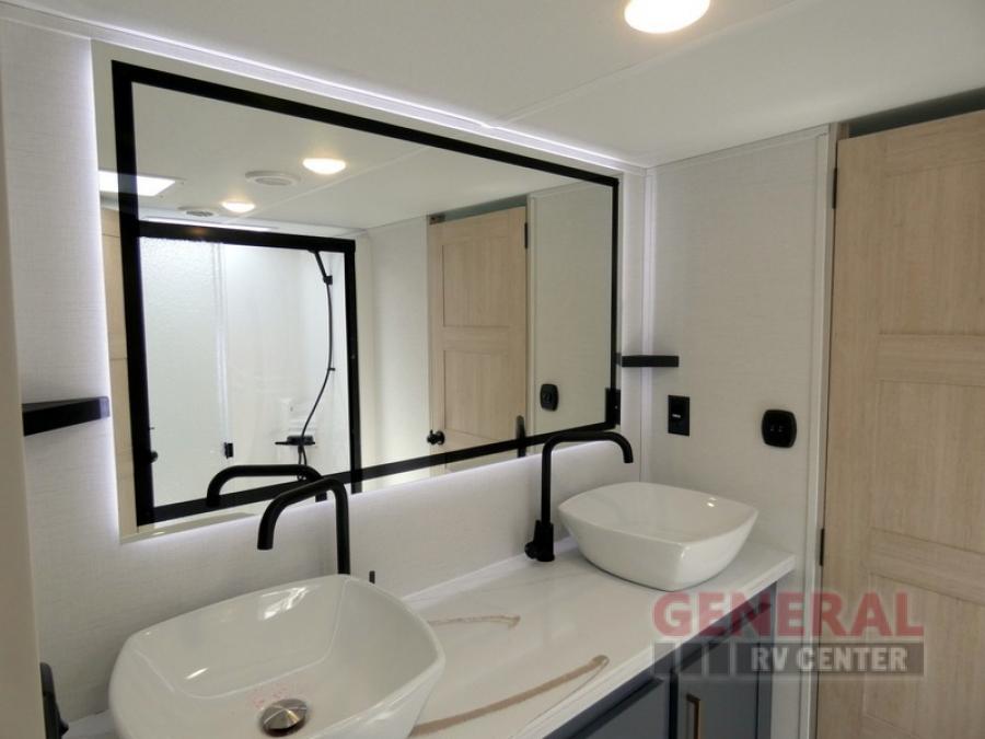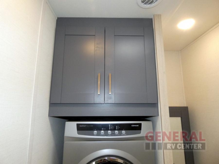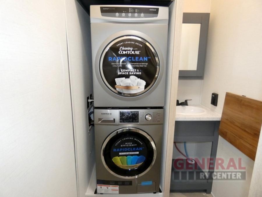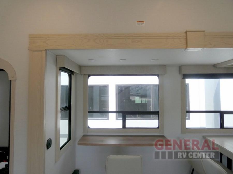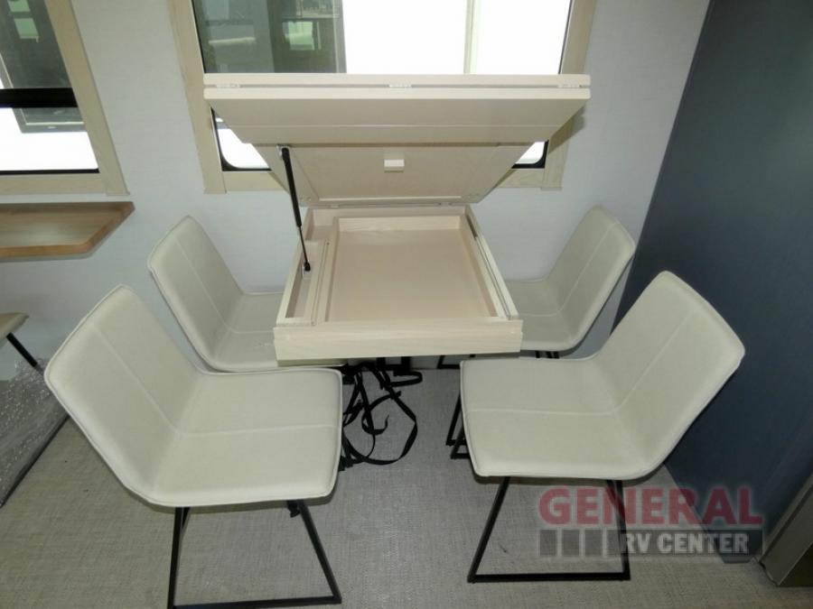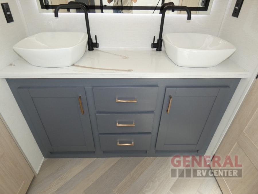 It will be so easy to enjoy extended stays or weekend trips in this spacious fifth wheel. You will love waking up in your private master bedroom that includes a king bed slide, bedroom wardrobe, and 40" TV. The front full bath includes dual bath sinks for added convenience and a large walk-in closet with clothes bars. If you have any guests stay over, they can sleep on the L-shaped easy glide sofa with a theater seat on one end. There is also a free-standing dinette with four chairs and a desk with a chair if you need to get some work done. The chef of your group will love the rear kitchen with a u-shaped counter, two kitchen pantries, and a 16 cu. ft. refrigerator for food storage. This model also includes a mid-coach half bath with washer and dryer prep if you choose to add those appliances!