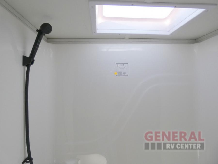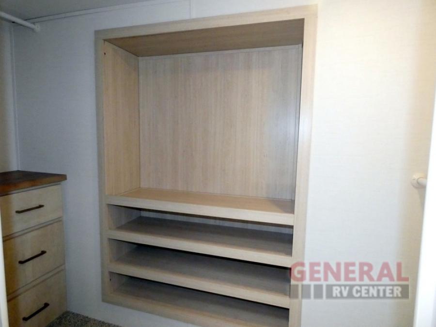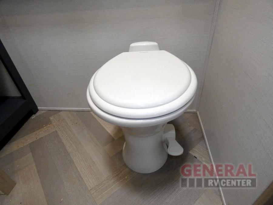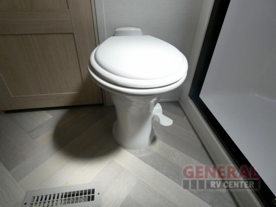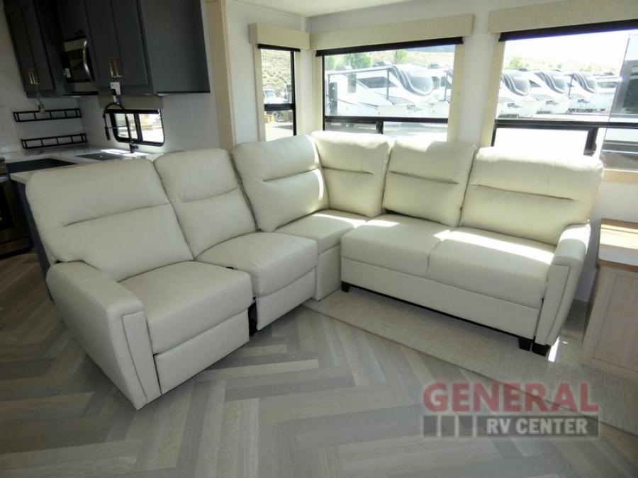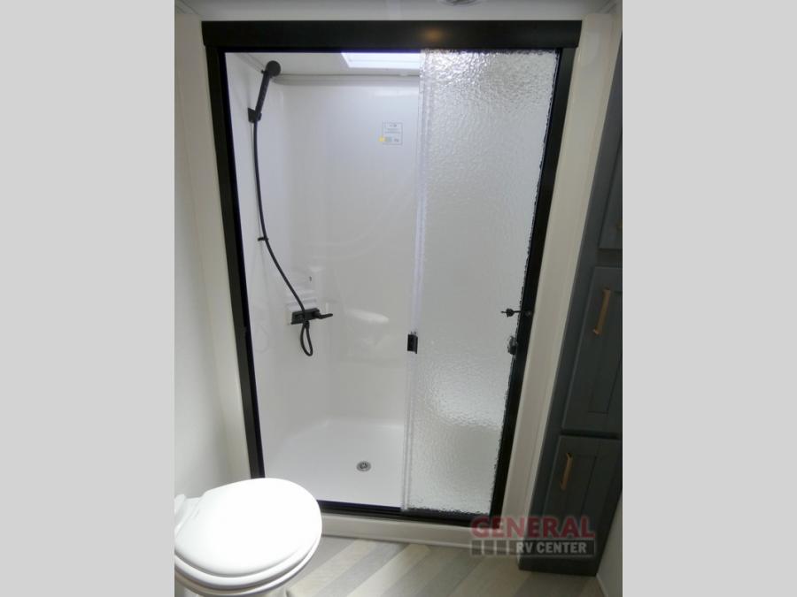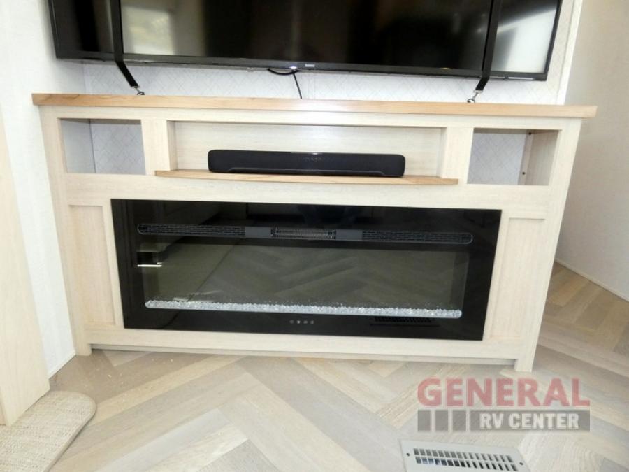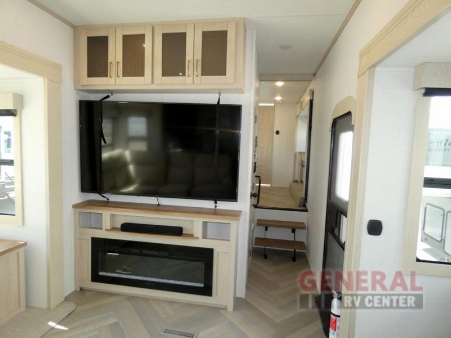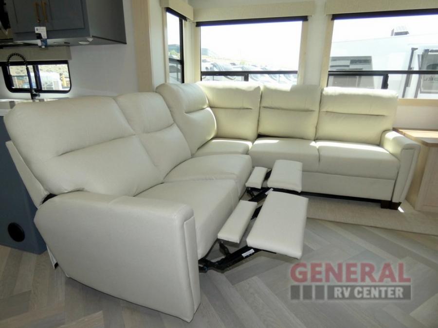 It will be so easy to enjoy extended stays or weekend trips in this spacious fifth wheel. You will love waking up in your private master bedroom that includes a king bed slide, bedroom wardrobe, and 40" TV. The front full bath includes dual bath sinks for added convenience and a large walk-in closet with clothes bars. If you have any guests stay over, they can sleep on the L-shaped easy glide sofa with a theater seat on one end. There is also a free-standing dinette with four chairs and a desk with a chair if you need to get some work done. The chef of your group will love the rear kitchen with a u-shaped counter, two kitchen pantries, and a 16 cu. ft. refrigerator for food storage. This model also includes a mid-coach half bath with washer and dryer prep if you choose to add those appliances!