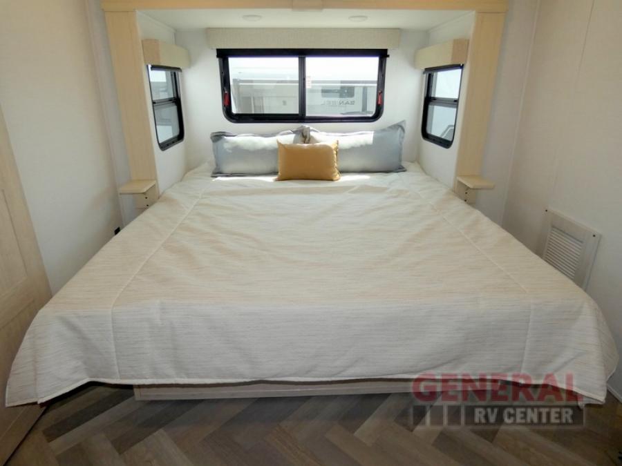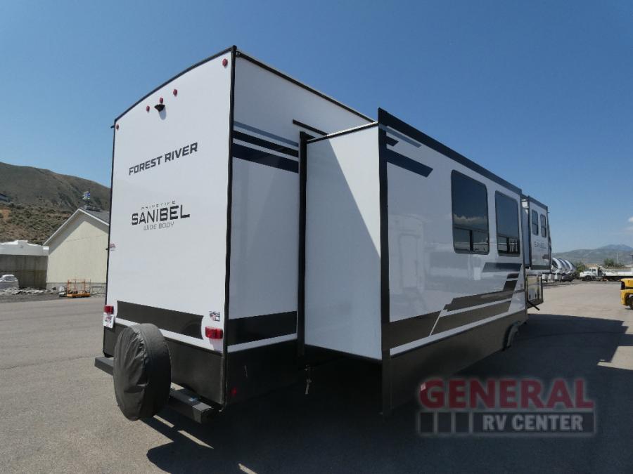 More luxury and more value is what you will find in each one of these Prime Time RV Sanibel fifth wheels! The Extreme Thermal package allows you to extend your camping season by including high density block foam insulation throughout, heated basement storage, and 12V heating pads on tanks. You can keep the party going with the electric awning with LED lighting and high-output exterior speaker, plus there is a Doggy D-Ring and bottle opener for added convenience. Each model also includes Dexter E-Z FLEX rubberized suspension to provide smooth towing on tougher roads, thick insulated pass-through baggage doors, and a high gloss gel coated exterior fiberglass for a more sleek look. Inside, you will enjoy residentially inspired kitchen appliances, real wood cabinet doors, designer Carefree linoleum with Scotchgard Technology, and many more luxurious features!