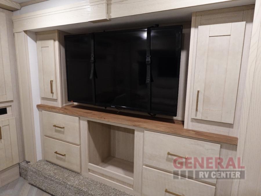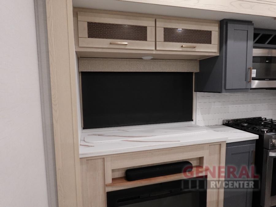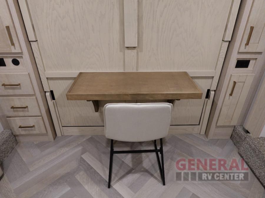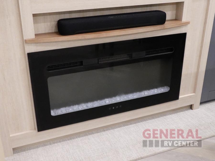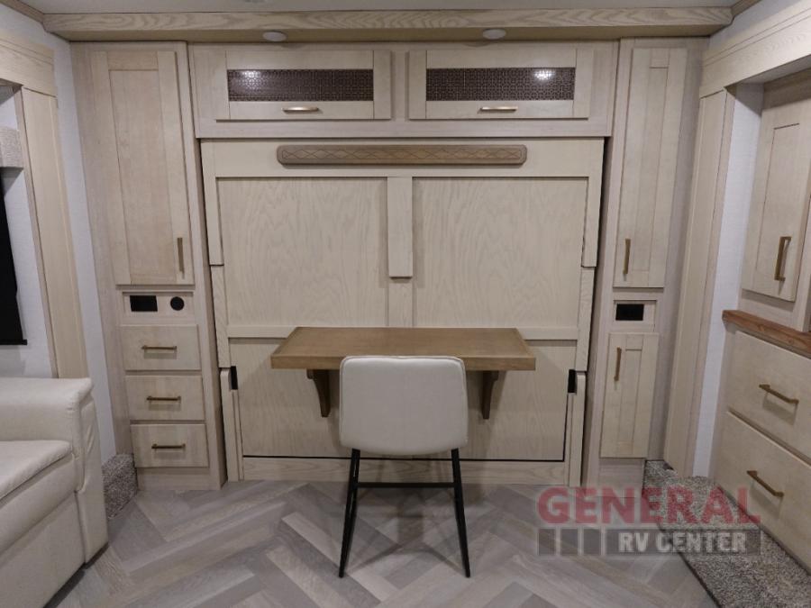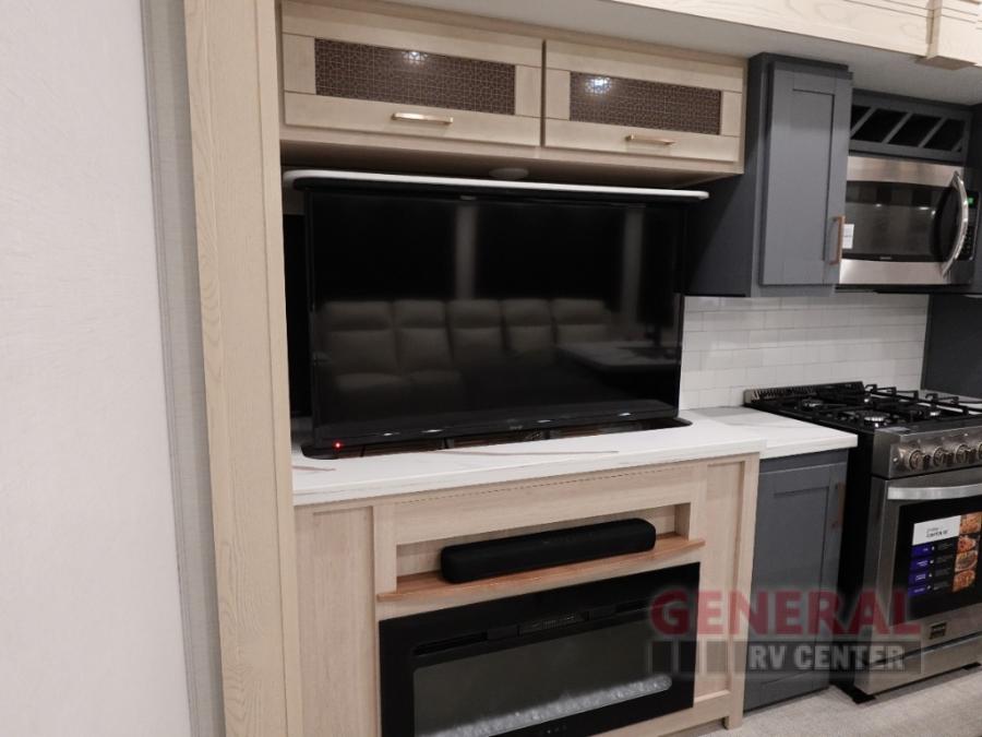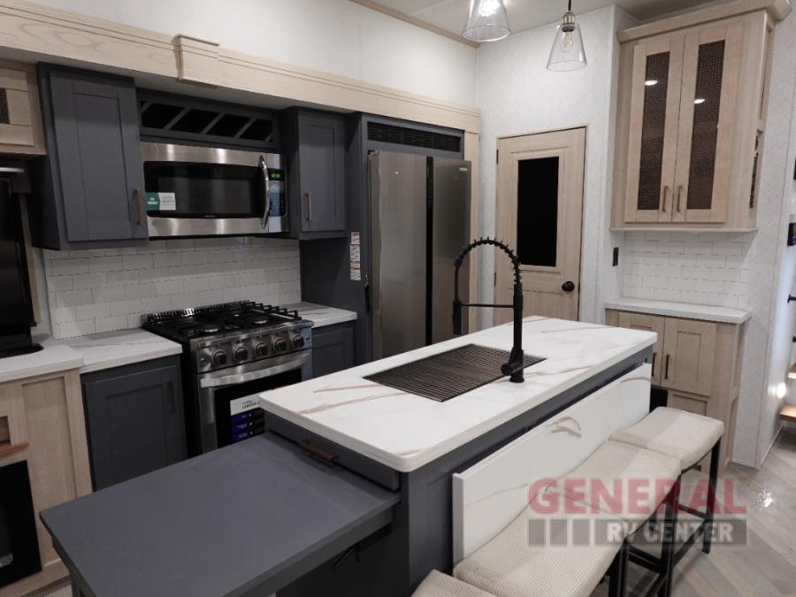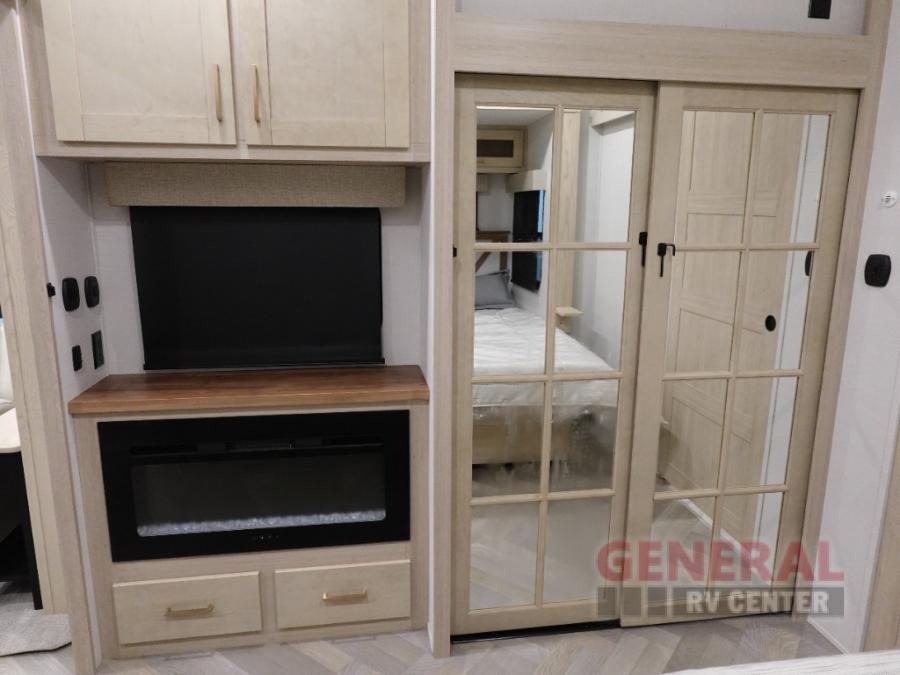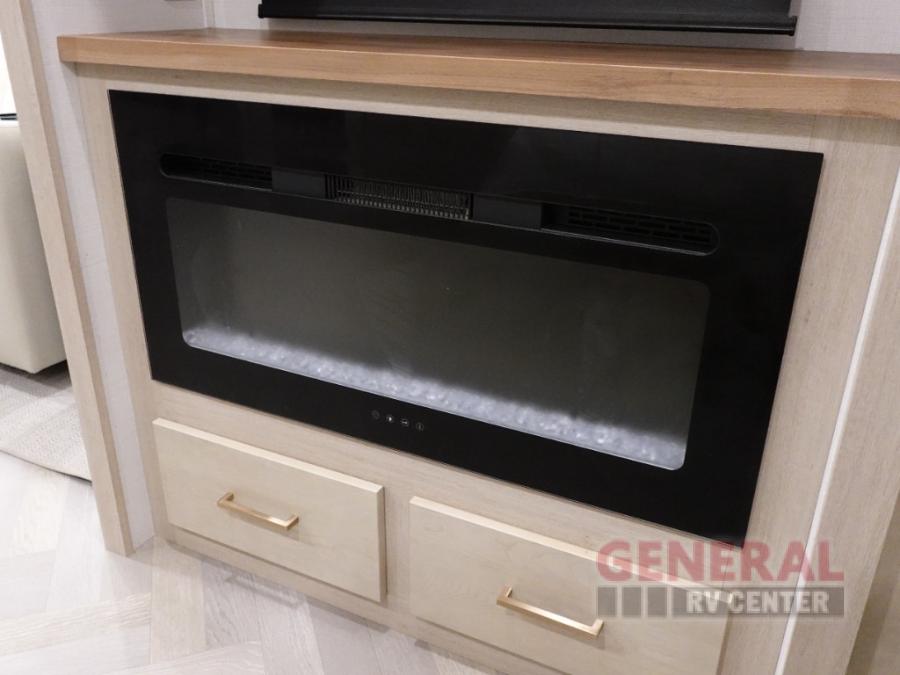 This fifth wheel is sure to wow you! You can easily invite your close neighbor friends along since there is a front den/bedroom that includes dual opposing slides, a Murphy bed/desk, a tri-fold sofa and a wardrobe, plus a full bath! You'll have the master suite towards the back all to yourselves, and here you'll find a king bed slide out, a bedroom fireplace, and a full rear bath, complete with dual bath sinks. There is even a linen closet with washer and dryer prep if you want the option to go full-time! In the morning, everyone can meet in the combined kitchen and living area as the chef whips up breakfast on the four burner cooktop. There is a gourmet island with a flip-up counter and a hidden dinette to provide everyone space to gather around. And you'll love the large sofa with pop-up chargers across from the hidden Smart TV and fireplace. Don't let this fifth wheel slip away!